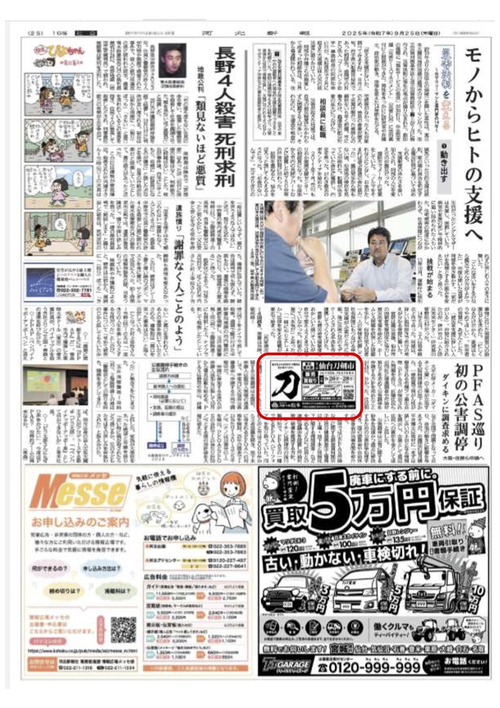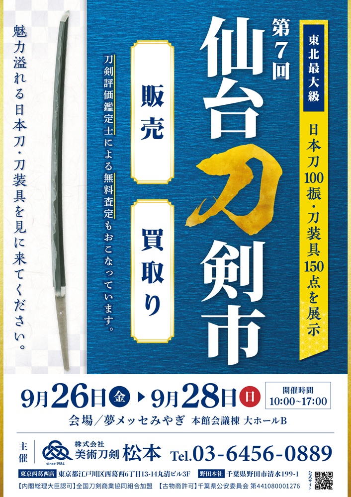 The 7th Sendai Token Ichi/Sword Fair was held at Yume Messe Miyagi for three days starting on Friday, September 26th. Prior to the event, I visited the special exhibition "The Soul of the Warrior - The Beauty of Ayasugi-hada and Local Swordsmiths" at the Tome Kaikokan Museum in northern Miyagi prefecture. Designed by the renowned Kengo Kuma, the museum's modern design blends seamlessly with nature, stimulating curiosity. This will likely increase opportunities for local sword enthusiasts to display their collections, further fueling their passion for collecting. The main event, the Token Ichi/exhibition and sale, was a great success, with many visitors, primarily from the Miyagi Prefecture branch of the NBTHK. We learned a lot about local swords, and we were deeply impressed by the passion for researching Sendai domain swordsmiths and their pride for local swords. All staff felt a sense of responsibility that we need to exhibit attractive swords to them.