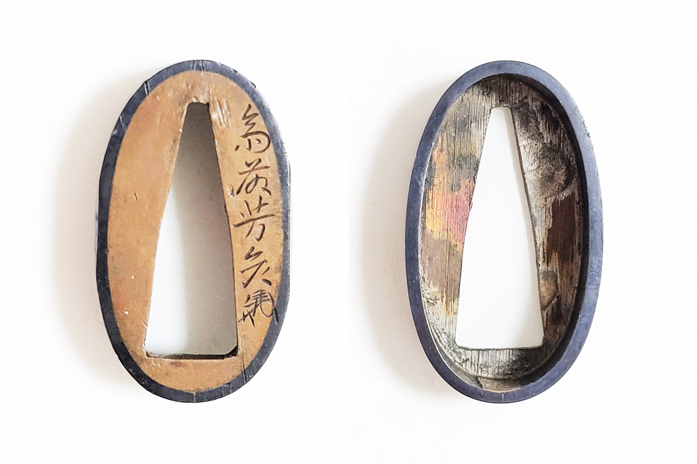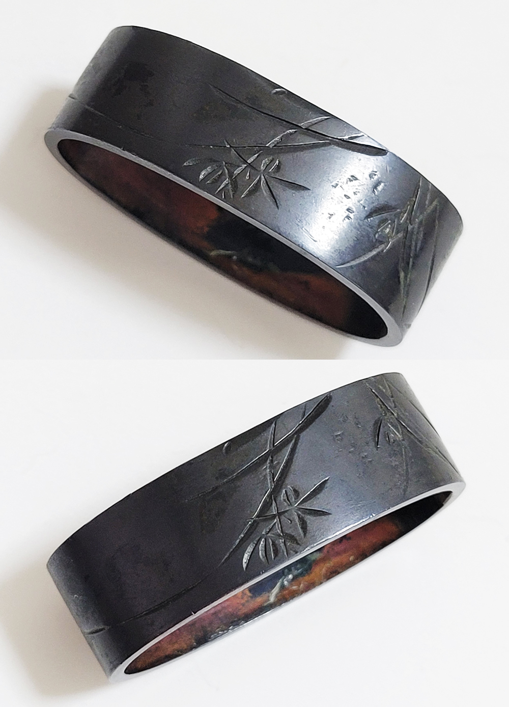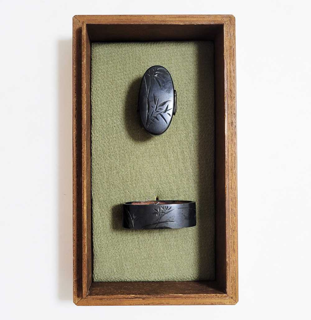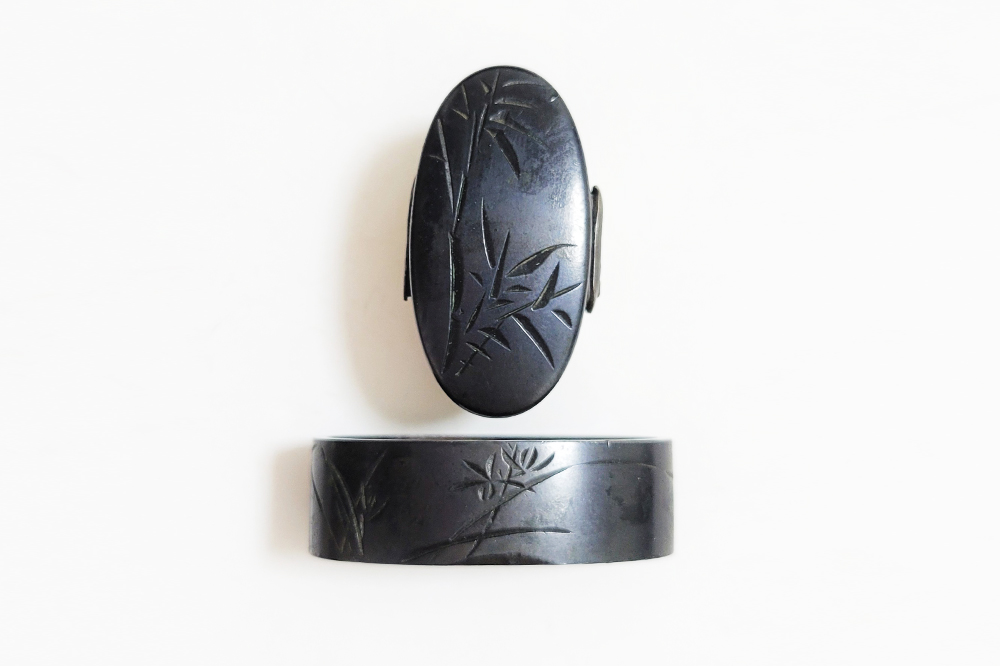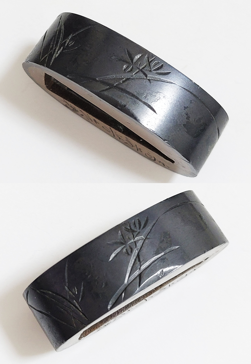 | Bamboos, which grow straight and stay green even in winter, represent growth and longevity, while orchids, which have a pure and noble fragrance, represent dignity and nobility. Therefore, the Bamboo and Orchid theme was favored by literati artists. This fuchi-kashira depicts an orchid on the fuchi of a shakudo surface and a bamboo on the kashira, carved with katakiri-bori and ke-bori techniques. The metal craftsman, Saito Yoshihiko [斎藤芳彦], was born in Bunka 3 (1806). He trained at the Sonobe school [園部家] in Edo, a branch of the Goto school, and returned to his hometown of Shibata in Echigo Province to become a oficial worker for the Shibata domain. It has passed the Hozon shinsa In 2001. |