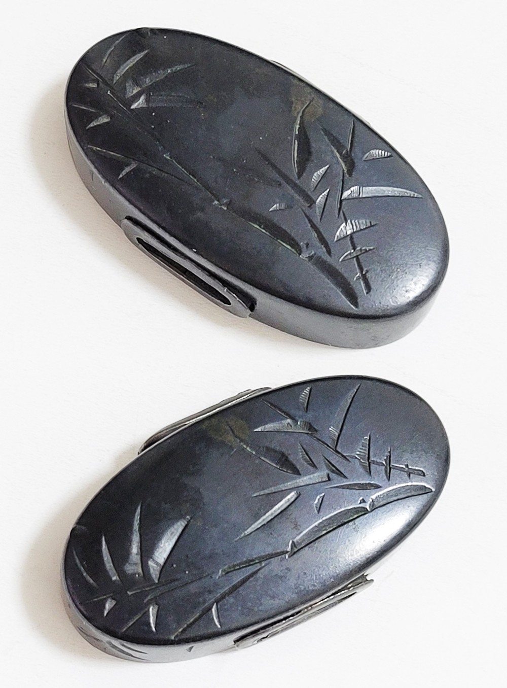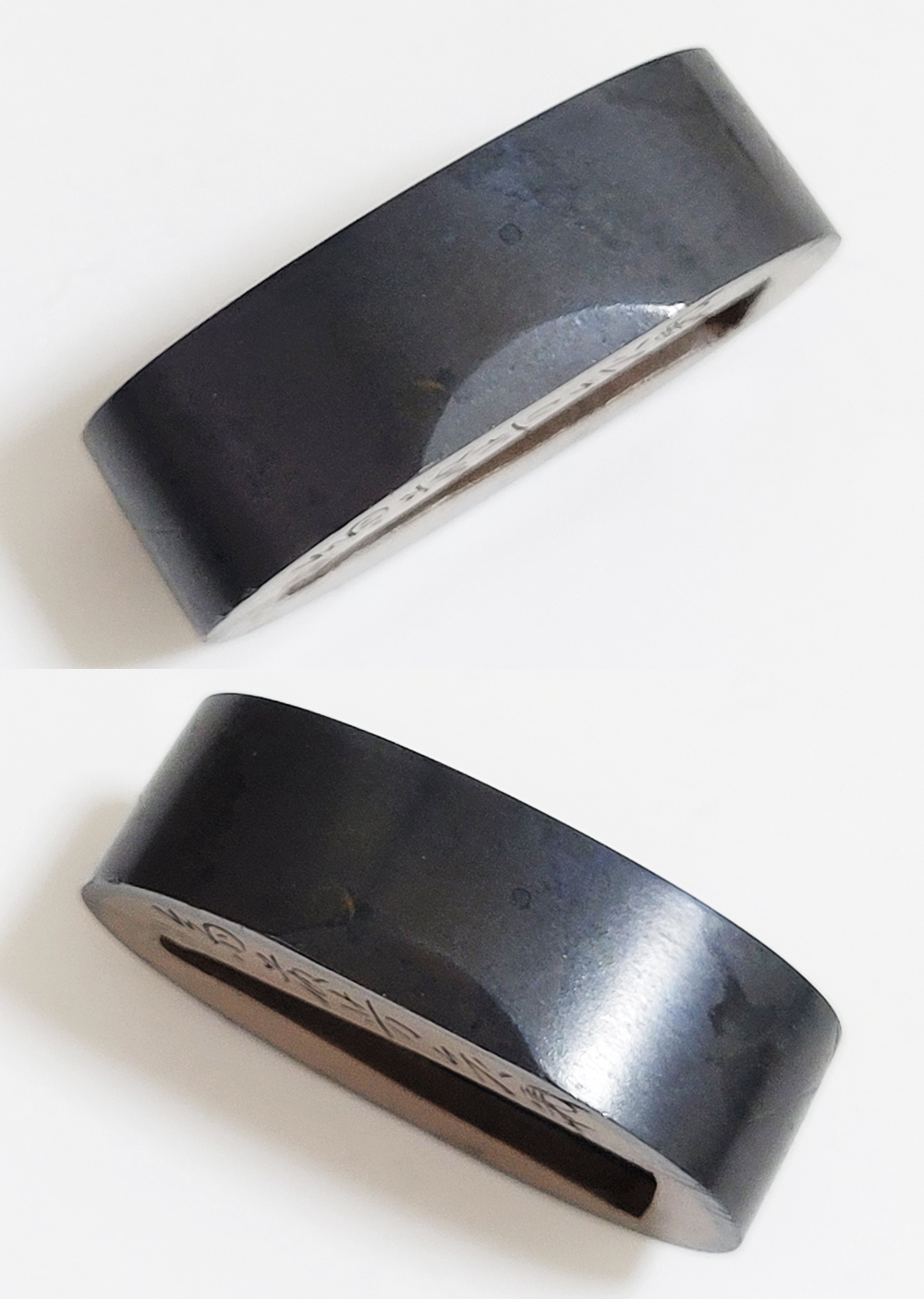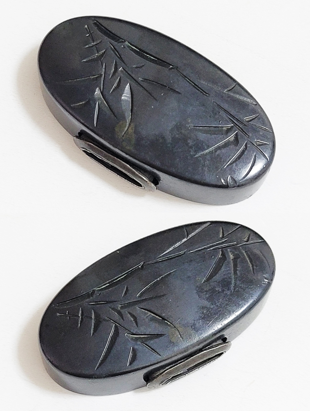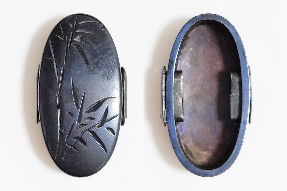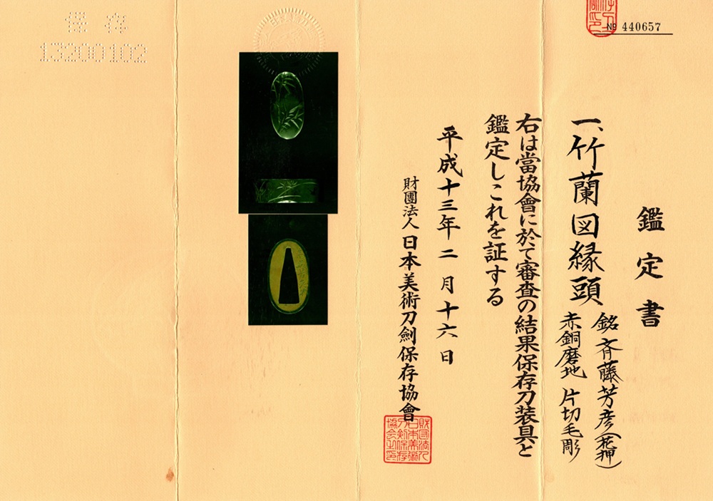 | Bamboos, which grow straight and stay green even in winter, represent growth and longevity, while orchids, which have a pure and noble fragrance, represent dignity and nobility. Therefore, the Bamboo and Orchid theme was favored by literati artists. This fuchi-kashira depicts an orchid on the fuchi of a shakudo surface and a bamboo on the kashira, carved with katakiri-bori and ke-bori techniques. The metal craftsman, Saito Yoshihiko [斎藤芳彦], was born in Bunka 3 (1806). He trained at the Sonobe school [園部家] in Edo, a branch of the Goto school, and returned to his hometown of Shibata in Echigo Province to become a oficial worker for the Shibata domain. It has passed the Hozon shinsa In 2001. |
