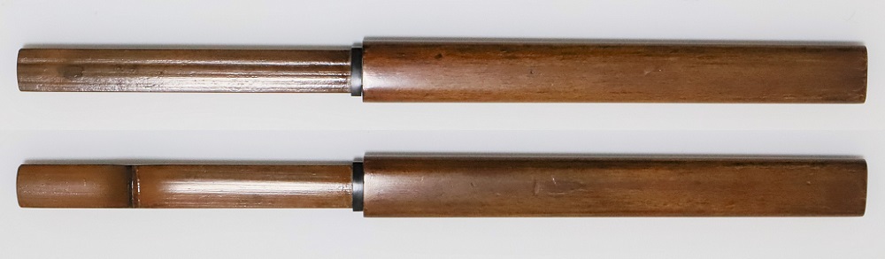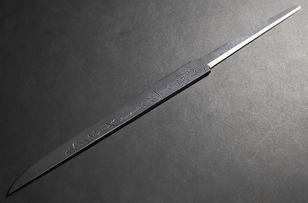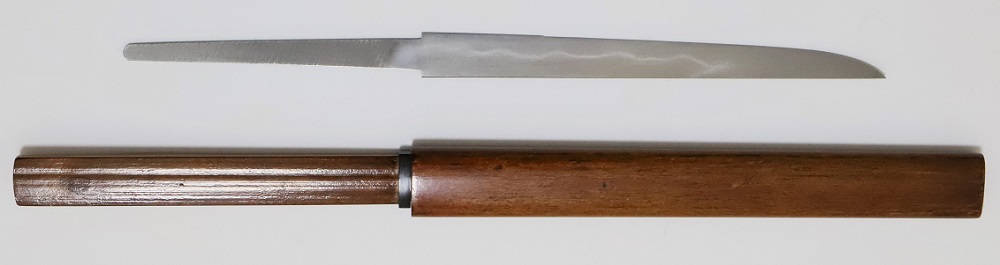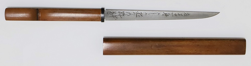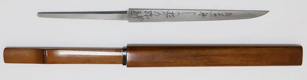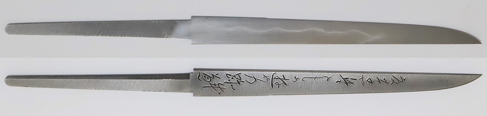 | This Kogatana comes with a saya made of bamboo. On the backside of the blade, a poem was engraved as well as the Mei of Narimichi. The swordsmith was Ishii Narimichi. He was born in 1962 in Tateyama, Chiba Prefecture and became an official swordsmith in 1993. He received many awards through the cotemporary swordsmith events. He has a high reputation of forging Kogatana. The total length of this Kogatana is 19.7cm, the blade length is 12cm, and the width of the blade is 1.2cm. |