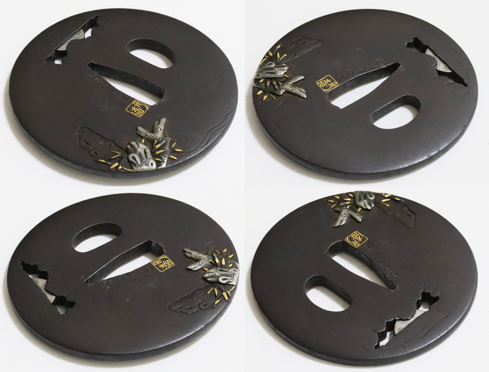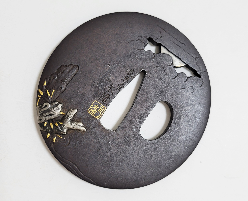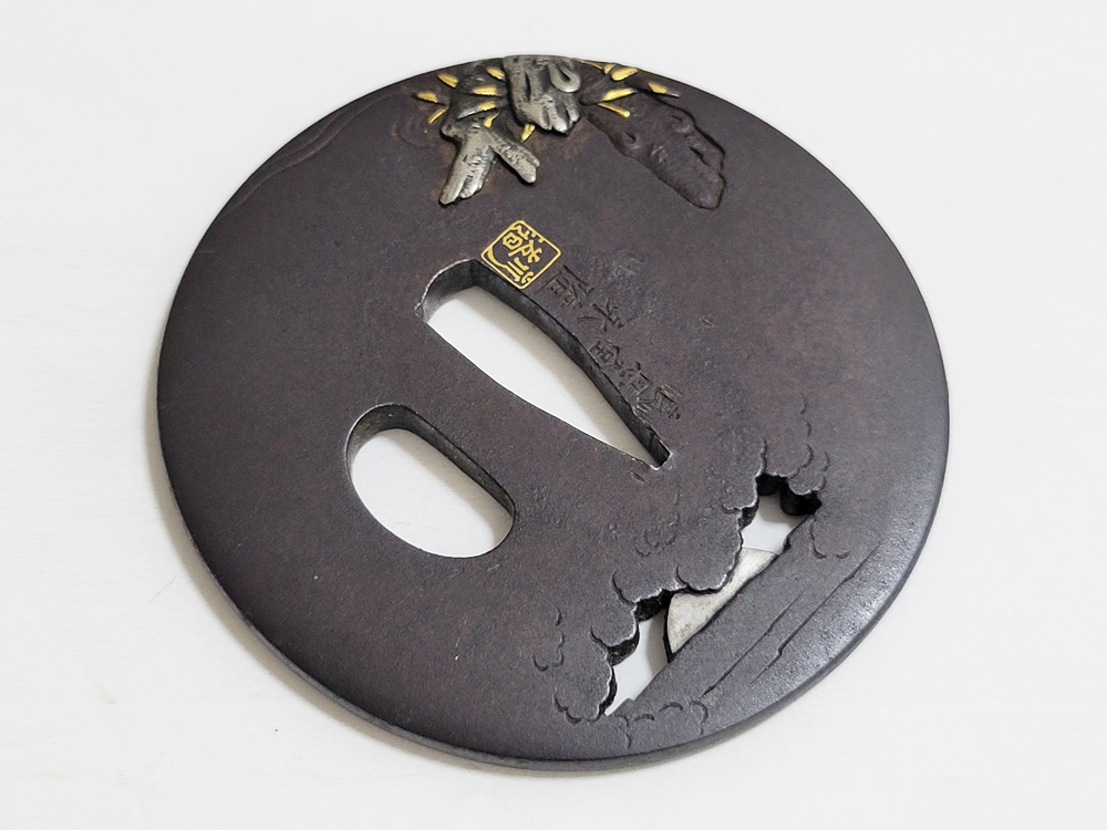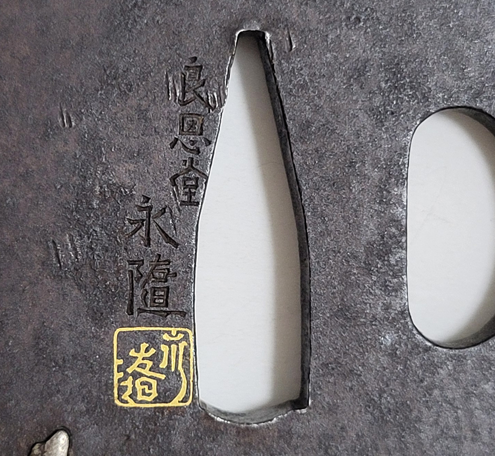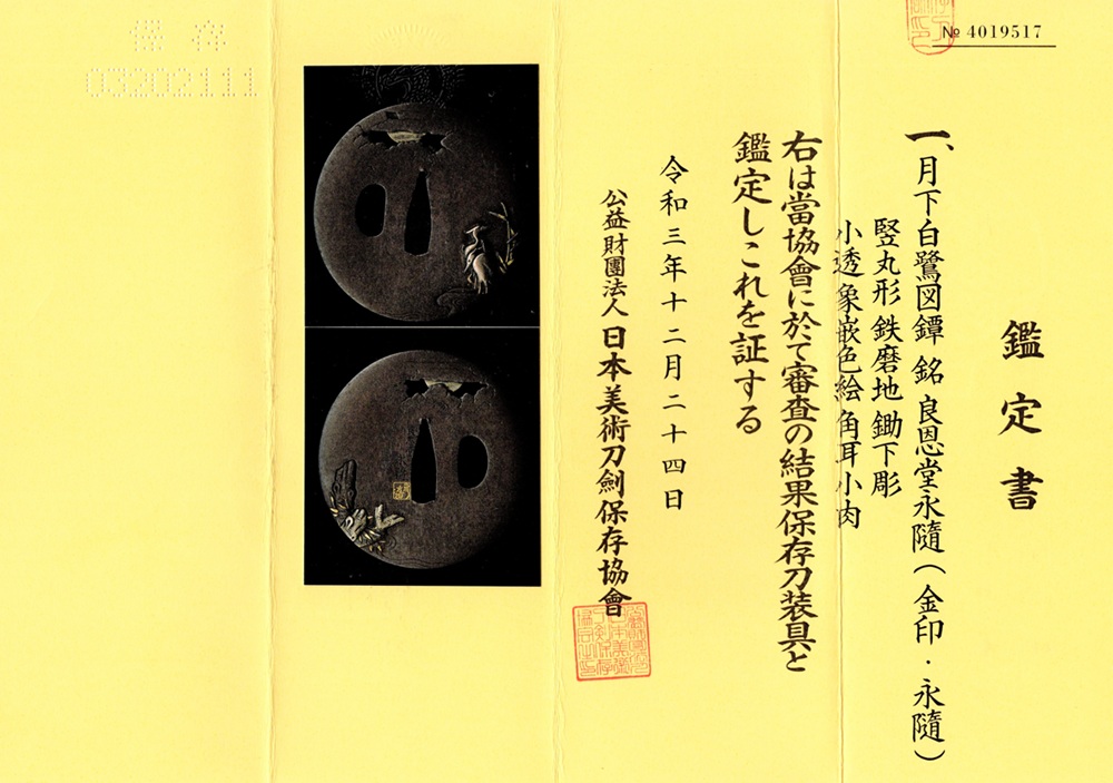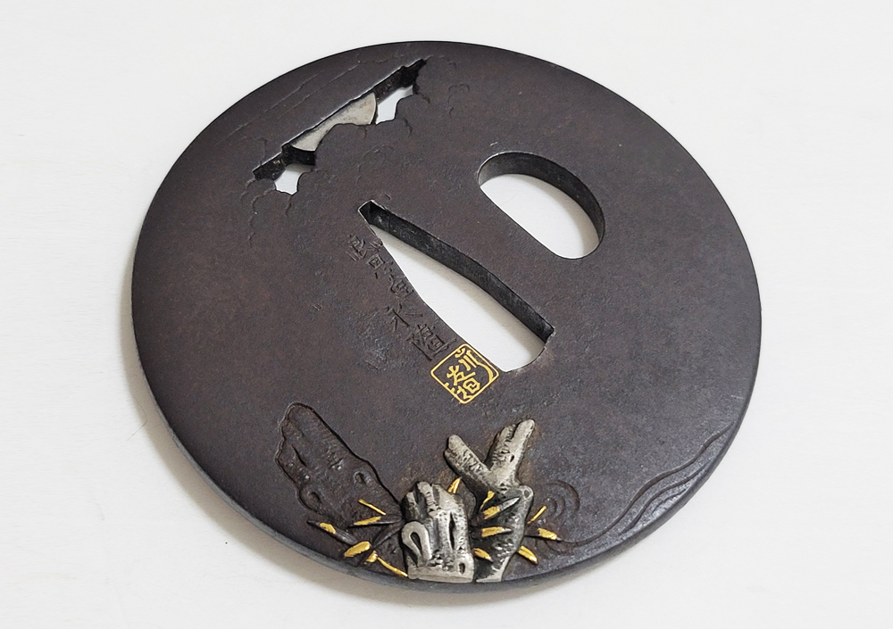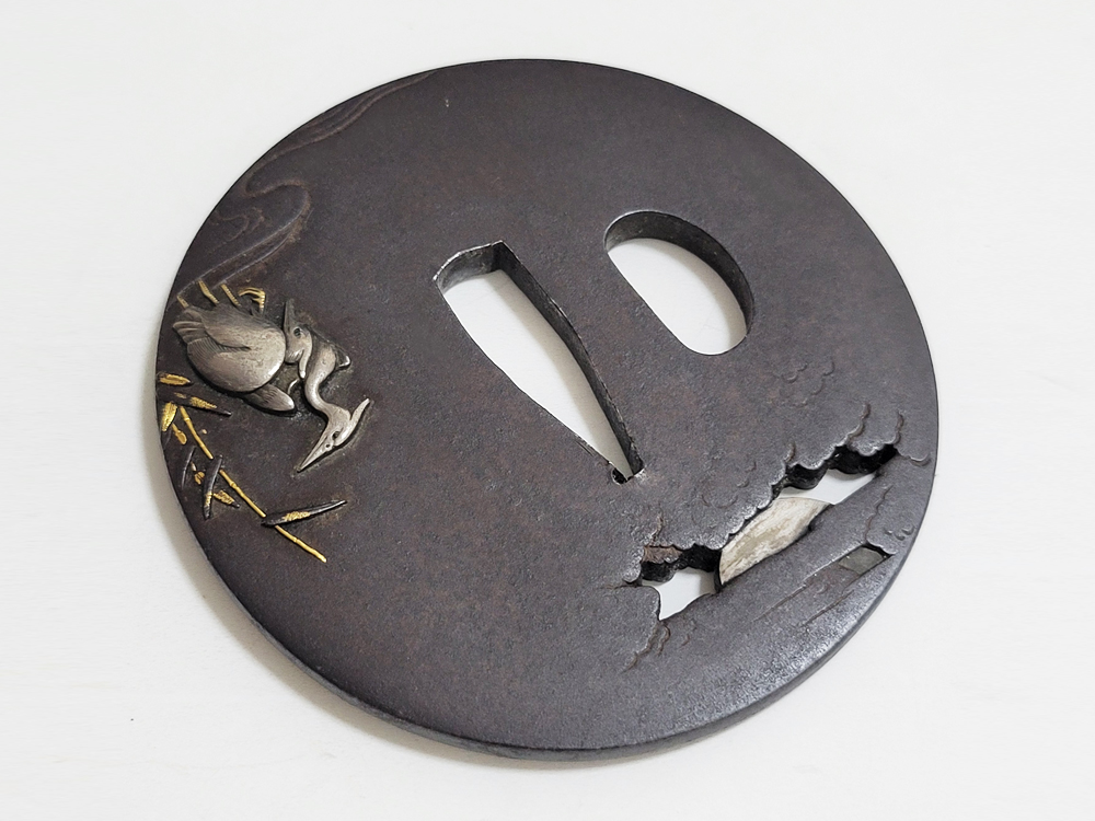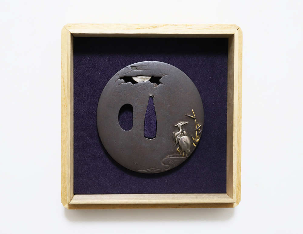 | Eizui [永随] was a member of the Azuma [吾妻] clan. He first studied under Inagawa Yoshikatsu [稲川良克] and took the name Yoshiyuki [良随]. Later, he became a desciple of Hamano Noriyuki [濱野矩随] and changed his name to Nagayuki [永随]. This tsuba is a meticulous work by Nagayuki, who used the go as Ryoondo [良恩堂] and was engraved with gold seal flat inlay. This is a elegant tsuba with a white heron under the moon, in the Hamano style, making full use of techniques. It has passed the Hozon Tosogu shinsa in 2021. |