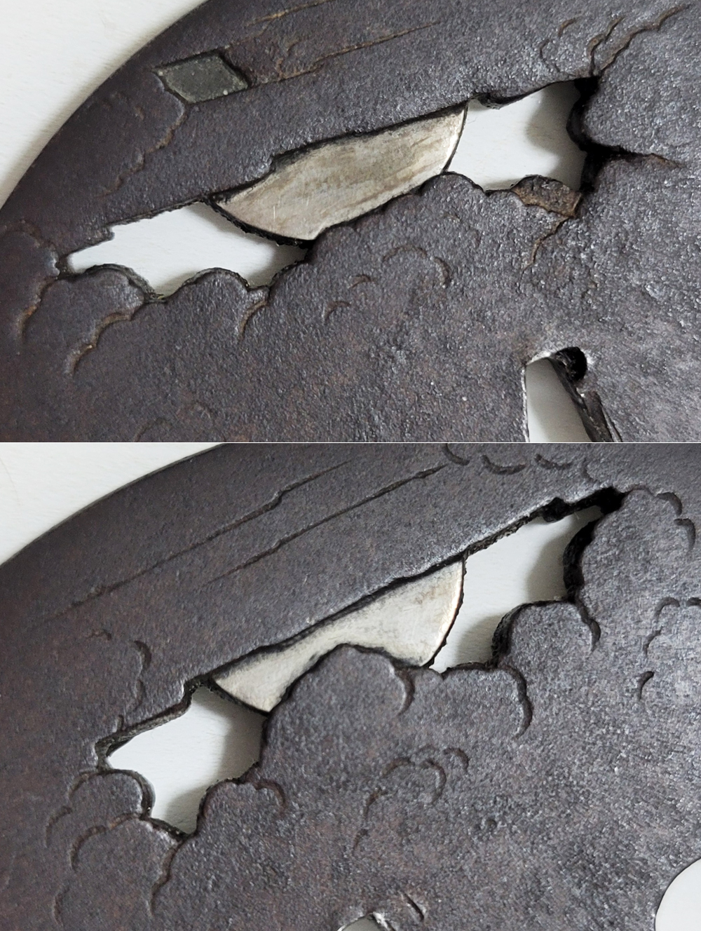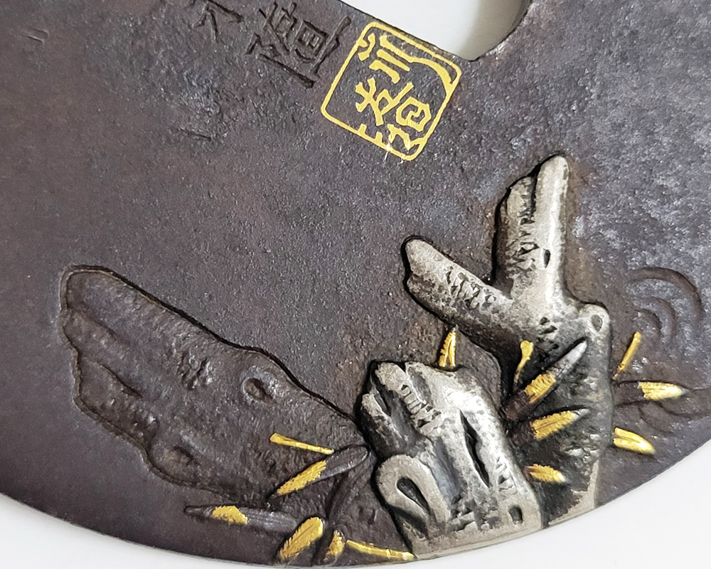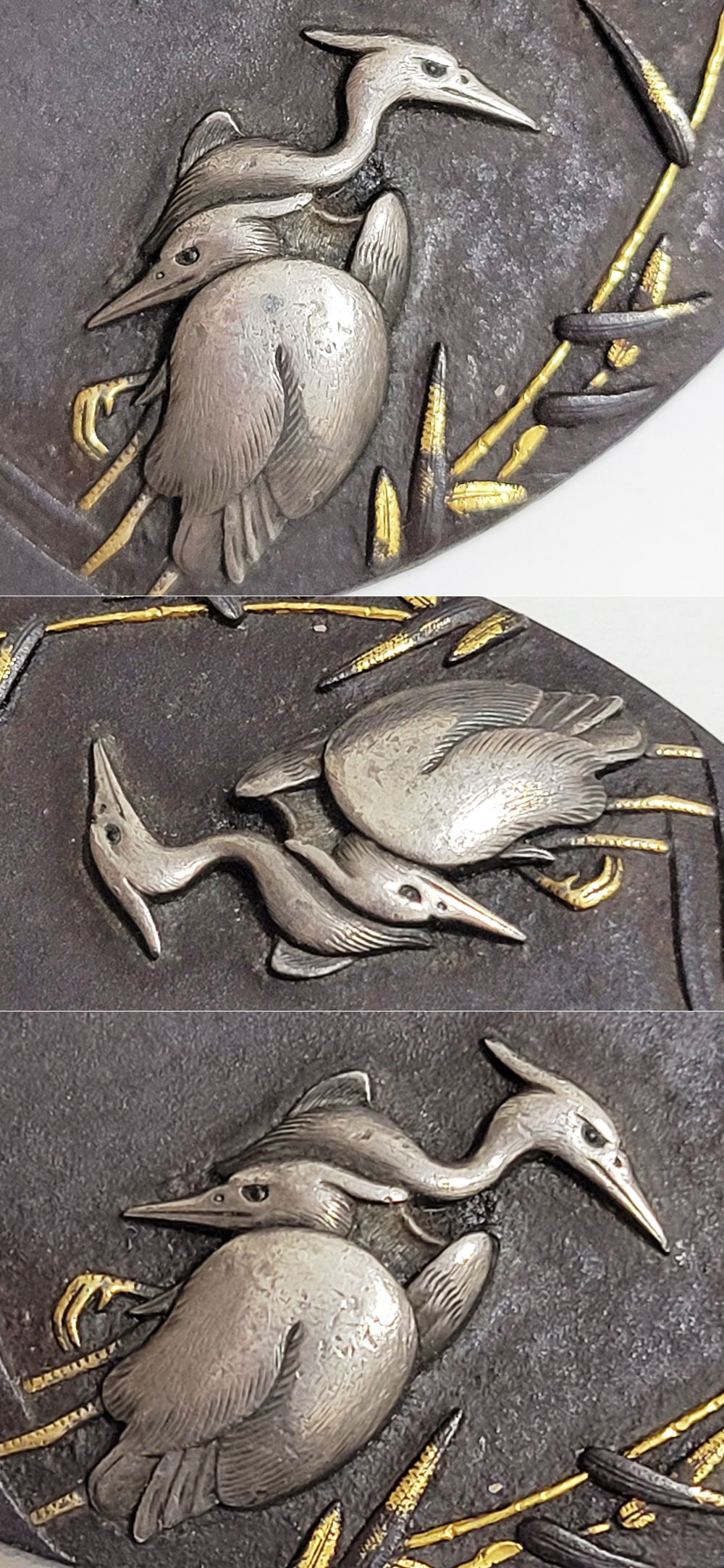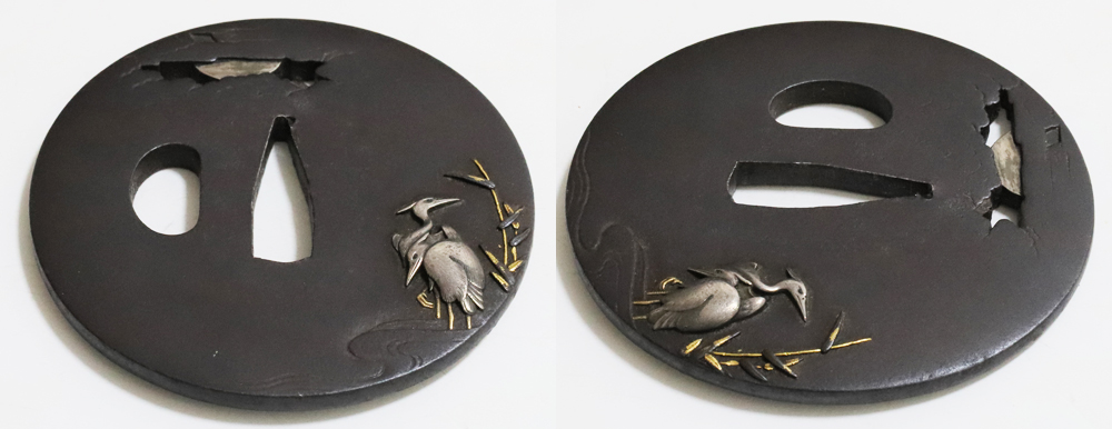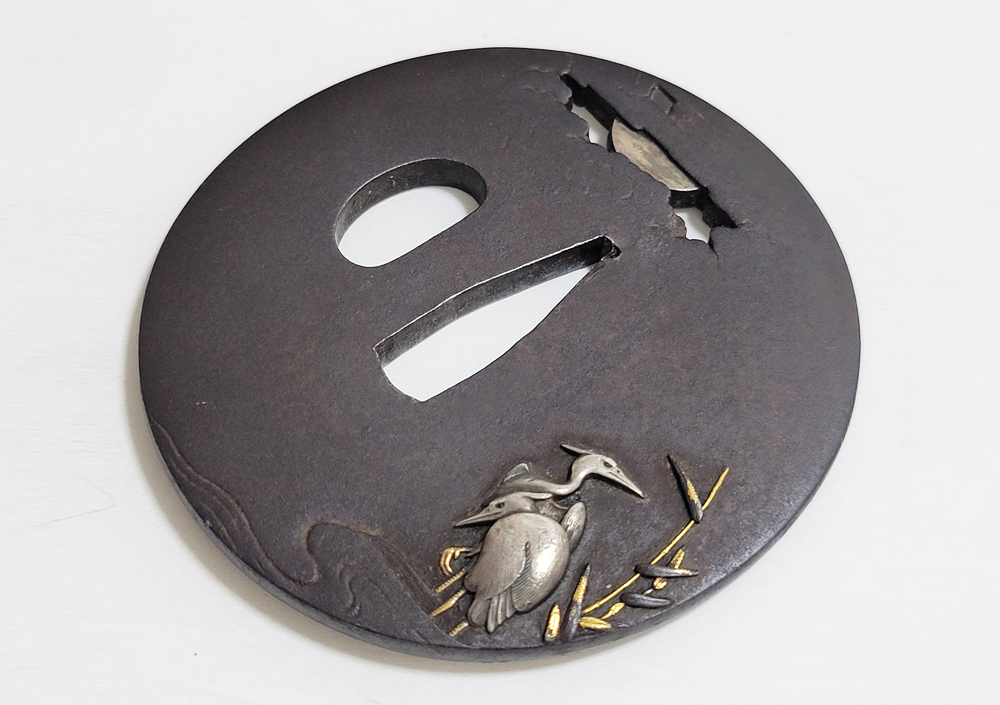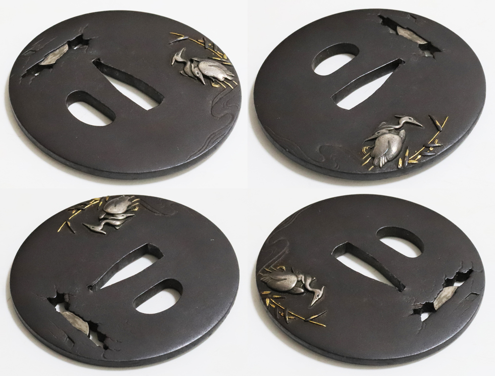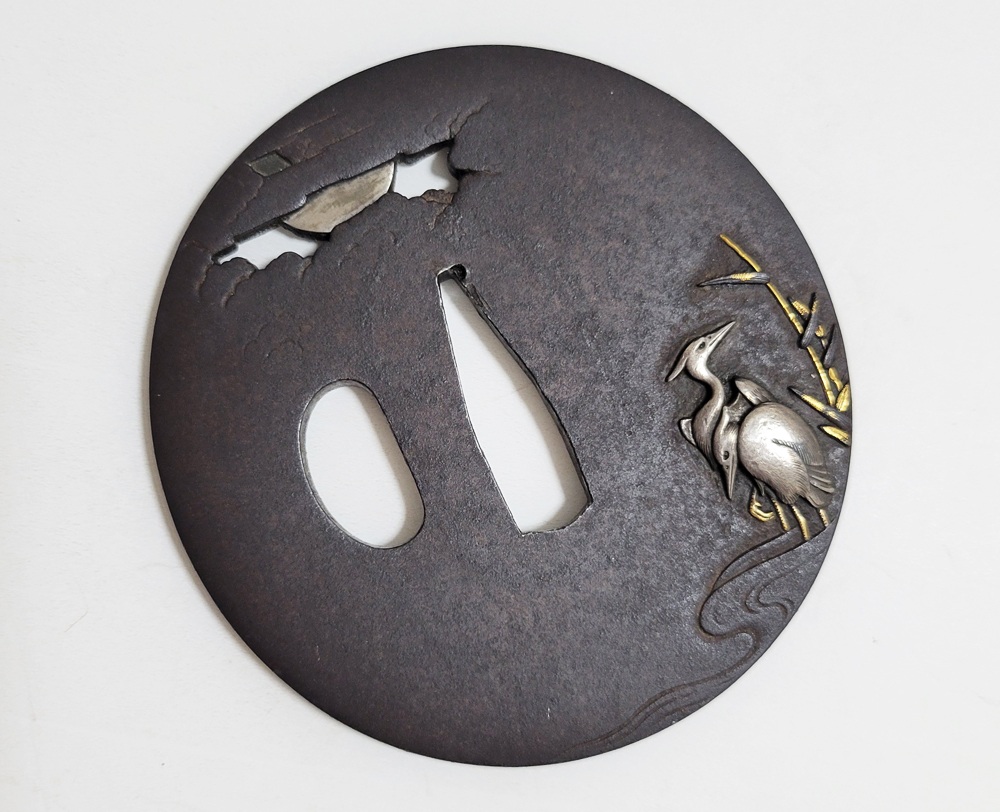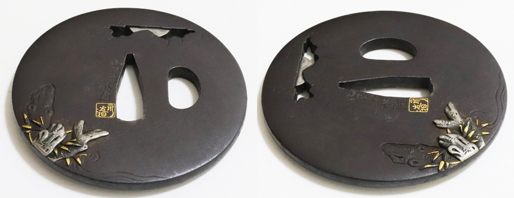 | Eizui [永随] was a member of the Azuma [吾妻] clan. He first studied under Inagawa Yoshikatsu [稲川良克] and took the name Yoshiyuki [良随]. Later, he became a desciple of Hamano Noriyuki [濱野矩随] and changed his name to Nagayuki [永随]. This tsuba is a meticulous work by Nagayuki, who used the go as Ryoondo [良恩堂] and was engraved with gold seal flat inlay. This is a elegant tsuba with a white heron under the moon, in the Hamano style, making full use of techniques. It has passed the Hozon Tosogu shinsa in 2021. |