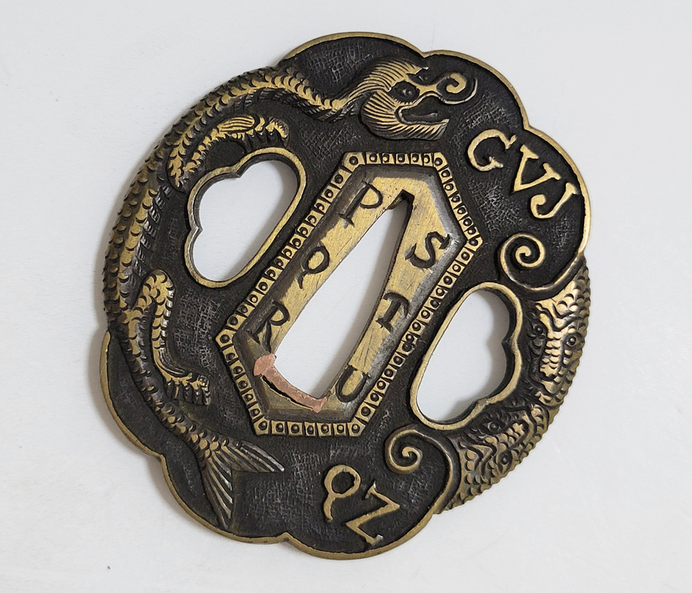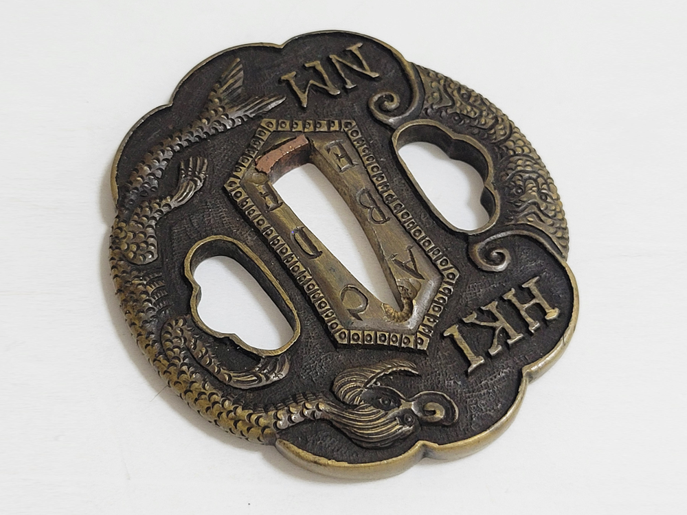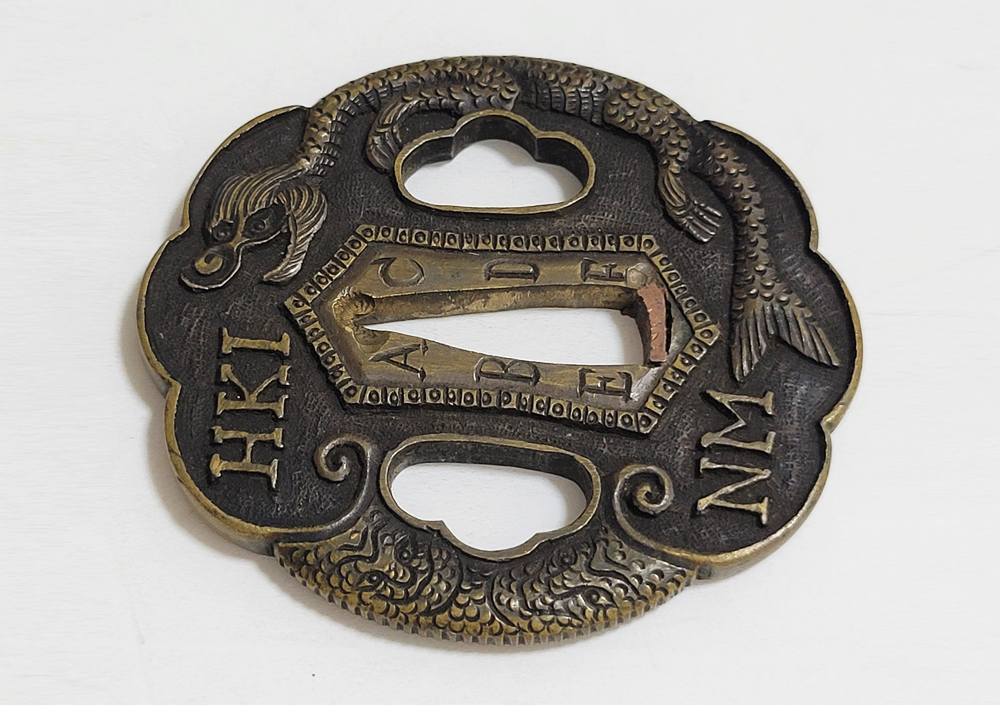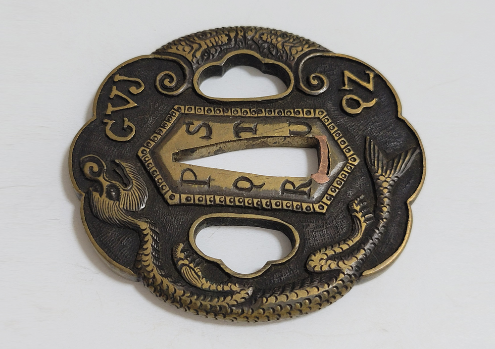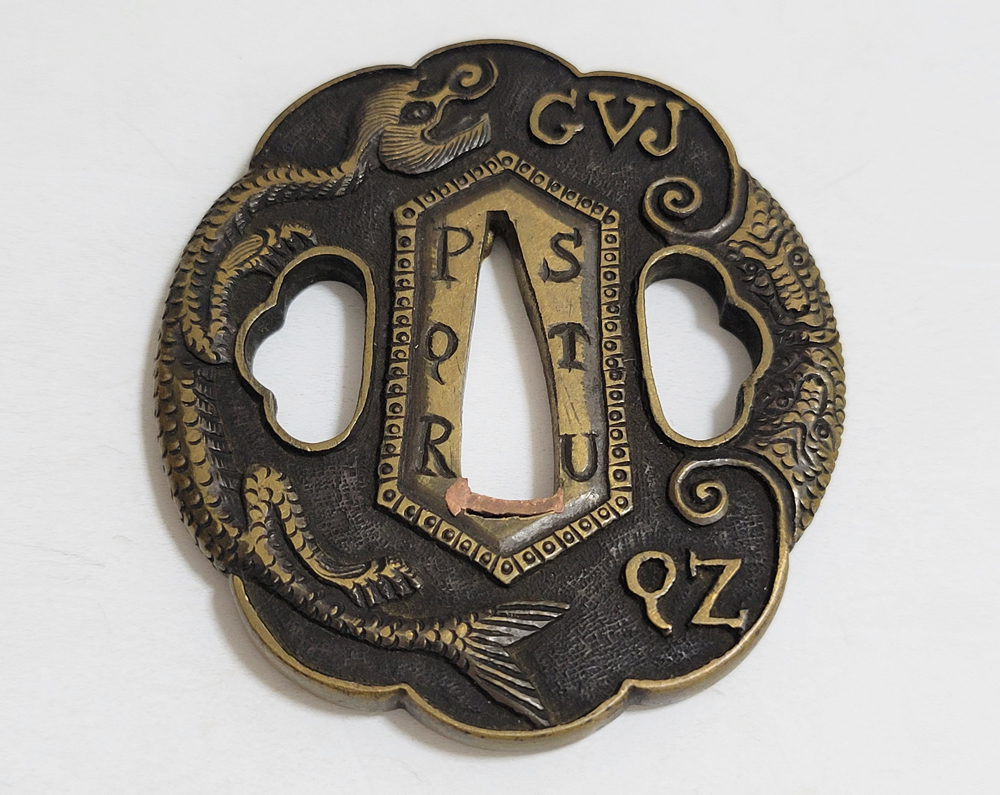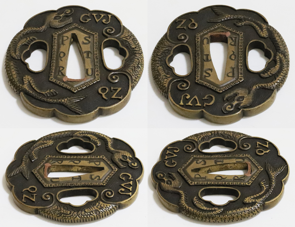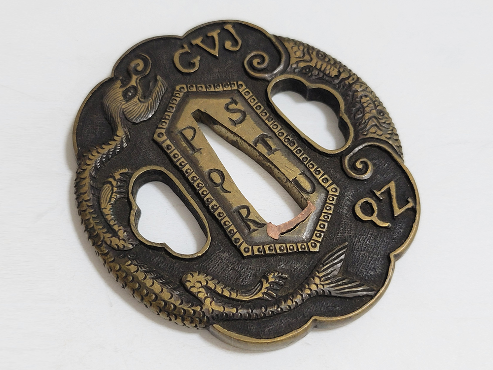 | During the Edo period, Nanban/Europian culture was introduced and exotic tsuba were made, such as silver-overlaid tsuba and intricate carved openwork tsuba with dragon and arabesque patterns, and they became popular as Nanban tsuba. This tsuba features a dragon and Alphabet Characters carved into the brass ground. It is a rare Nanban tsuba that is different from the usual. |