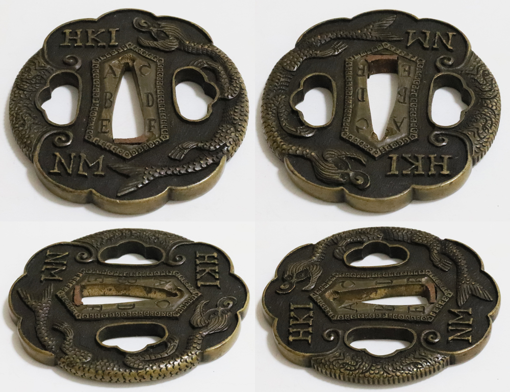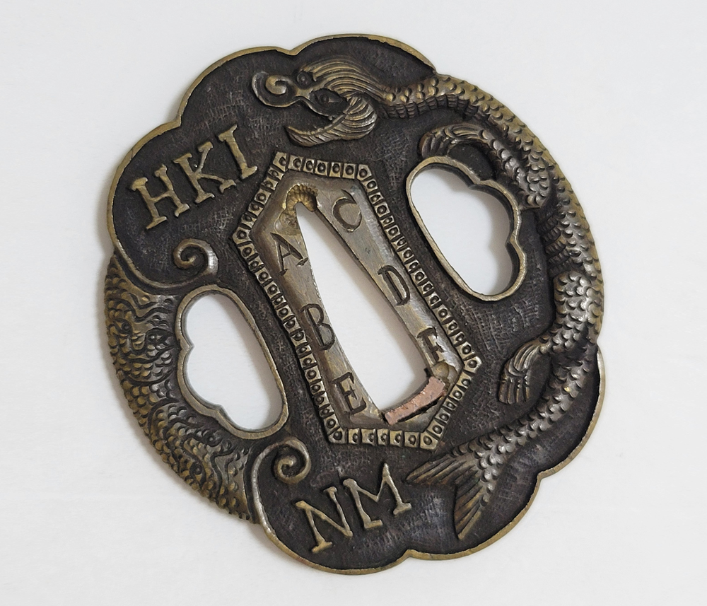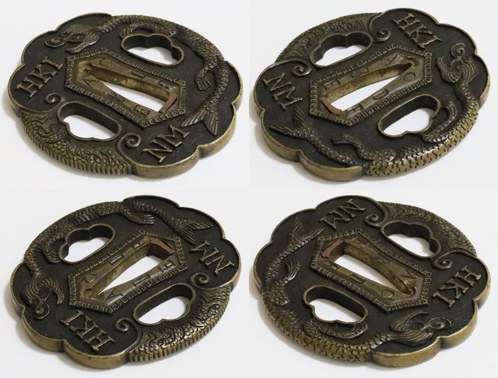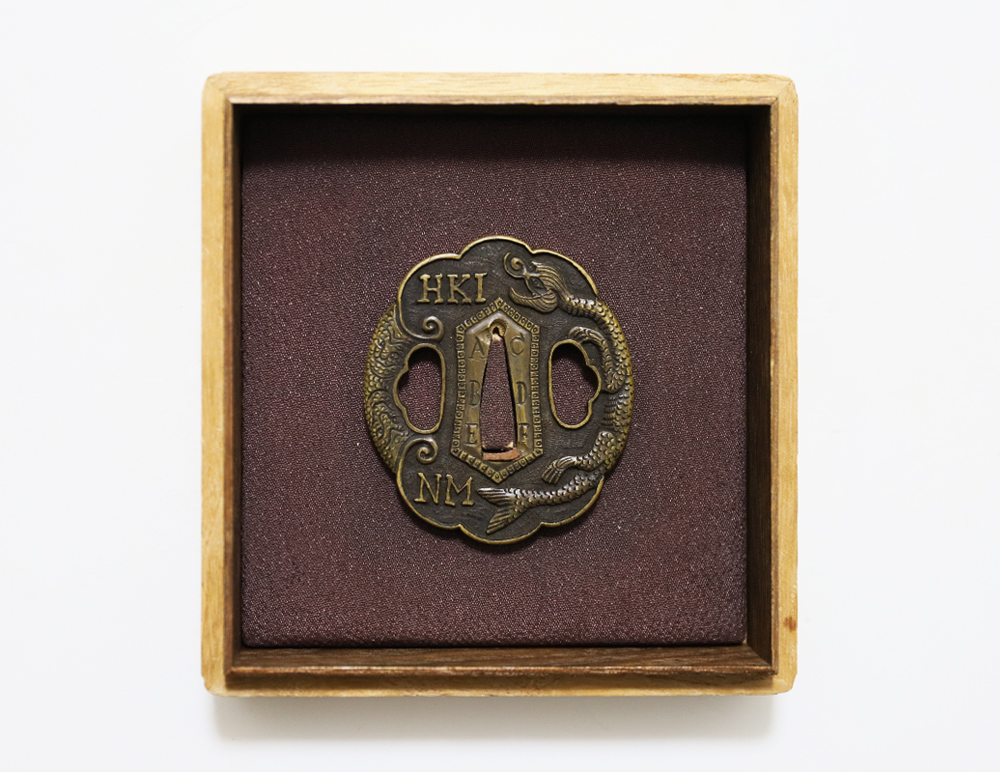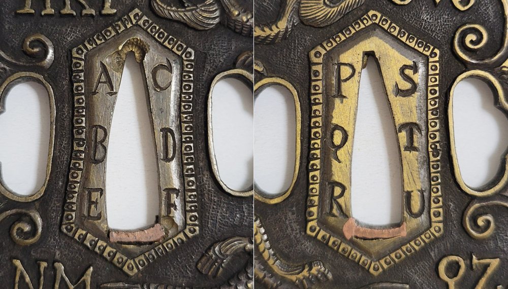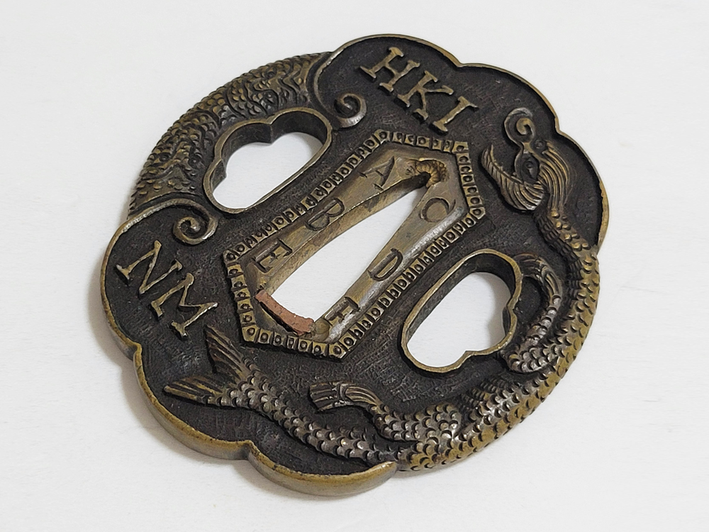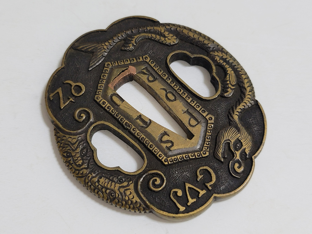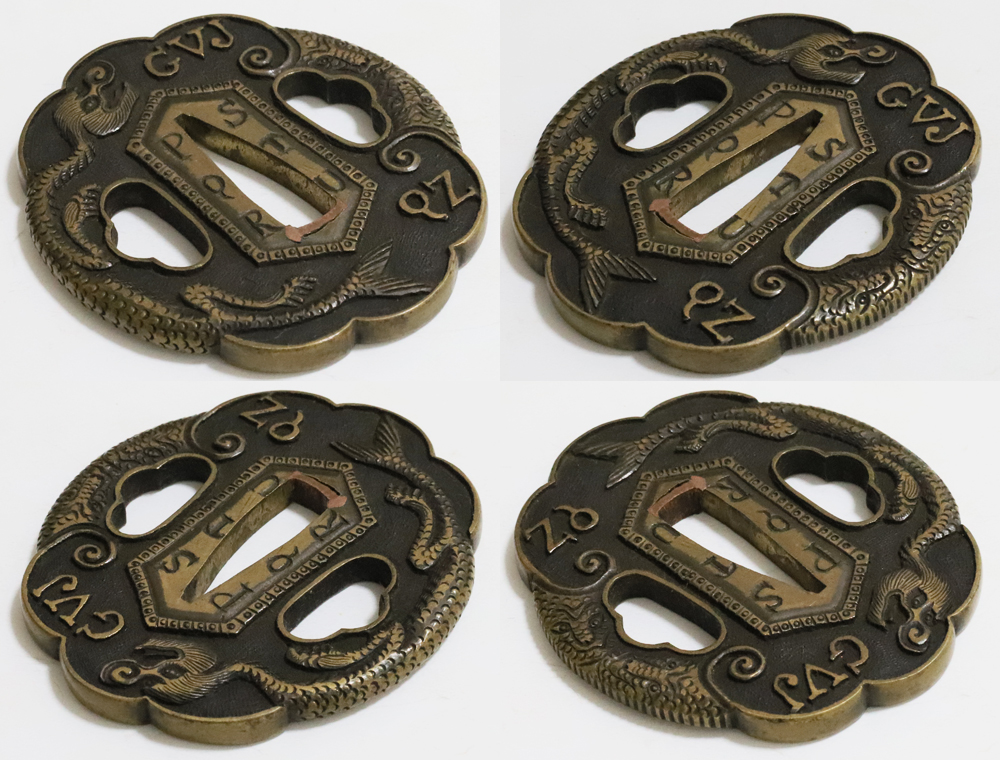 | During the Edo period, Nanban/Europian culture was introduced and exotic tsuba were made, such as silver-overlaid tsuba and intricate carved openwork tsuba with dragon and arabesque patterns, and they became popular as Nanban tsuba. This tsuba features a dragon and Alphabet Characters carved into the brass ground. It is a rare Nanban tsuba that is different from the usual. |