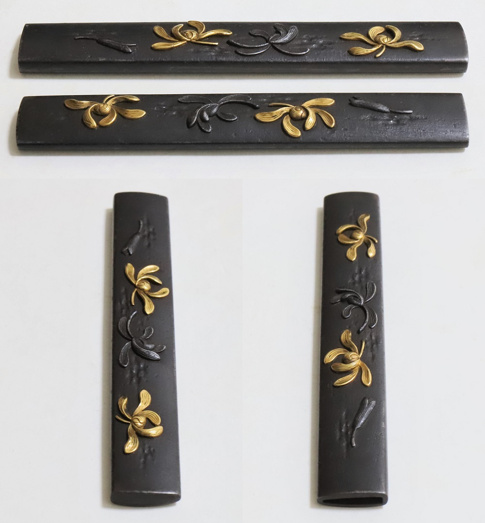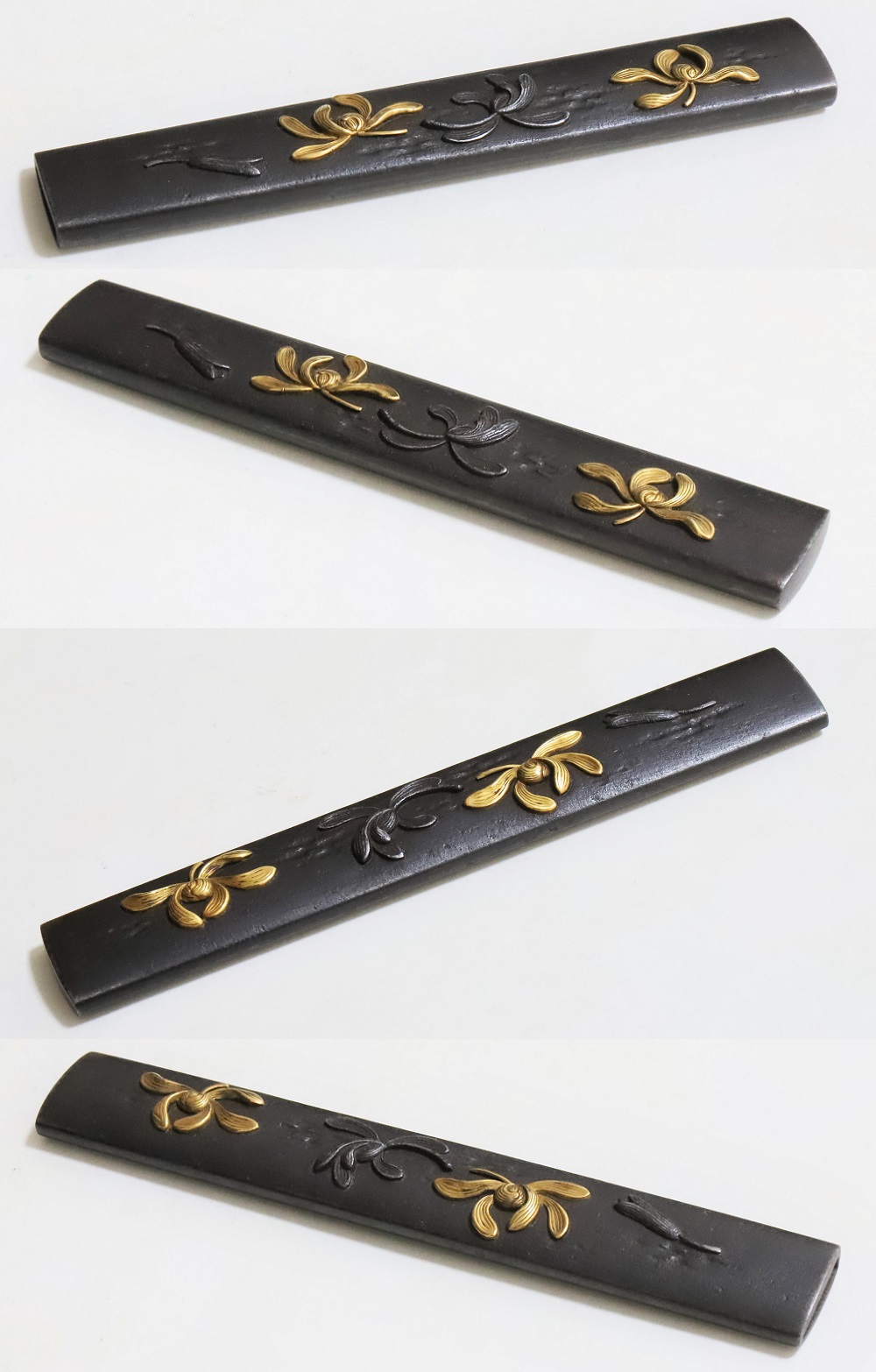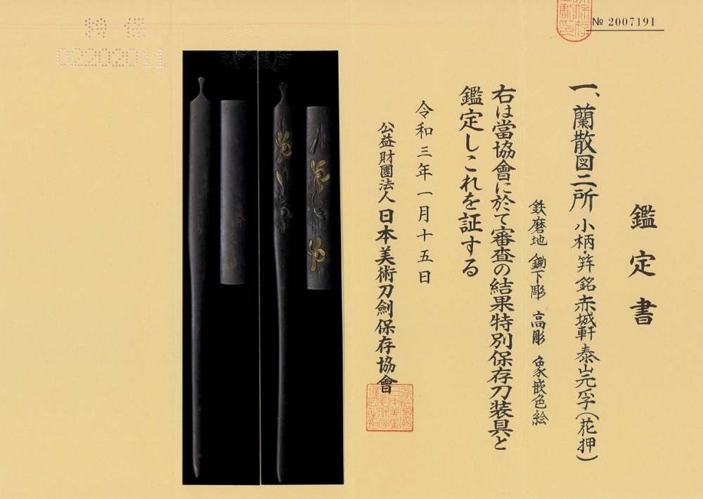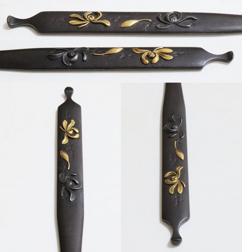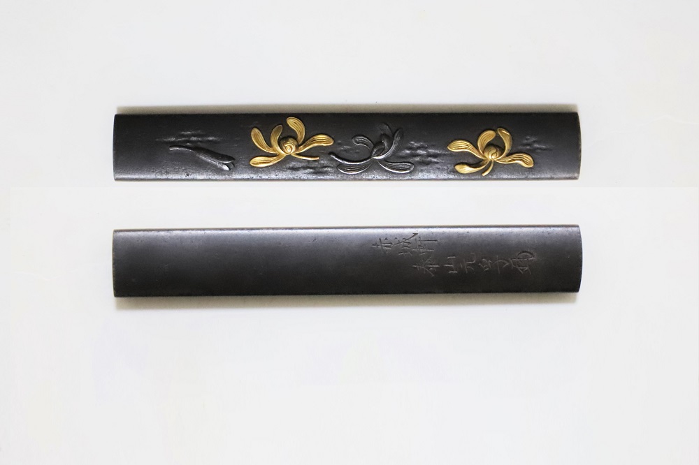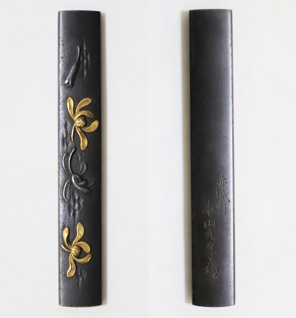 | 蘭は文人好みの画題で、梅・竹・菊とともに美しさと気品の高さから高潔な君子に見立てられた四君子のひとつである。特に姿を見せずとも香りを漂わせることから、世に隠れた高節の士の比喩といわれる。本作銘「赤城軒 泰山元孚(花押)」は上工と評され、江戸時代後期の水戸金工で、四代までありいずれも赤城軒の号を用いた。初代は元教の実子で江戸に出て奈良派などに学び、赤城軒一派を興す。本作は銘振りより元治二年(1865)没の三代元孚と思われる。鉄地に蘭を散らした上品な小柄笄二所。 |