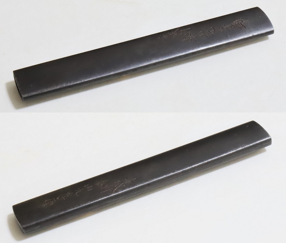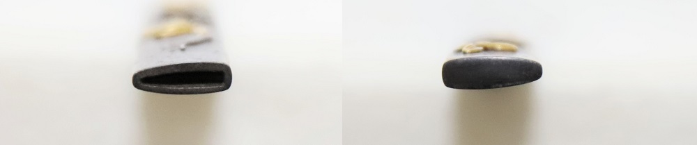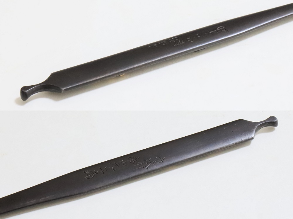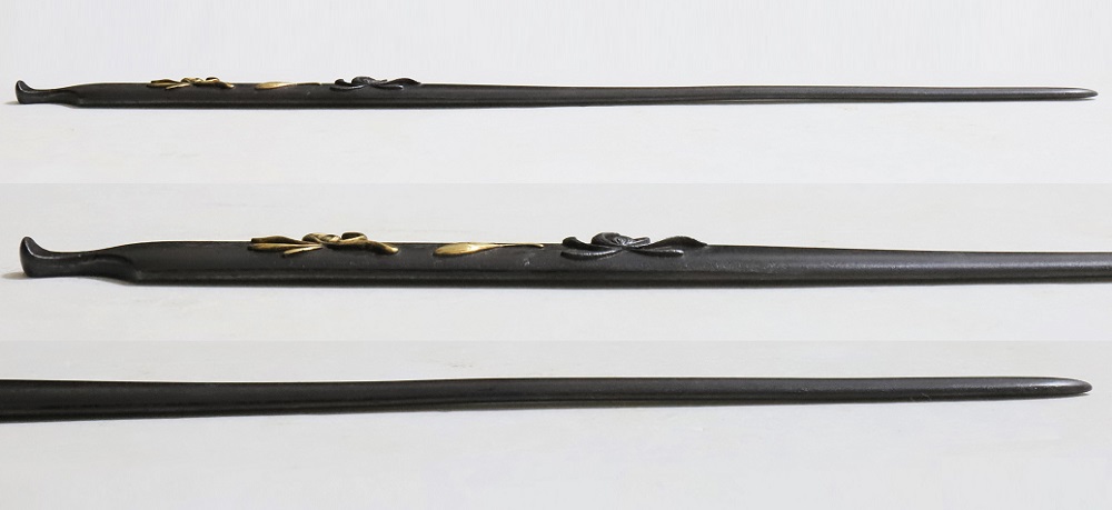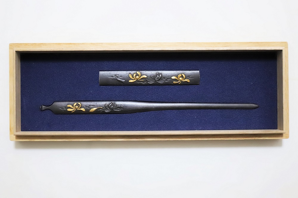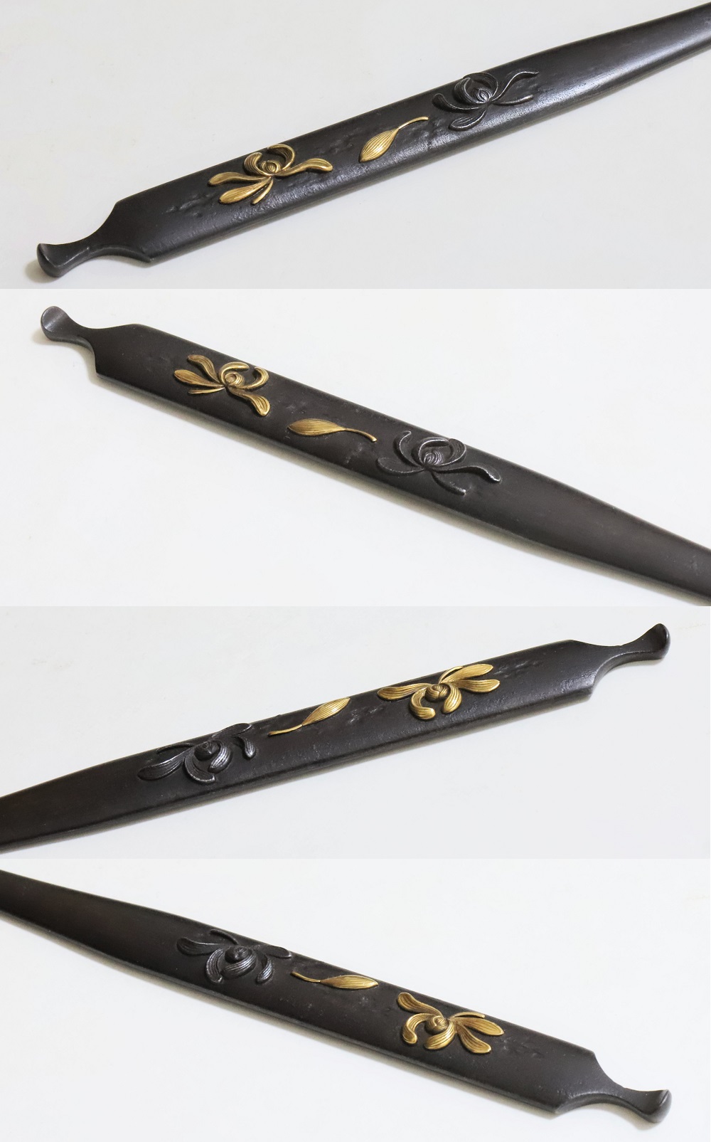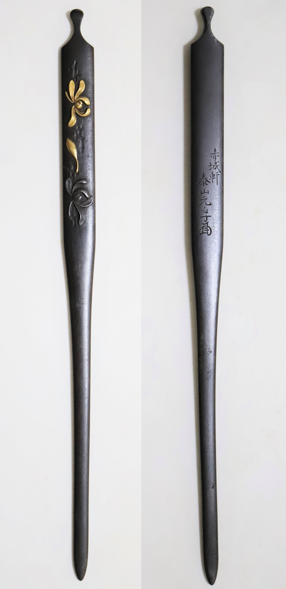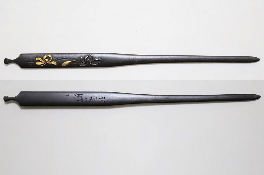 | 蘭は文人好みの画題で、梅・竹・菊とともに美しさと気品の高さから高潔な君子に見立てられた四君子のひとつである。特に姿を見せずとも香りを漂わせることから、世に隠れた高節の士の比喩といわれる。本作銘「赤城軒 泰山元孚(花押)」は上工と評され、江戸時代後期の水戸金工で、四代までありいずれも赤城軒の号を用いた。初代は元教の実子で江戸に出て奈良派などに学び、赤城軒一派を興す。本作は銘振りより元治二年(1865)没の三代元孚と思われる。鉄地に蘭を散らした上品な小柄笄二所。 |