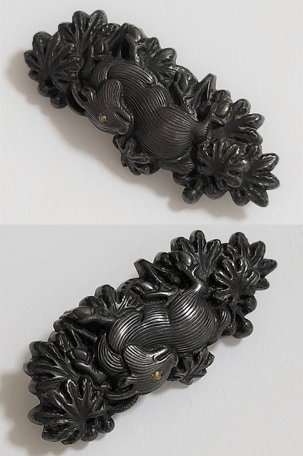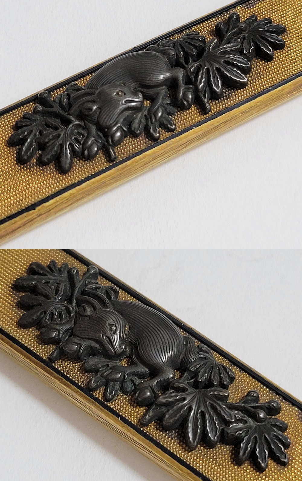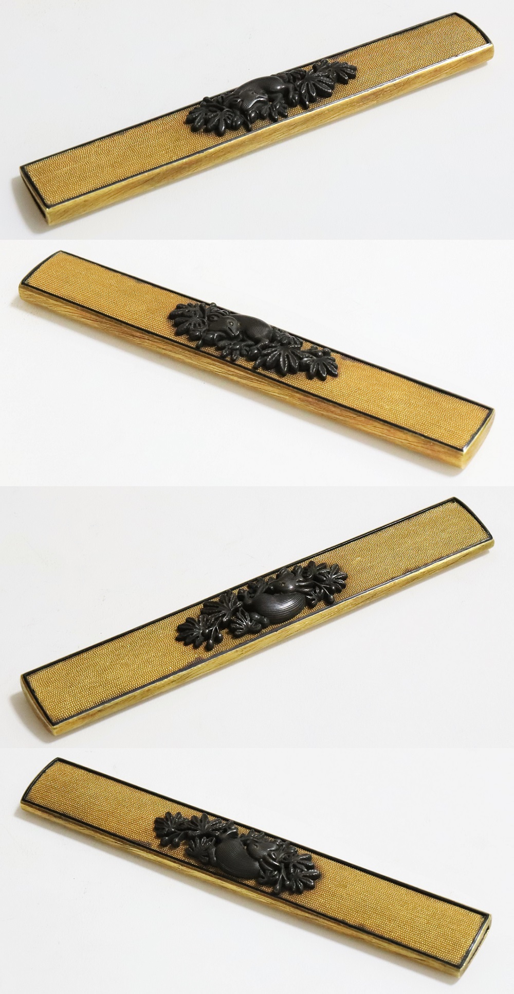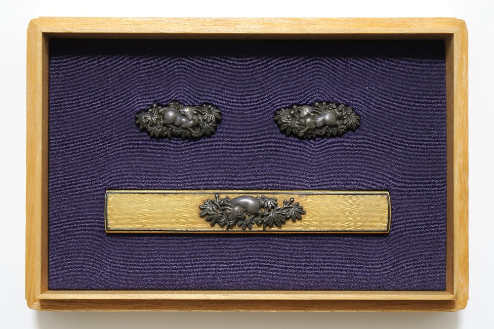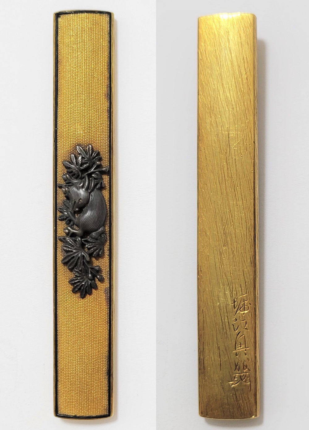 | 堀江興成は15歳で浜野政随に入門して益随と名乗り、明和六年(1769)政随没後に大森英秀門に転じて師の一字をもらい英俊と改め、独立開業したのちに興成と名乗る。阿波蜂須賀家25万石の抱工となった後は藩邸内に住んで門弟の育成に力を注いだ。江戸中期の上工。銘は初め楷書だが晩年には特徴のあるのびやかな草書体銘となる。「興」の字をくずして「奥」の字に似る字体を切る。赤銅魚子地に高彫色絵の手法が得意。本作は 山羊(やぎ)と八つ手の小柄・目貫二所物。山羊は繁殖力強く厳しい環境にも耐え、八つ手は丈夫で魔除けとして庭に植えられた。子孫繁栄の意味がある組合せ。全体を金の薄板で包んだ惣金華やかな小柄には草書銘が刻され、精巧な鏨使いの八つ手山羊の紋、同目貫が揃う二所物。 |