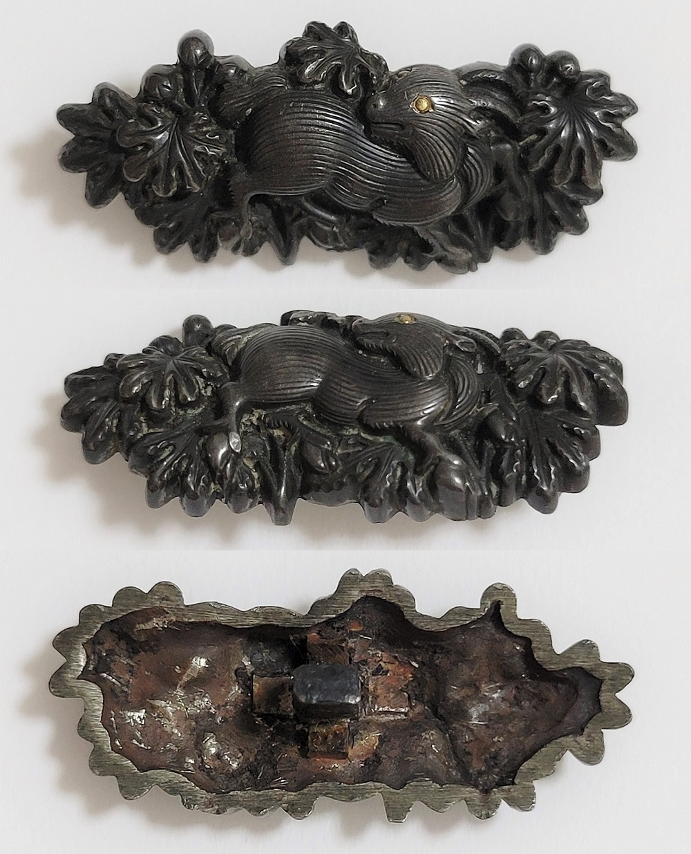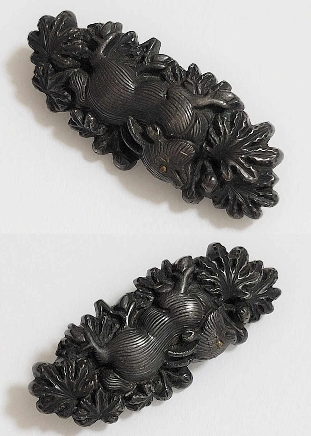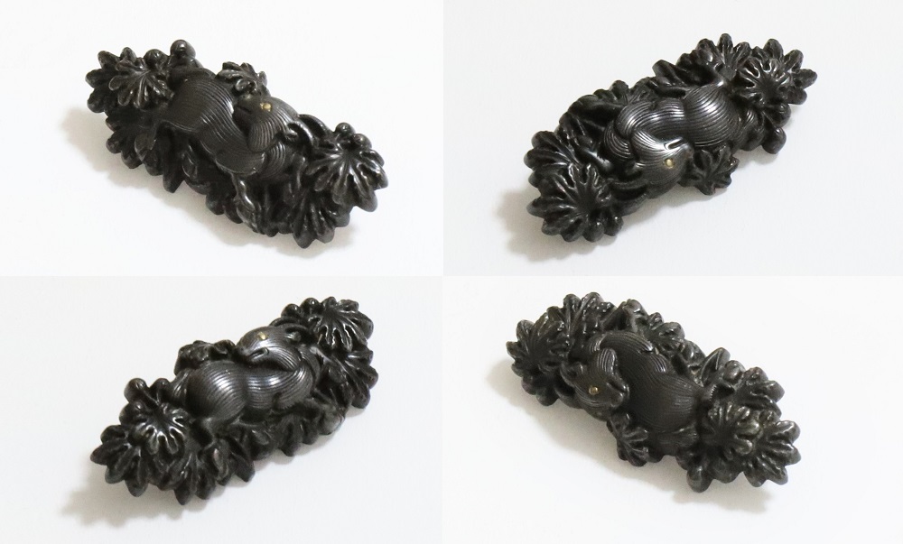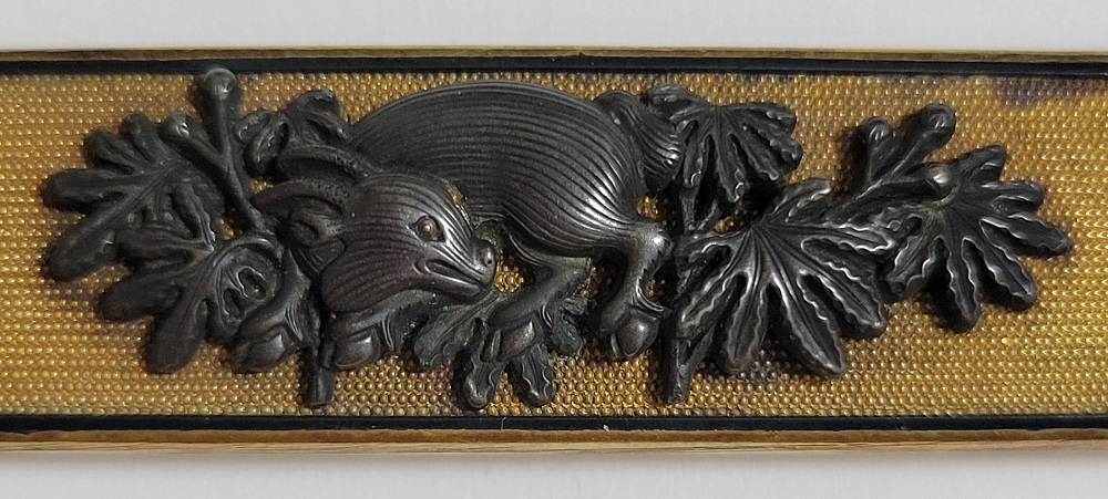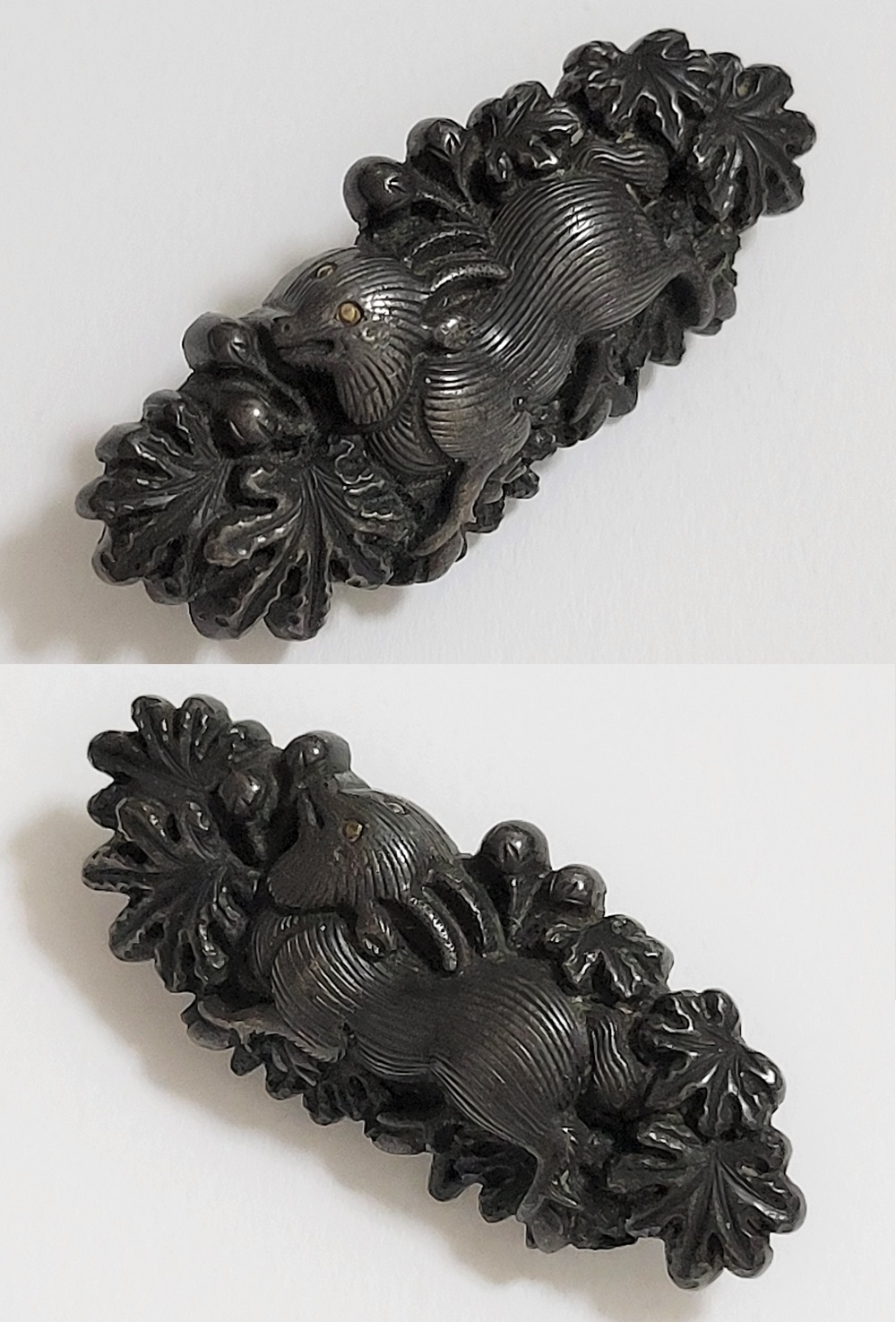 | 堀江興成は15歳で浜野政随に入門して益随と名乗り、明和六年(1769)政随没後に大森英秀門に転じて師の一字をもらい英俊と改め、独立開業したのちに興成と名乗る。阿波蜂須賀家25万石の抱工となった後は藩邸内に住んで門弟の育成に力を注いだ。江戸中期の上工。銘は初め楷書だが晩年には特徴のあるのびやかな草書体銘となる。「興」の字をくずして「奥」の字に似る字体を切る。赤銅魚子地に高彫色絵の手法が得意。本作は 山羊(やぎ)と八つ手の小柄・目貫二所物。山羊は繁殖力強く厳しい環境にも耐え、八つ手は丈夫で魔除けとして庭に植えられた。子孫繁栄の意味がある組合せ。全体を金の薄板で包んだ惣金華やかな小柄には草書銘が刻され、精巧な鏨使いの八つ手山羊の紋、同目貫が揃う二所物。 |