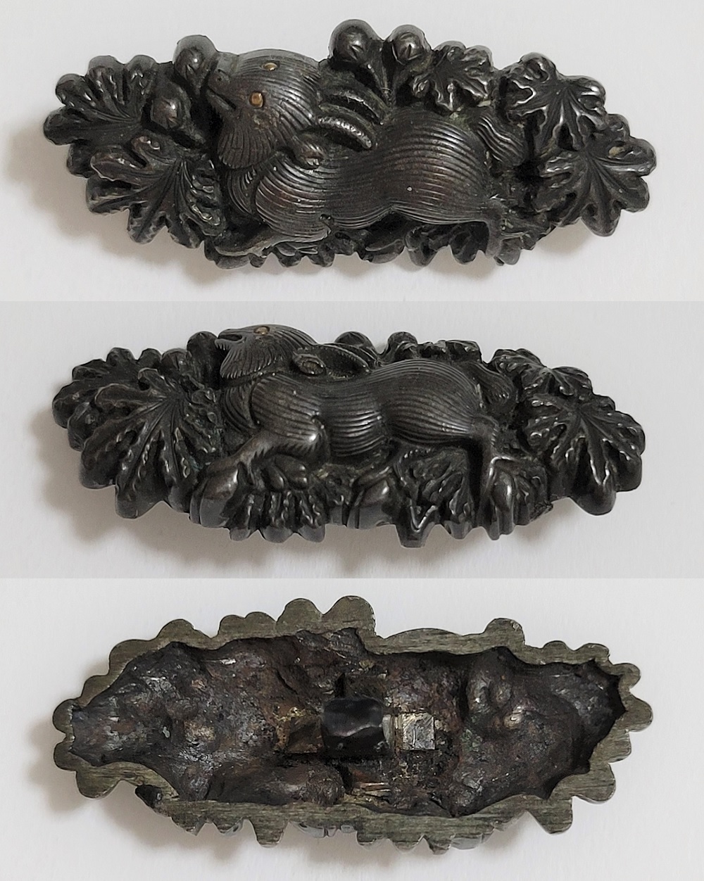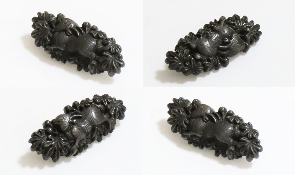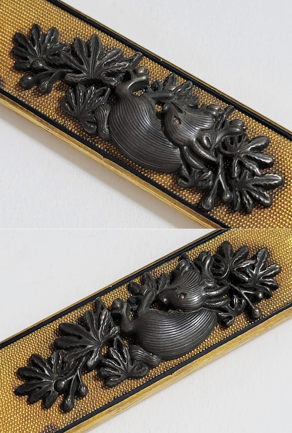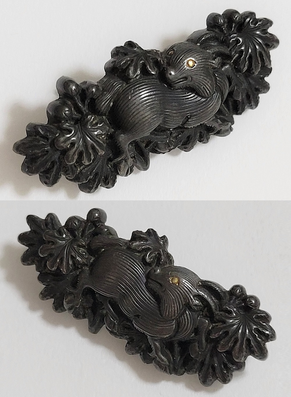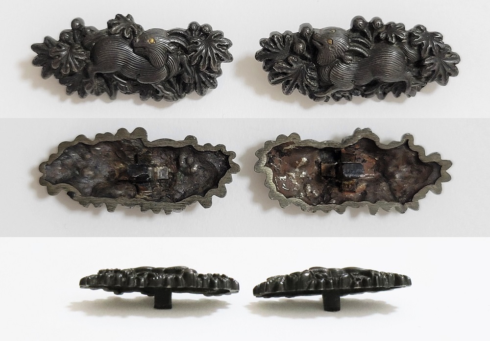 | 堀江興成は15歳で浜野政随に入門して益随と名乗り、明和六年(1769)政随没後に大森英秀門に転じて師の一字をもらい英俊と改め、独立開業したのちに興成と名乗る。阿波蜂須賀家25万石の抱工となった後は藩邸内に住んで門弟の育成に力を注いだ。江戸中期の上工。銘は初め楷書だが晩年には特徴のあるのびやかな草書体銘となる。「興」の字をくずして「奥」の字に似る字体を切る。赤銅魚子地に高彫色絵の手法が得意。本作は 山羊(やぎ)と八つ手の小柄・目貫二所物。山羊は繁殖力強く厳しい環境にも耐え、八つ手は丈夫で魔除けとして庭に植えられた。子孫繁栄の意味がある組合せ。全体を金の薄板で包んだ惣金華やかな小柄には草書銘が刻され、精巧な鏨使いの八つ手山羊の紋、同目貫が揃う二所物。 |