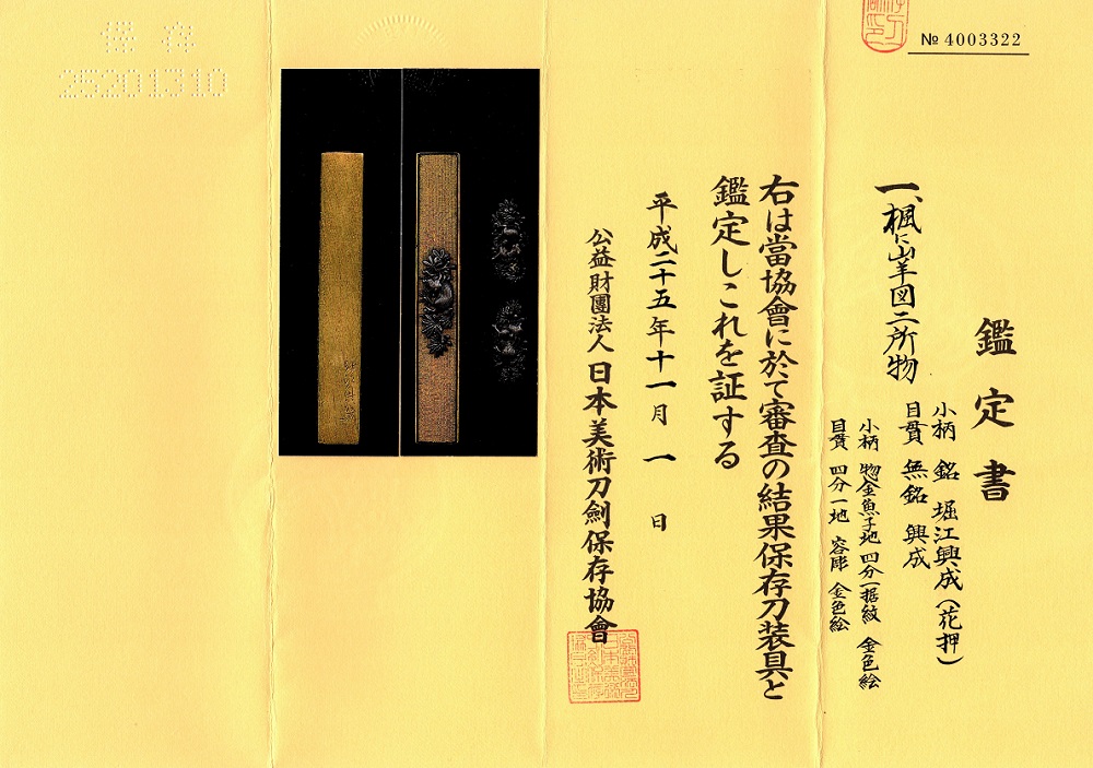 | 銘 | 小柄:堀江興成(花押)目貫:無銘(興成) |