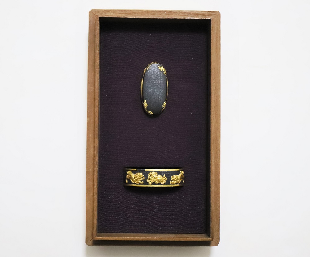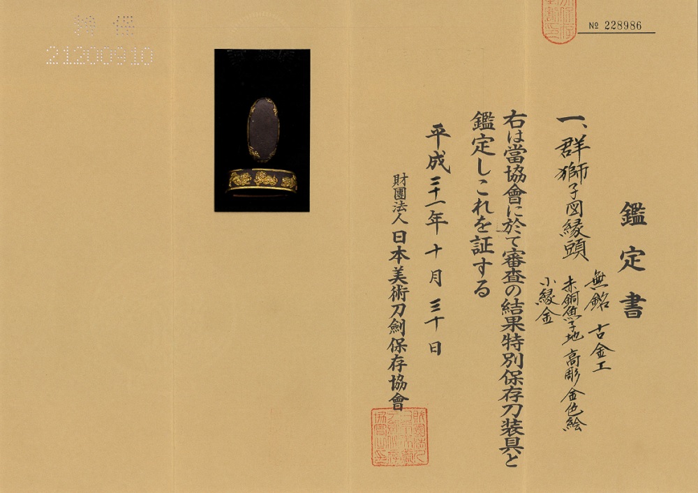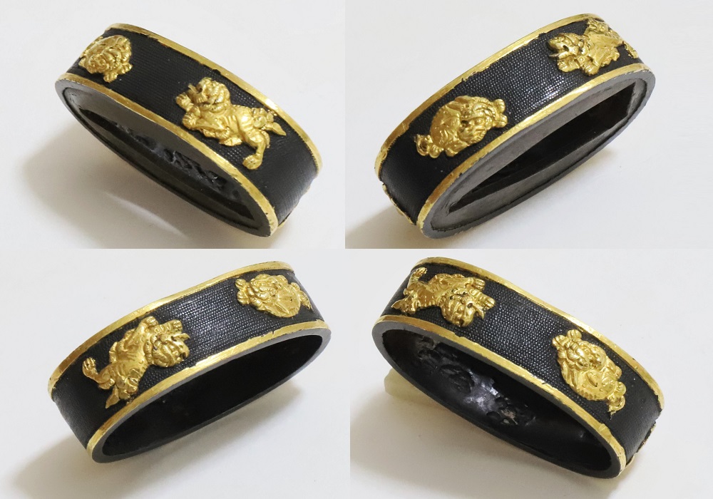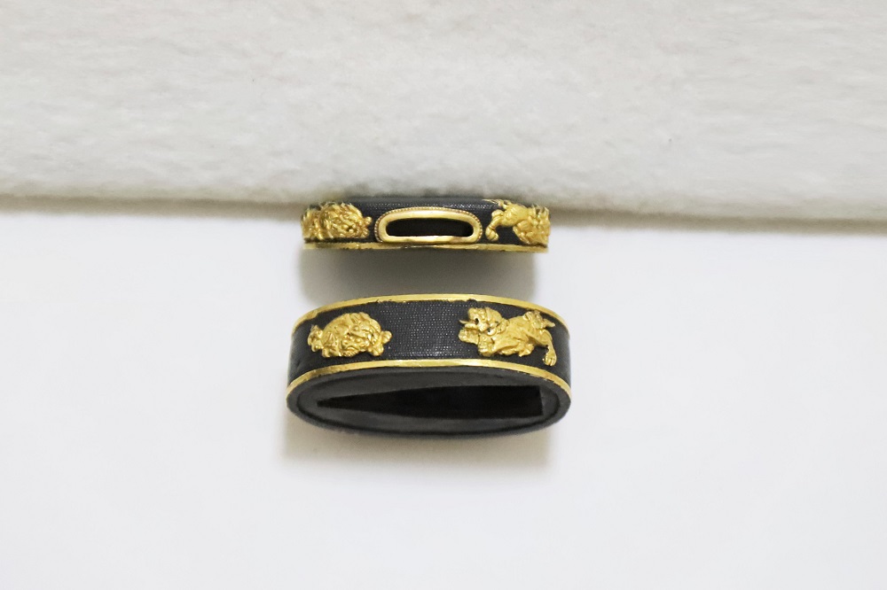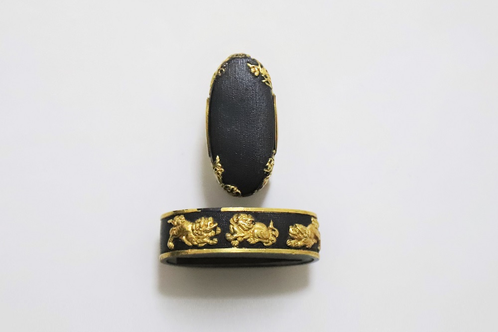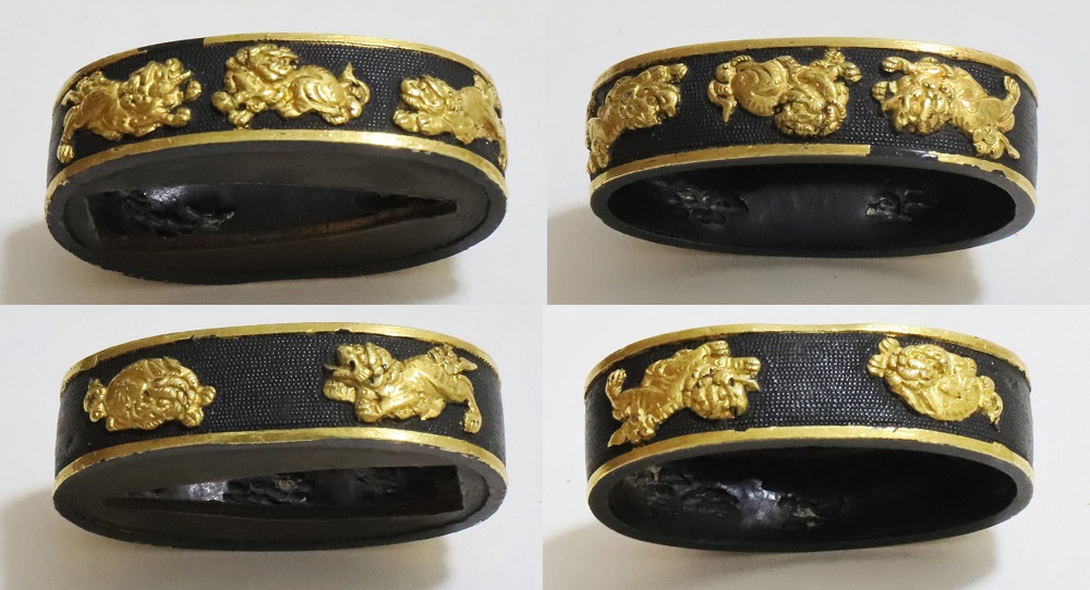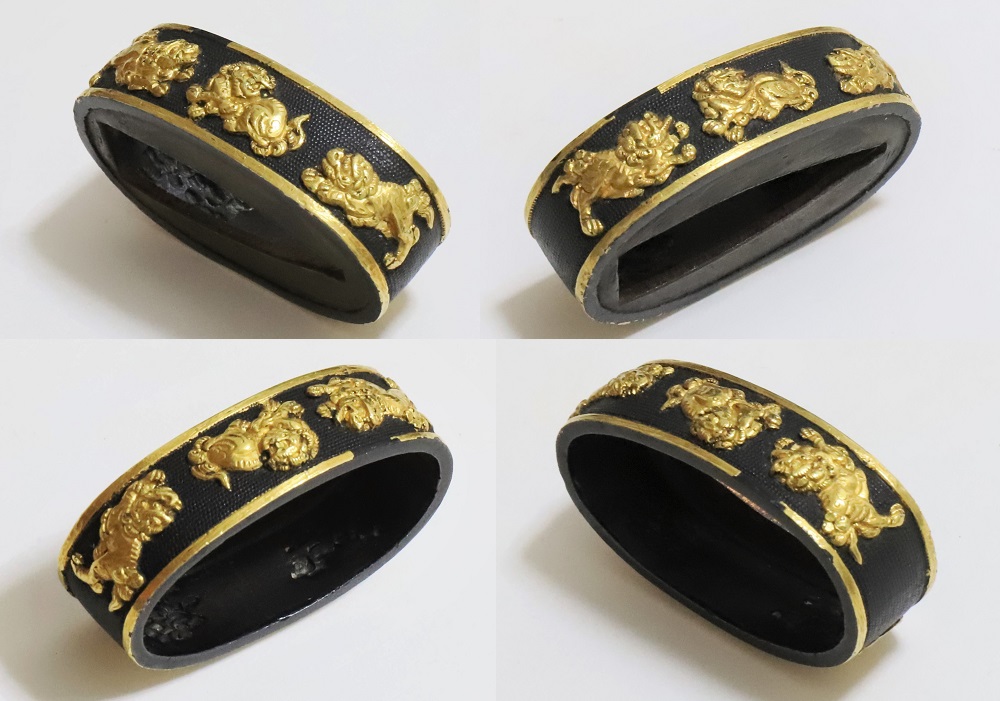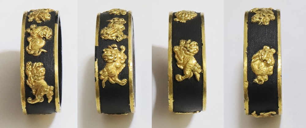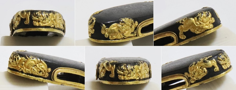本作は、裏打ち出しで獅子を彫り金色絵を施す。地は端正な縦魚子。古金工と極められた群獅子図縁頭。古金工とは桃山時代以前の金工作品のうち、後藤家や美濃彫などその特徴が特定し得ない金工作品をいう。特別保存刀装具。