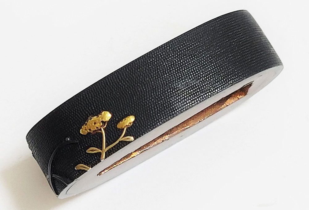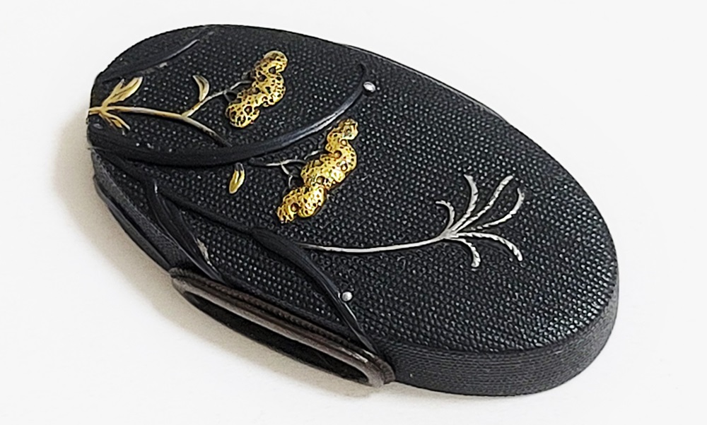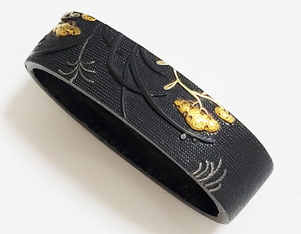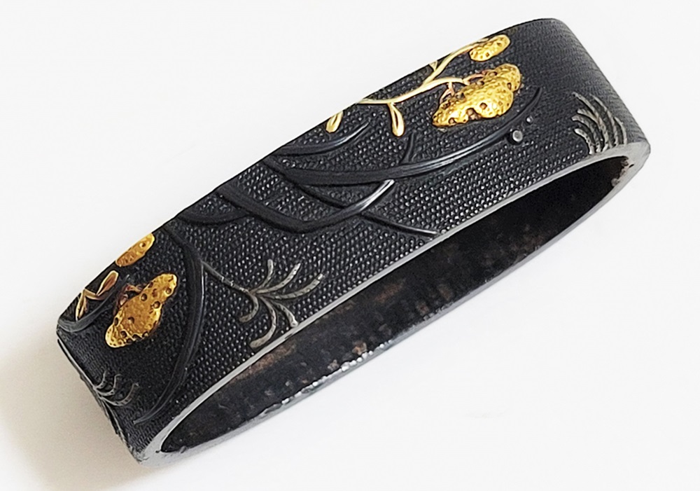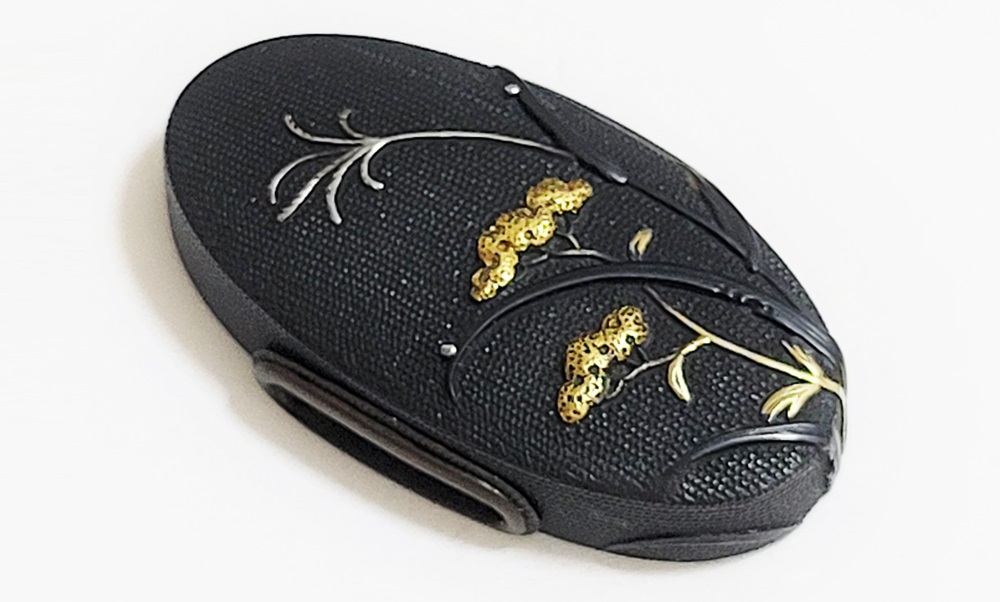 | 一乗派に極められた秋草図縁頭。後藤一乗は近世金工界第一と謳われる名匠。別家京後藤家の名門に生まれ、実兄弟に光凞(みつひろ)と光覧(みつただ)がいる。寛政十一年(1799)に9歳で八郎兵衛家の養子となり、文化二年(1805)15歳で養父謙乗の死去により八郎兵衛家六代目の家督を相続した。伝統的家彫に新味を加えて妙技であらわす他、後藤の掟に拘らない新境地の作域を開拓。名門後藤家の掉尾を飾る名工で、船田一琴、橋本一至、中川一匠など多くの優れた門弟達を輩出した。本作は微細に打たれた赤銅魚子地に上品高尚な趣で秋草をあらわす。一乗の作風が感じられる。 |