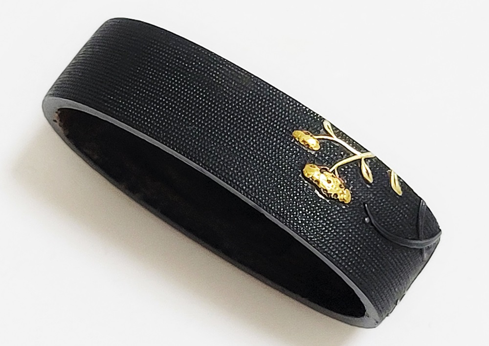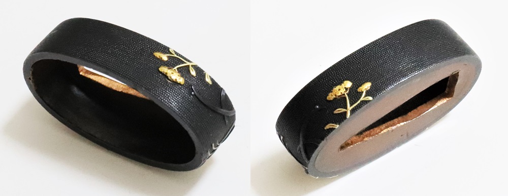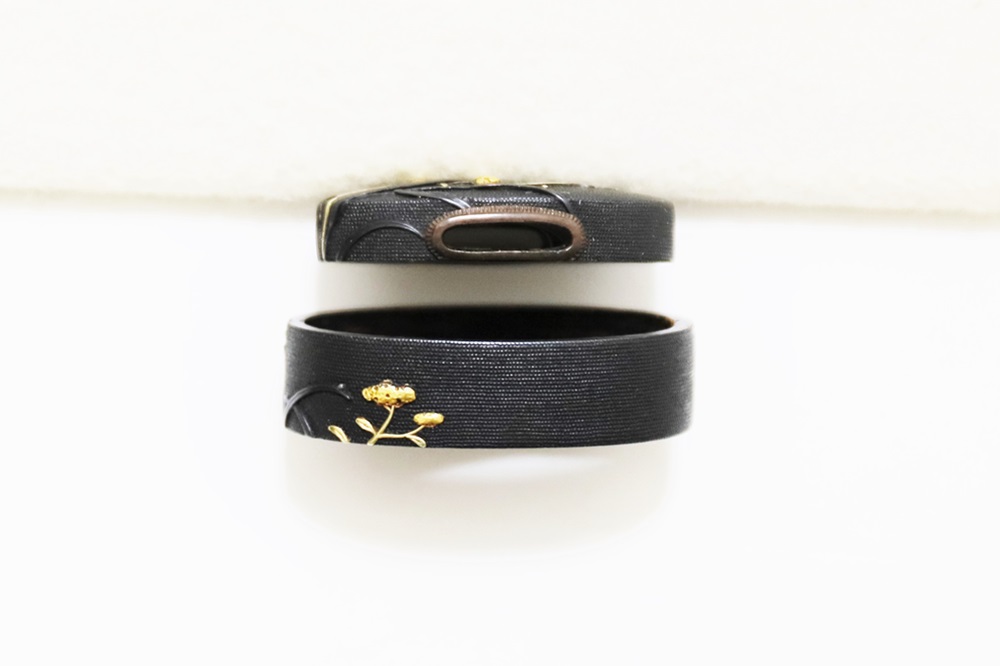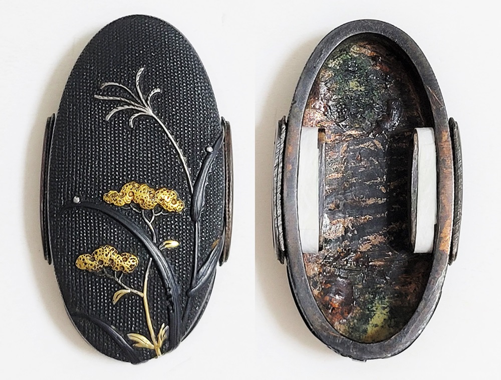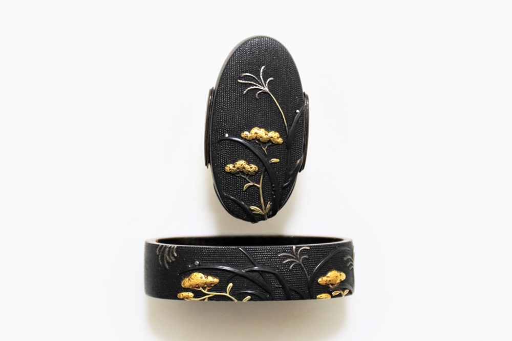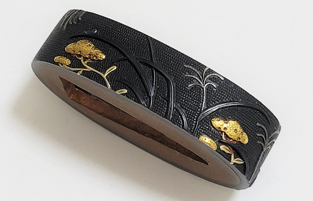 | 一乗派に極められた秋草図縁頭。後藤一乗は近世金工界第一と謳われる名匠。別家京後藤家の名門に生まれ、実兄弟に光凞(みつひろ)と光覧(みつただ)がいる。寛政十一年(1799)に9歳で八郎兵衛家の養子となり、文化二年(1805)15歳で養父謙乗の死去により八郎兵衛家六代目の家督を相続した。伝統的家彫に新味を加えて妙技であらわす他、後藤の掟に拘らない新境地の作域を開拓。名門後藤家の掉尾を飾る名工で、船田一琴、橋本一至、中川一匠など多くの優れた門弟達を輩出した。本作は微細に打たれた赤銅魚子地に上品高尚な趣で秋草をあらわす。一乗の作風が感じられる。 |