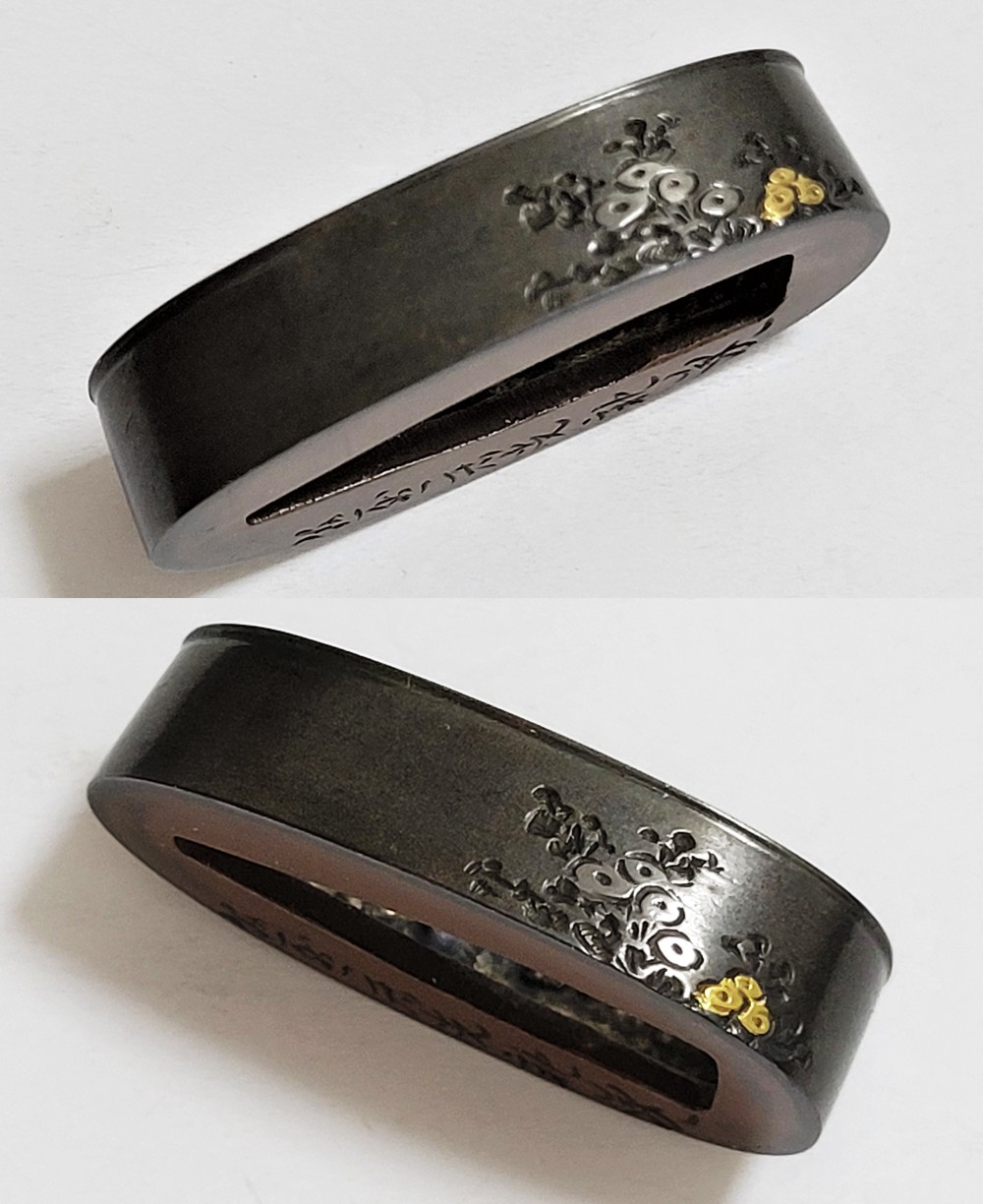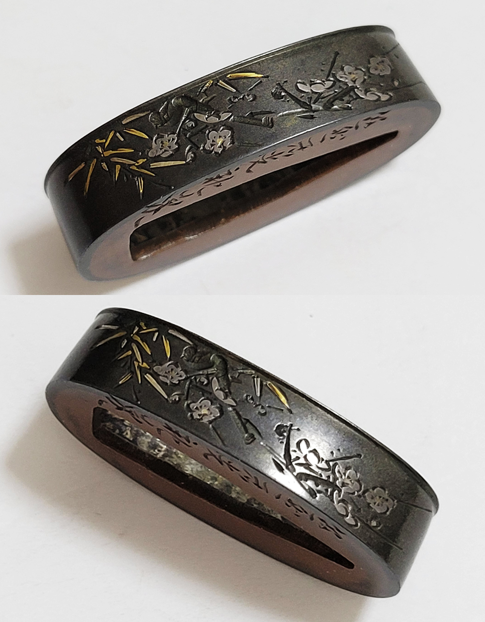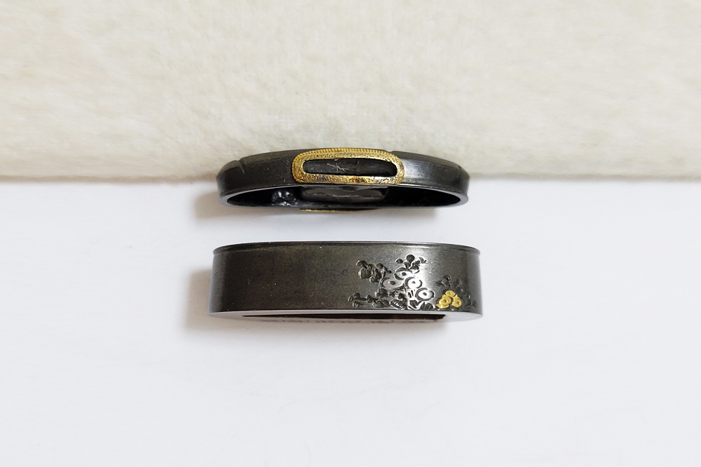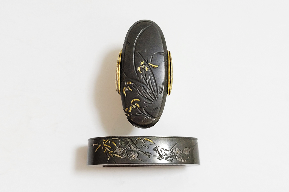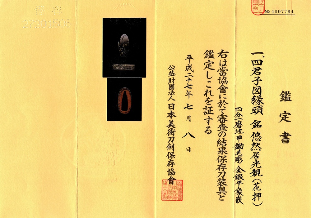 四君子は高潔な美しさを持つ梅、菊、蘭、竹の四つの植物を組み合わせた文様。君子の持つ高潔な資質とみなされ古来吉祥文様として好んで用いられた。作者の悠然居光親は鷲田氏。鷲田二代光時の子で父に学ぶ。鷲田派の最後を飾る上手。明治35年(1902)79歳没。庄内鶴岡住。本作は甲鋤毛彫に金銀平象嵌で四君子をあらわす。洗練された意匠。2015年保存刀装具審査合格。