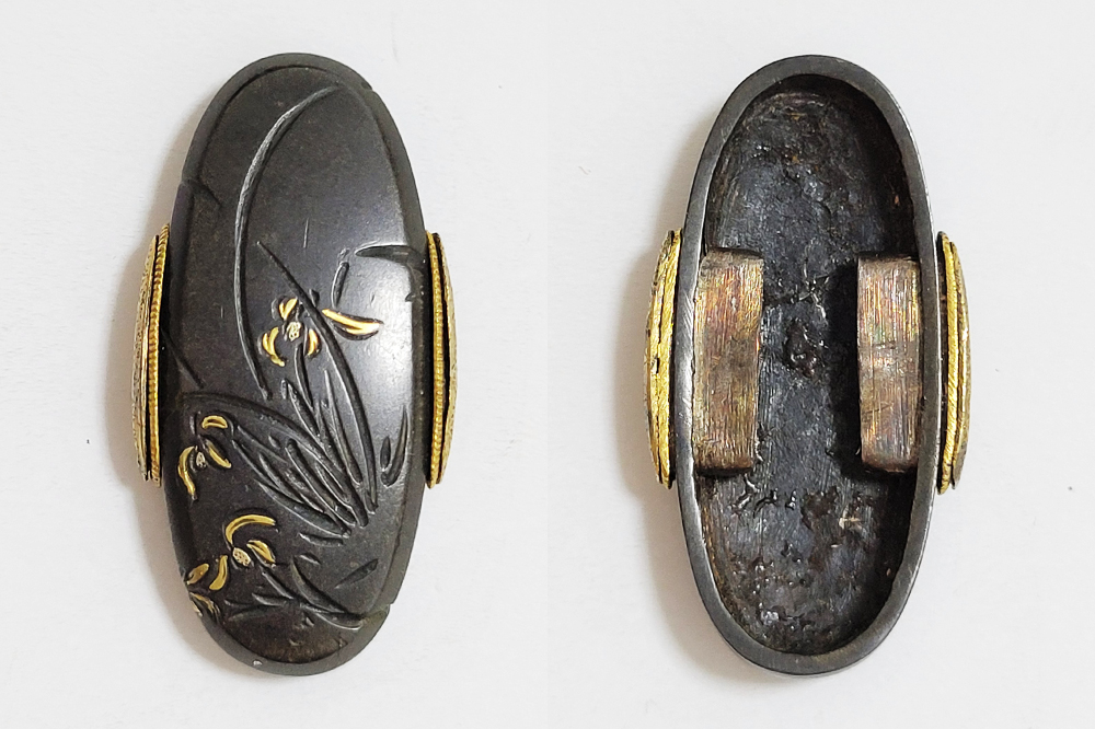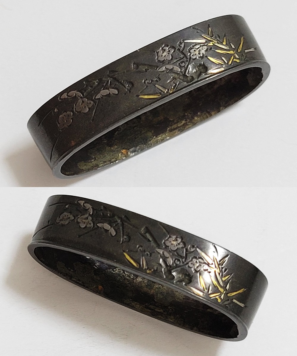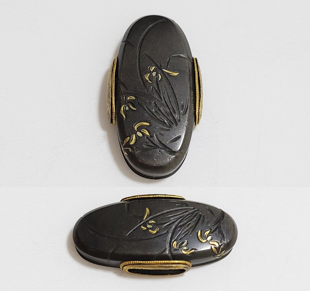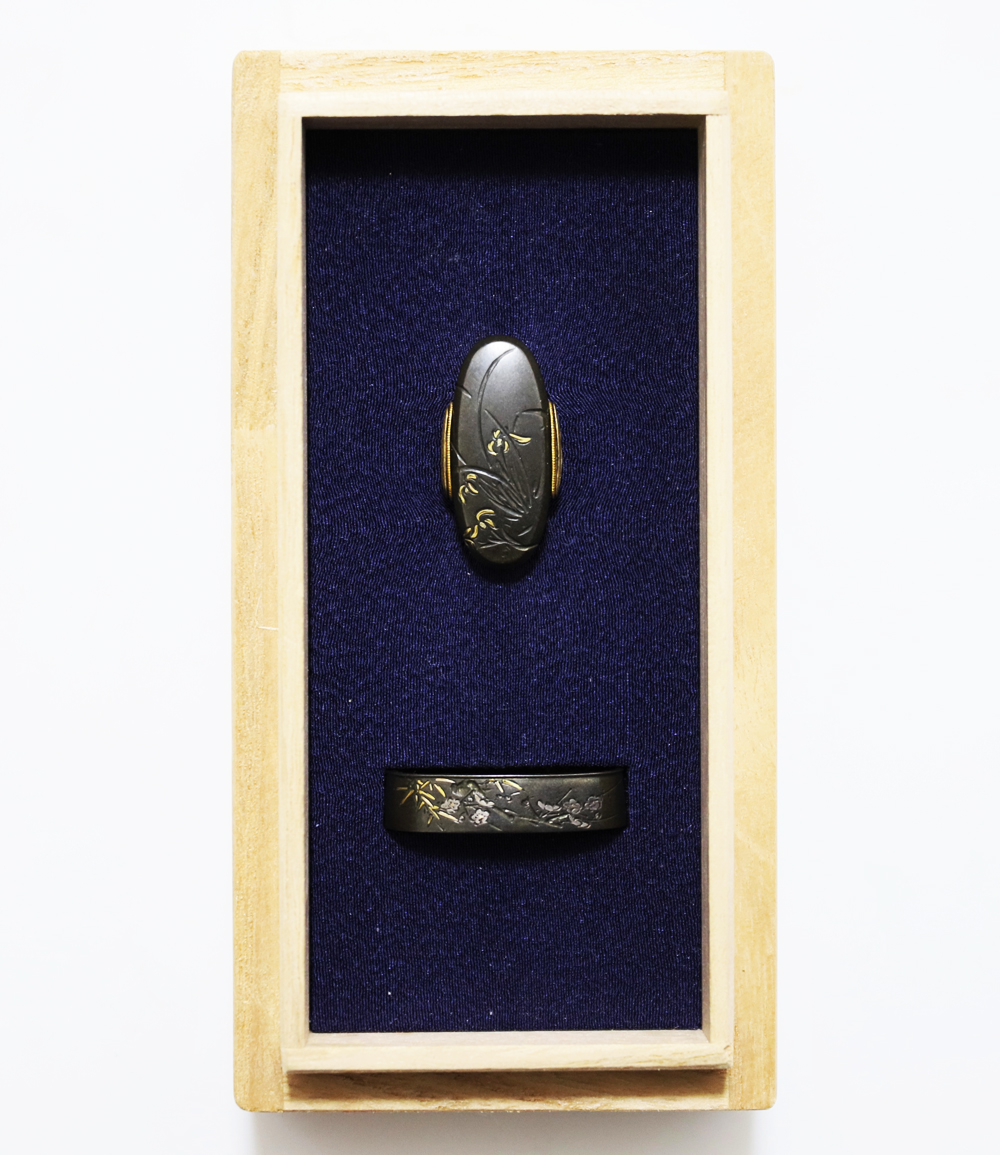 四君子は高潔な美しさを持つ梅、菊、蘭、竹の四つの植物を組み合わせた文様。君子の持つ高潔な資質とみなされ古来吉祥文様として好んで用いられた。作者の悠然居光親は鷲田氏。鷲田二代光時の子で父に学ぶ。鷲田派の最後を飾る上手。明治35年(1902)79歳没。庄内鶴岡住。本作は甲鋤毛彫に金銀平象嵌で四君子をあらわす。洗練された意匠。2015年保存刀装具審査合格。