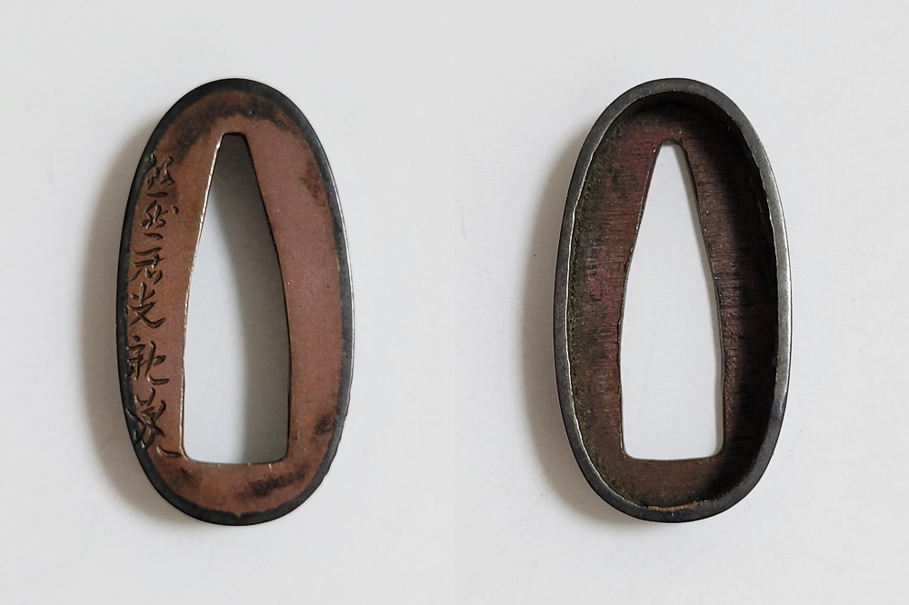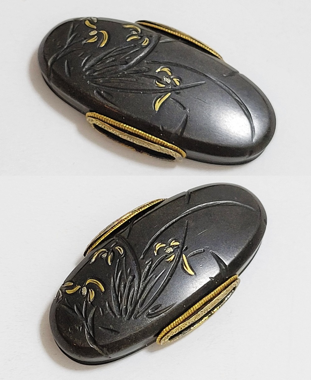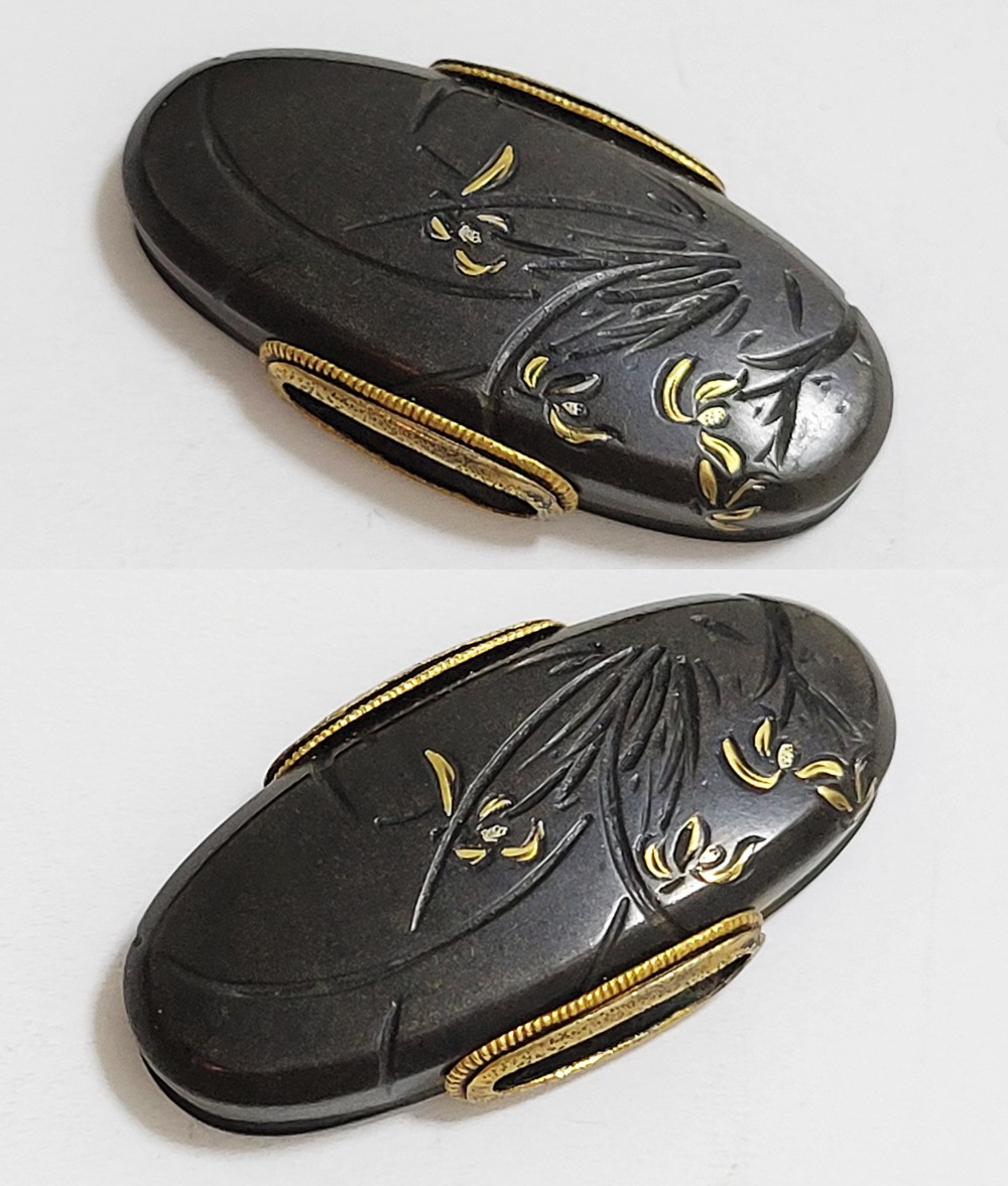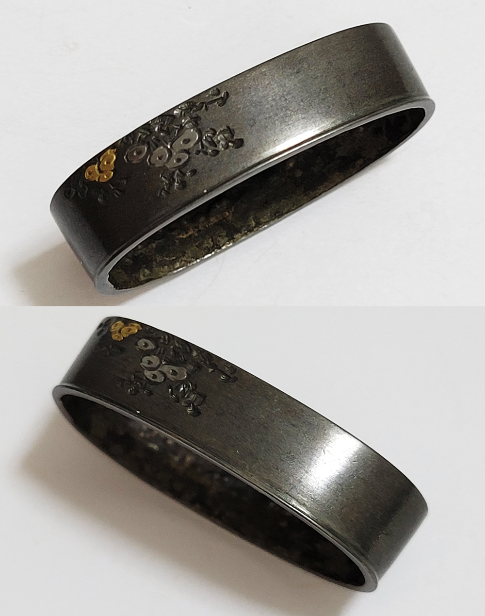 四君子は高潔な美しさを持つ梅、菊、蘭、竹の四つの植物を組み合わせた文様。君子の持つ高潔な資質とみなされ古来吉祥文様として好んで用いられた。作者の悠然居光親は鷲田氏。鷲田二代光時の子で父に学ぶ。鷲田派の最後を飾る上手。明治35年(1902)79歳没。庄内鶴岡住。本作は甲鋤毛彫に金銀平象嵌で四君子をあらわす。洗練された意匠。2015年保存刀装具審査合格。