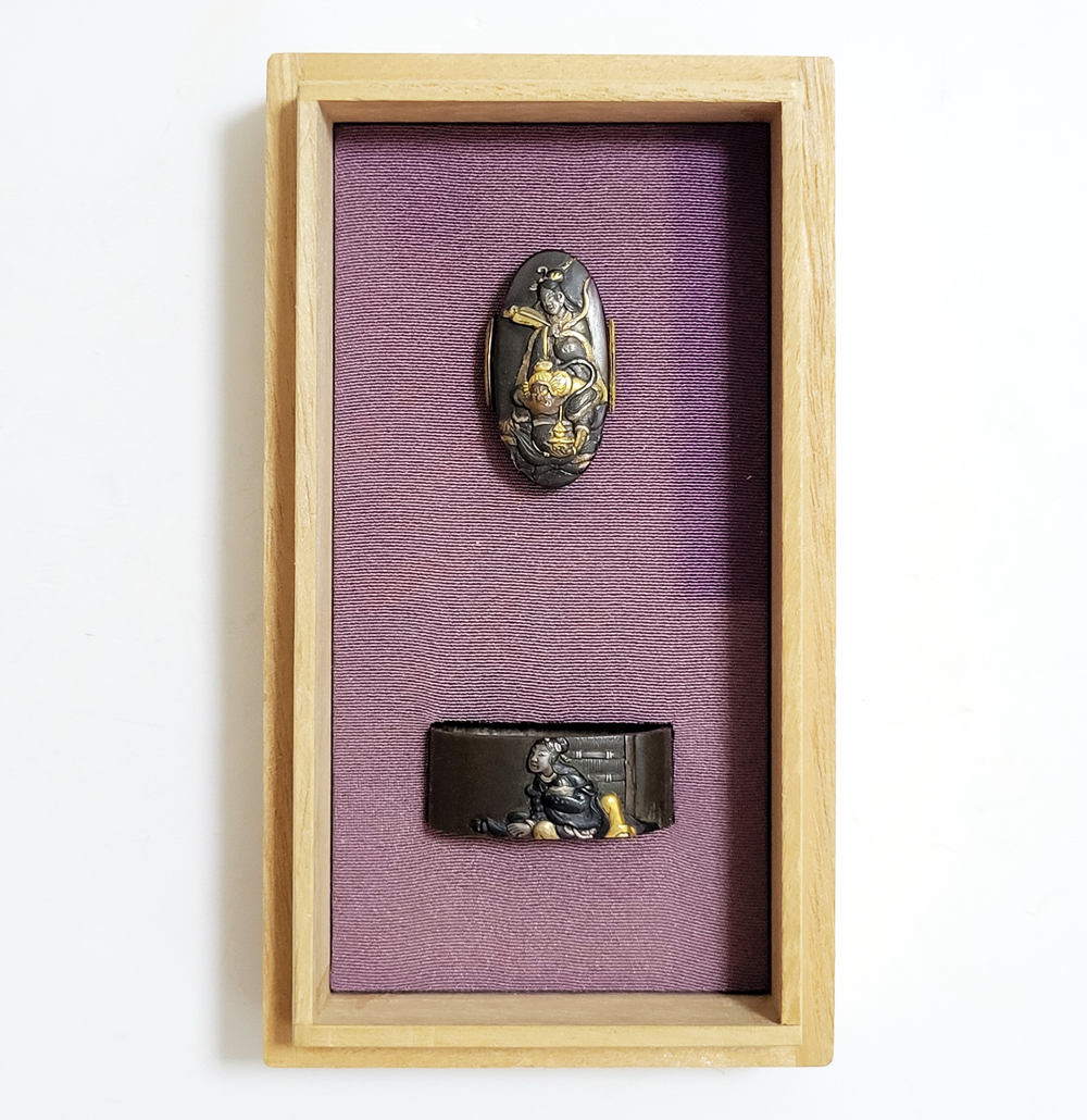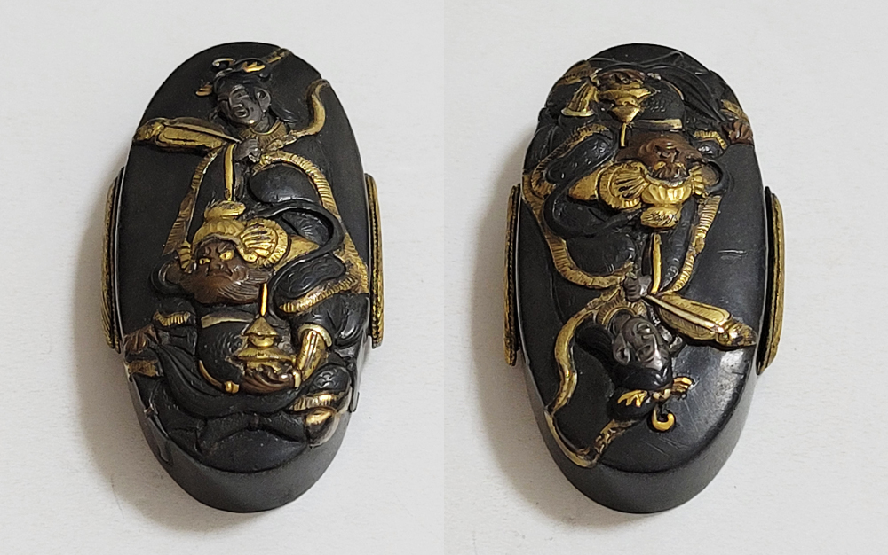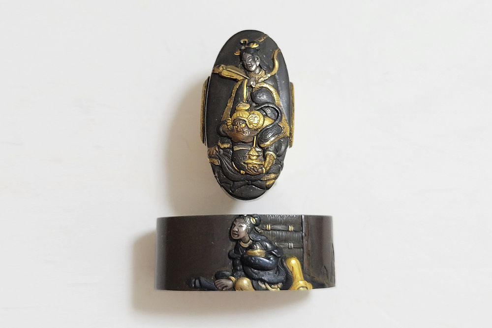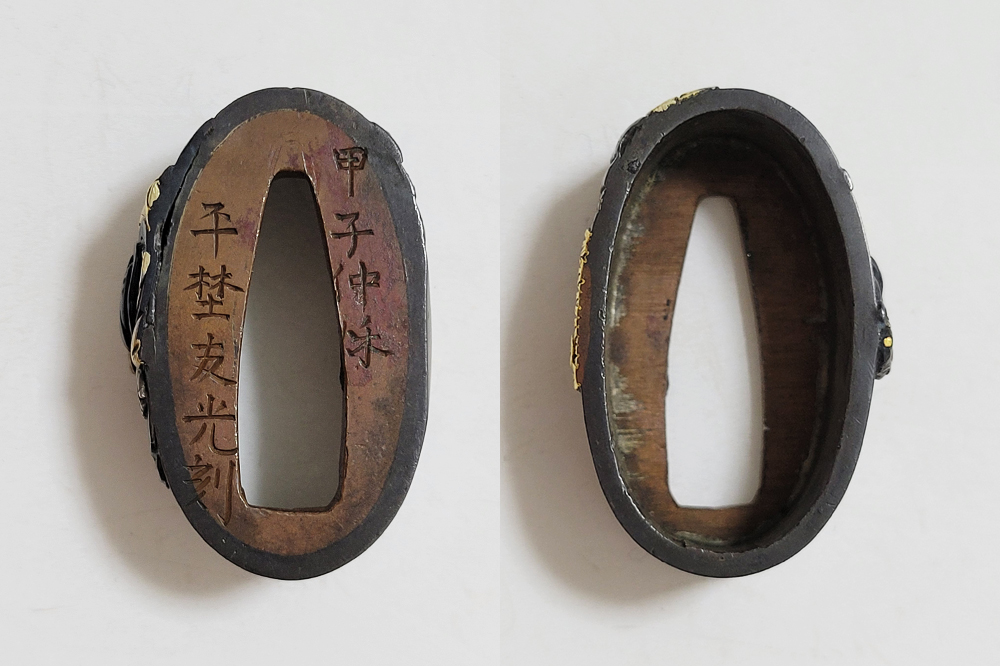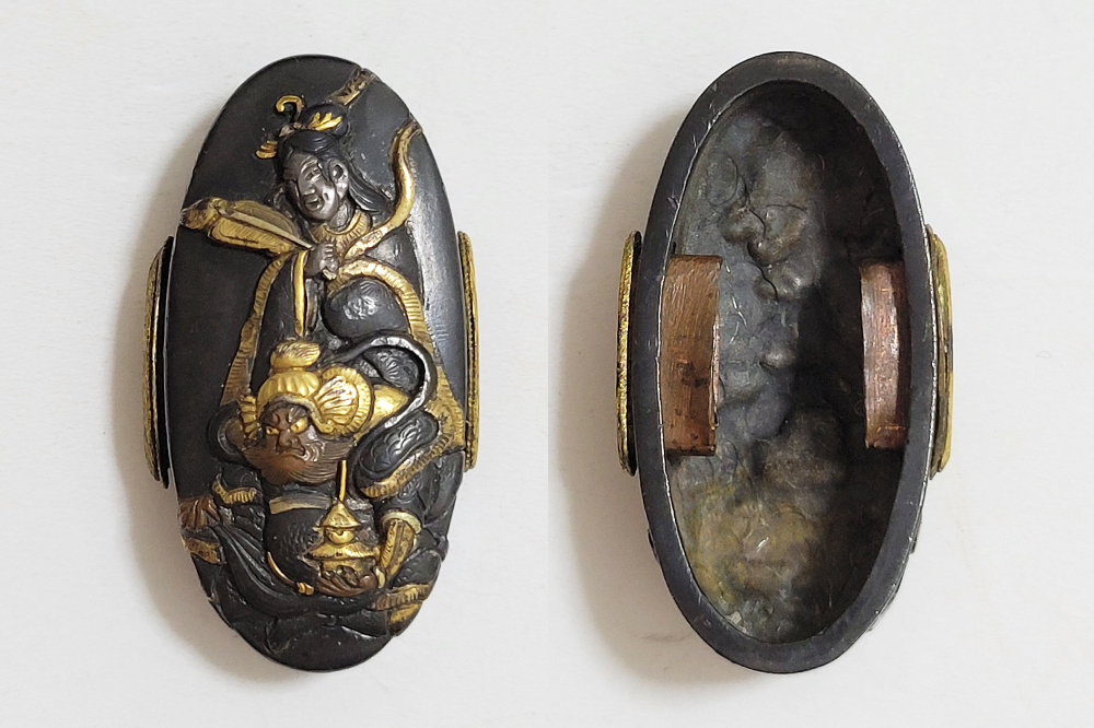 | 縁に人物、頭に弁財天と毘沙門天(多聞天とも)をあらわす。弁財天は音楽や弁才、毘沙門天は武勇や開運のご利益をもつ七福神の二柱。信仰して二柱よりご加護を受ける者の場面であろうか。本作者の平埜友光は江戸後期、水戸住。一柳友善の門人である友春の次男として水戸で生まれてのちに分家独立した平埜友道の実子。銘の甲子は文化元年(1804)。 |