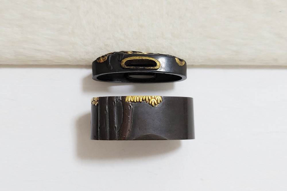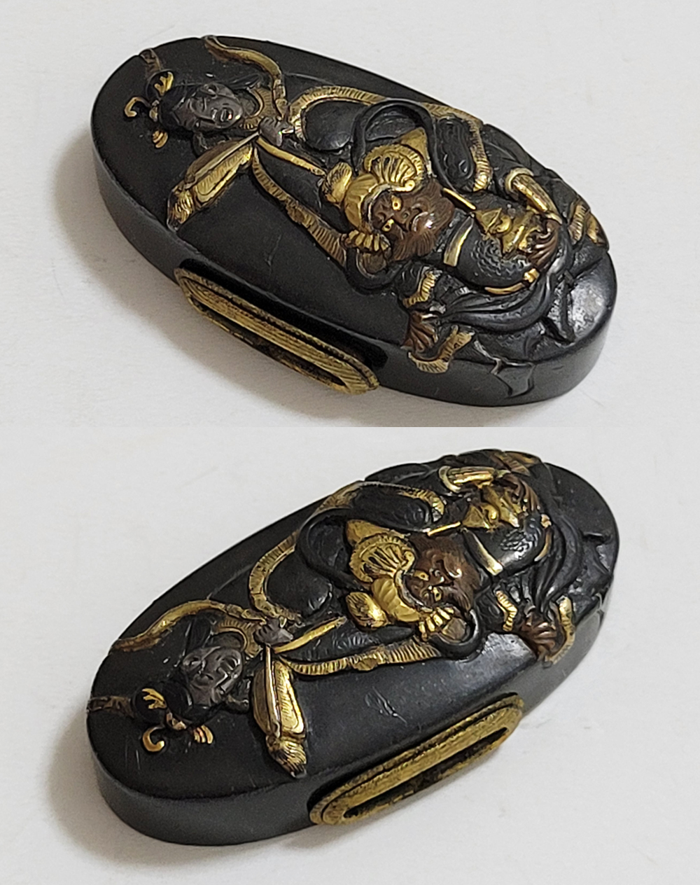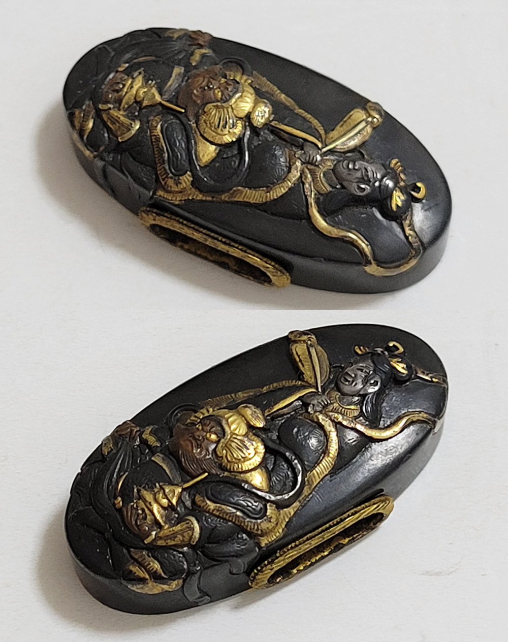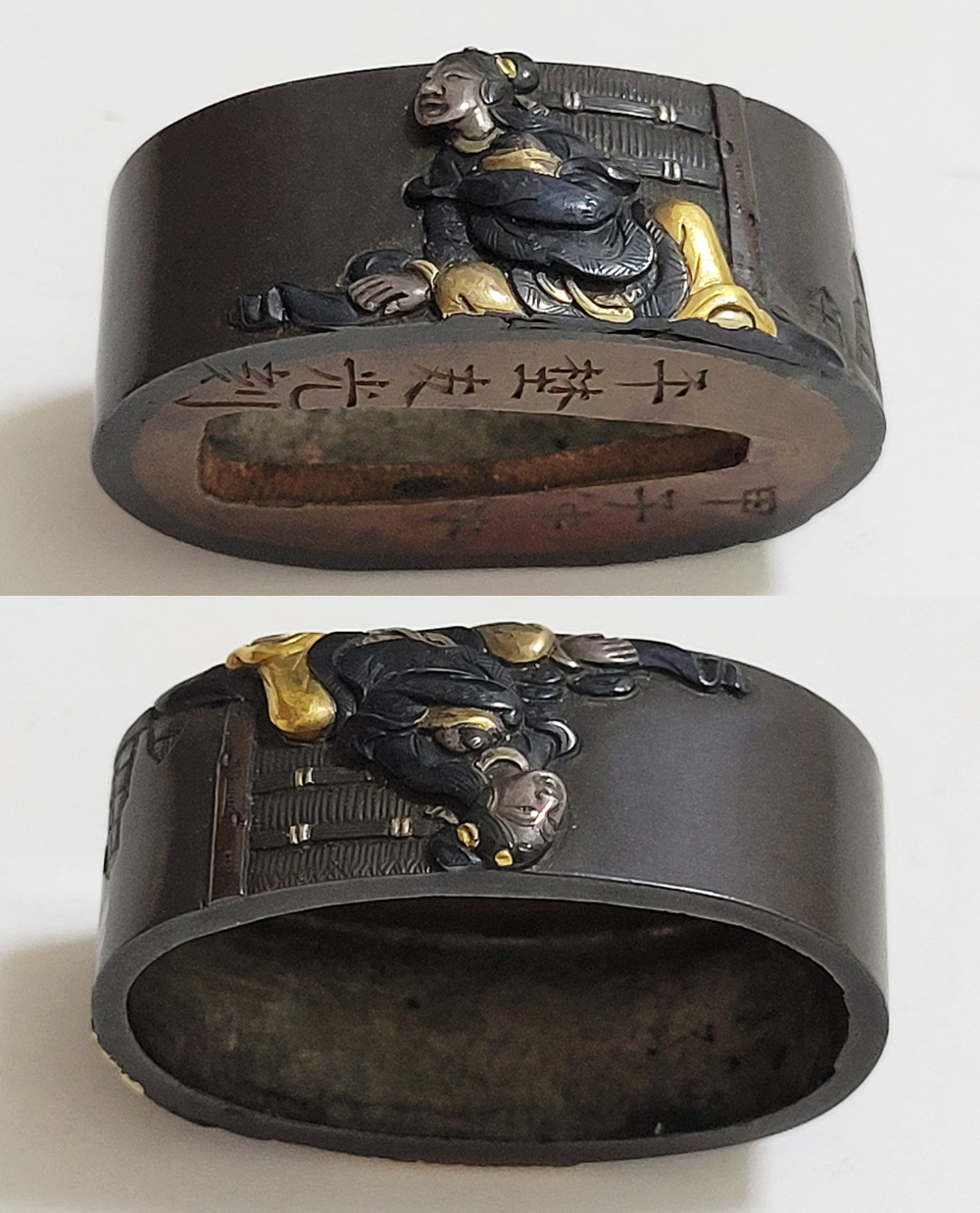 | 縁に人物、頭に弁財天と毘沙門天(多聞天とも)をあらわす。弁財天は音楽や弁才、毘沙門天は武勇や開運のご利益をもつ七福神の二柱。信仰して二柱よりご加護を受ける者の場面であろうか。本作者の平埜友光は江戸後期、水戸住。一柳友善の門人である友春の次男として水戸で生まれてのちに分家独立した平埜友道の実子。銘の甲子は文化元年(1804)。 |