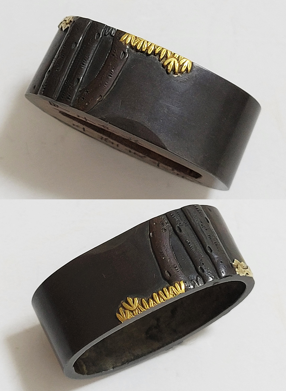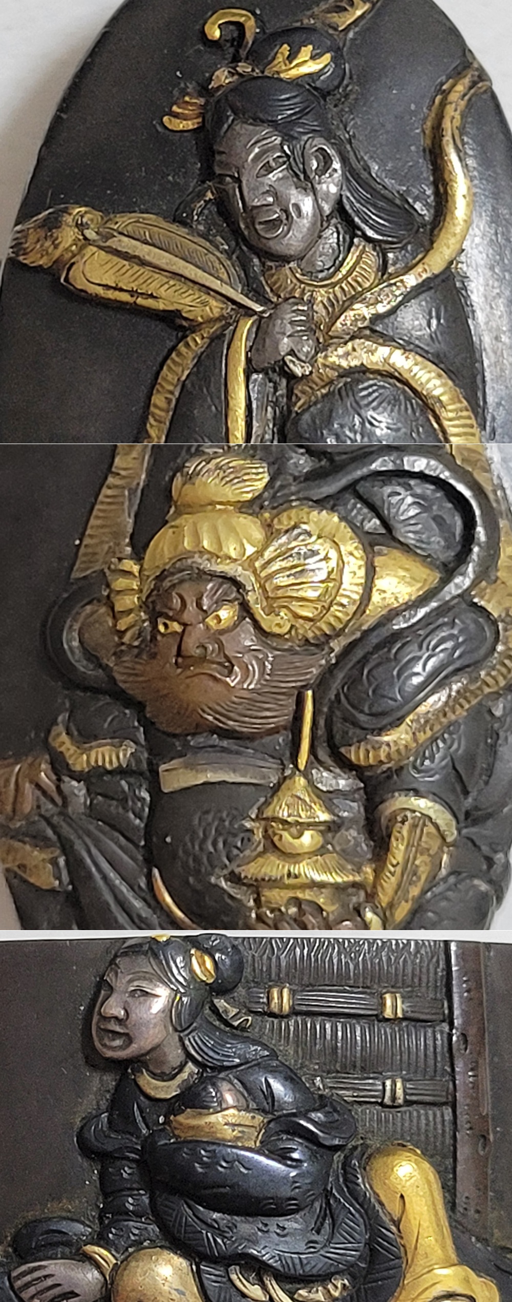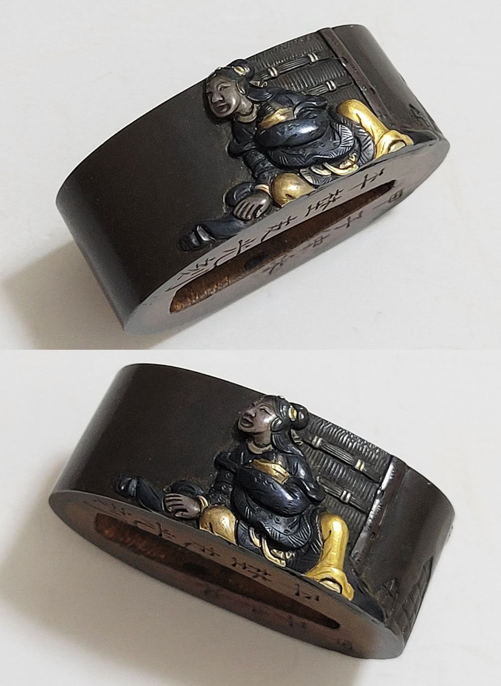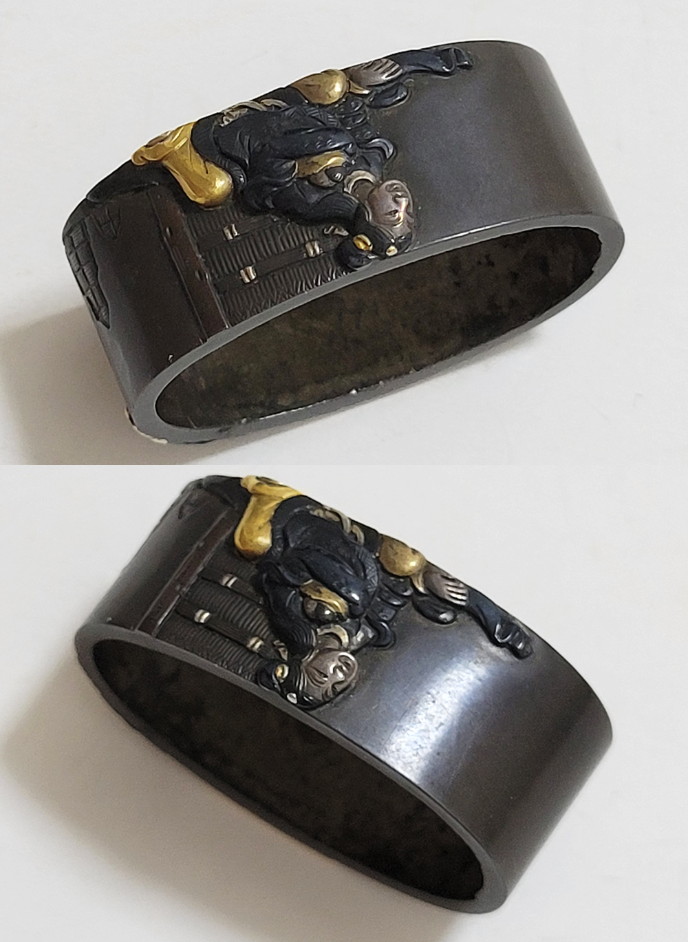 | 縁に人物、頭に弁財天と毘沙門天(多聞天とも)をあらわす。弁財天は音楽や弁才、毘沙門天は武勇や開運のご利益をもつ七福神の二柱。信仰して二柱よりご加護を受ける者の場面であろうか。本作者の平埜友光は江戸後期、水戸住。一柳友善の門人である友春の次男として水戸で生まれてのちに分家独立した平埜友道の実子。銘の甲子は文化元年(1804)。 |