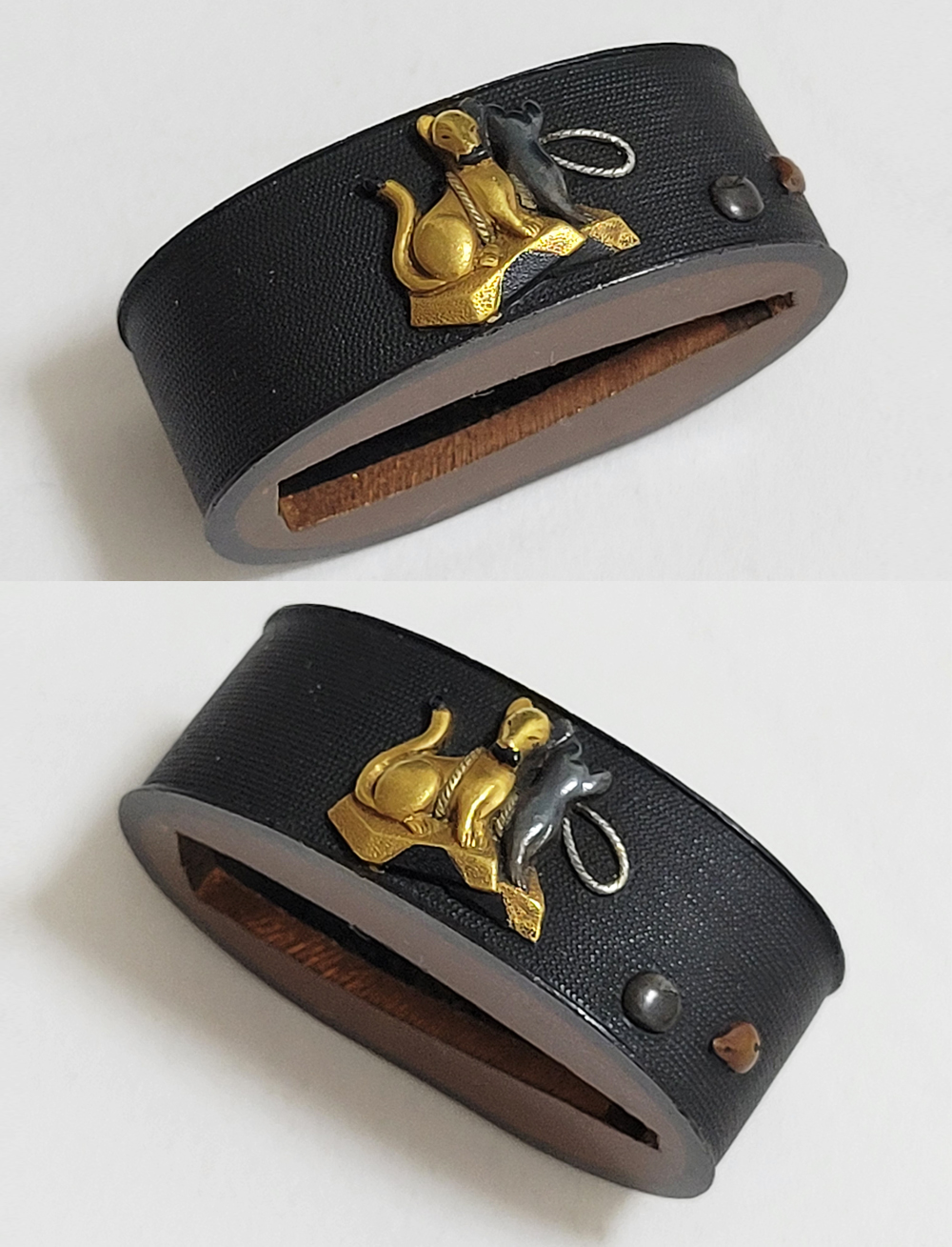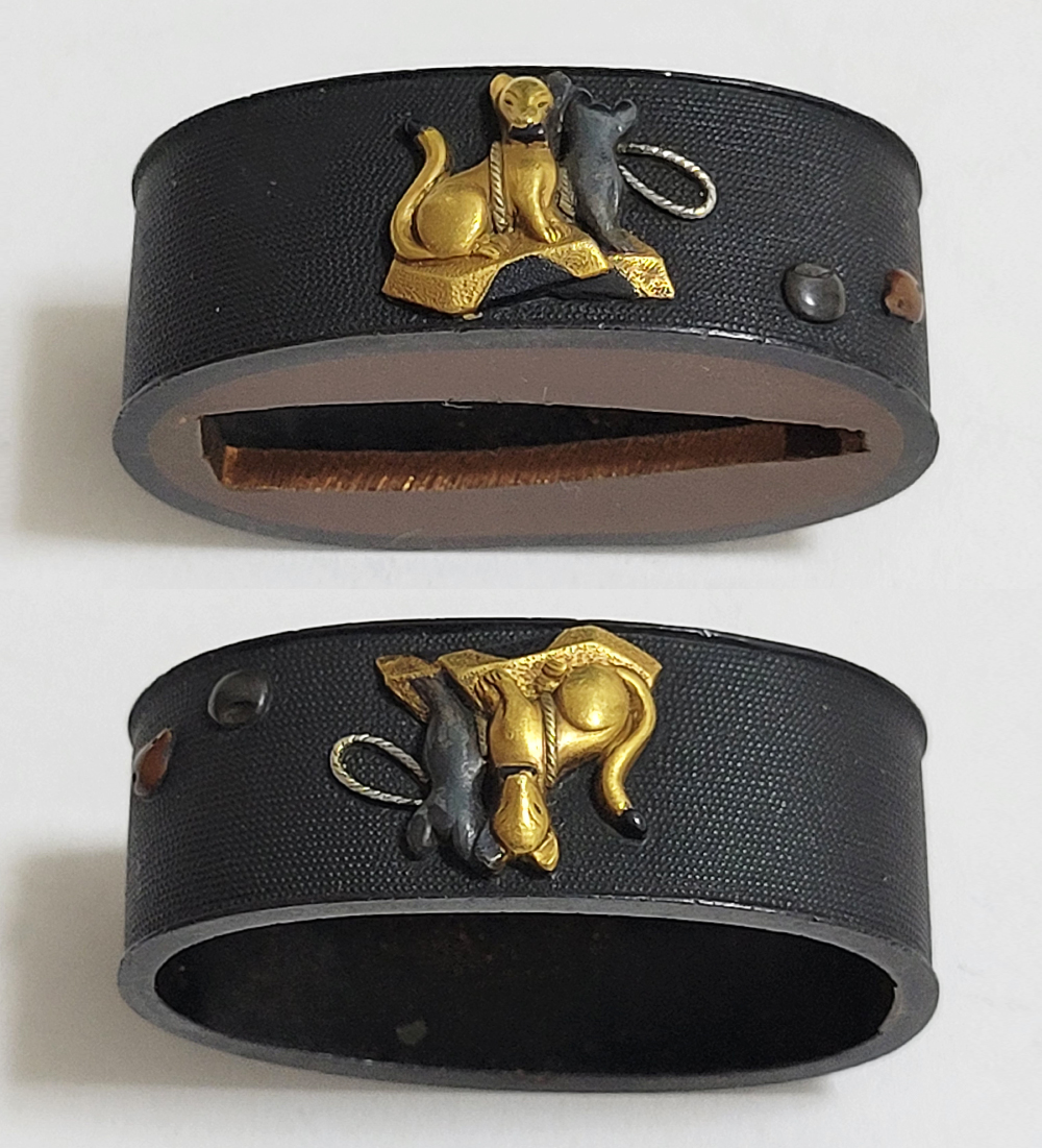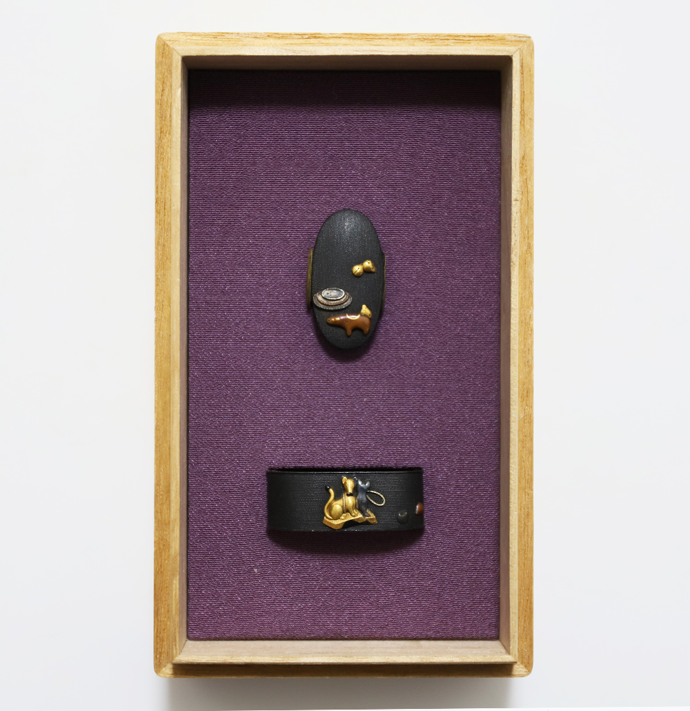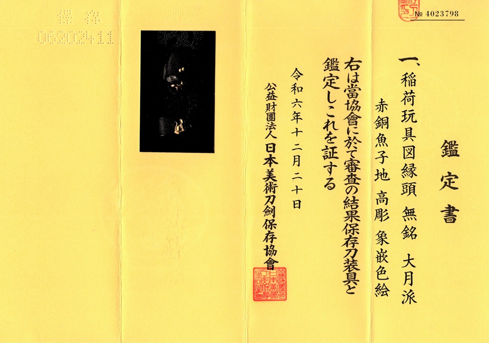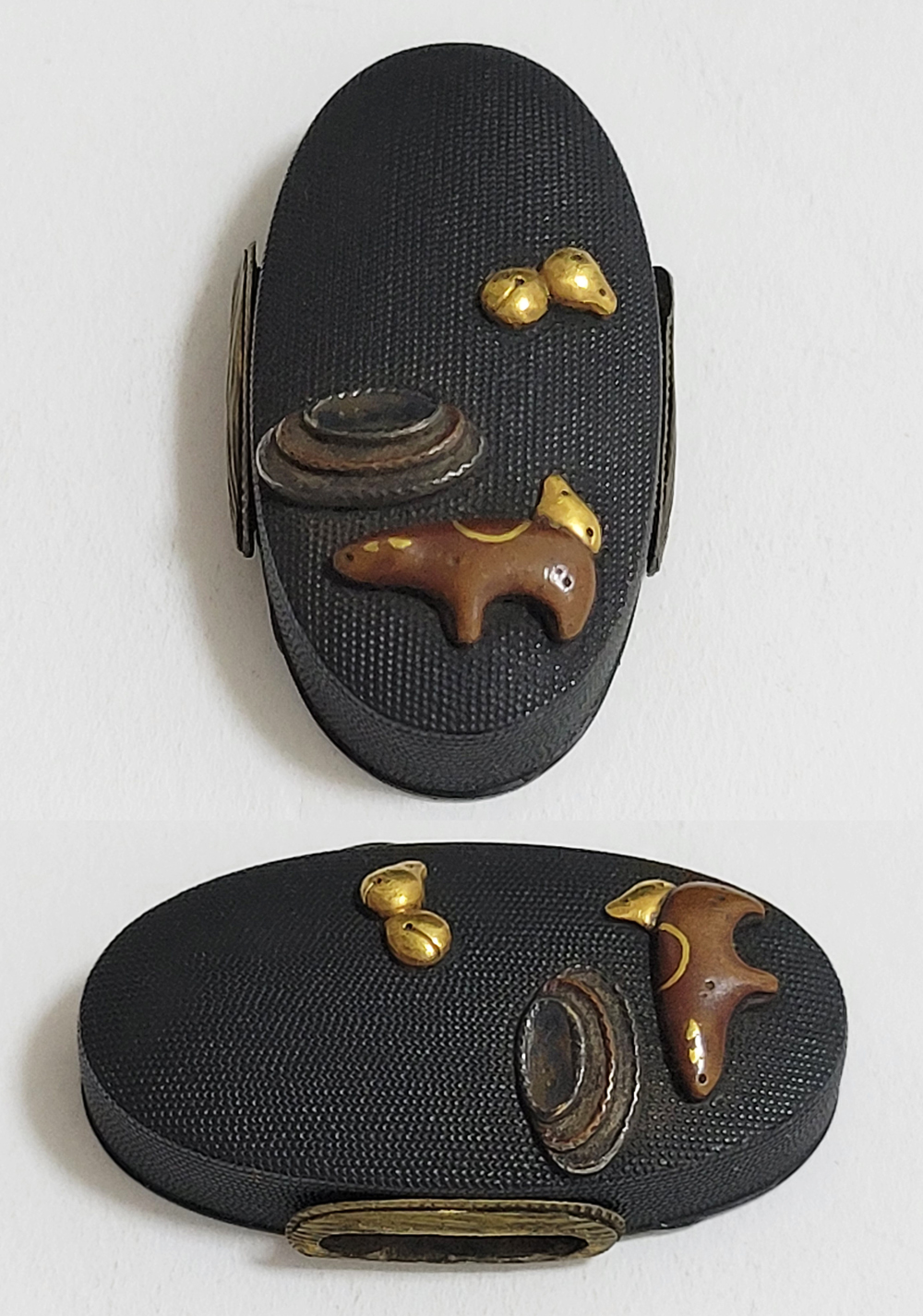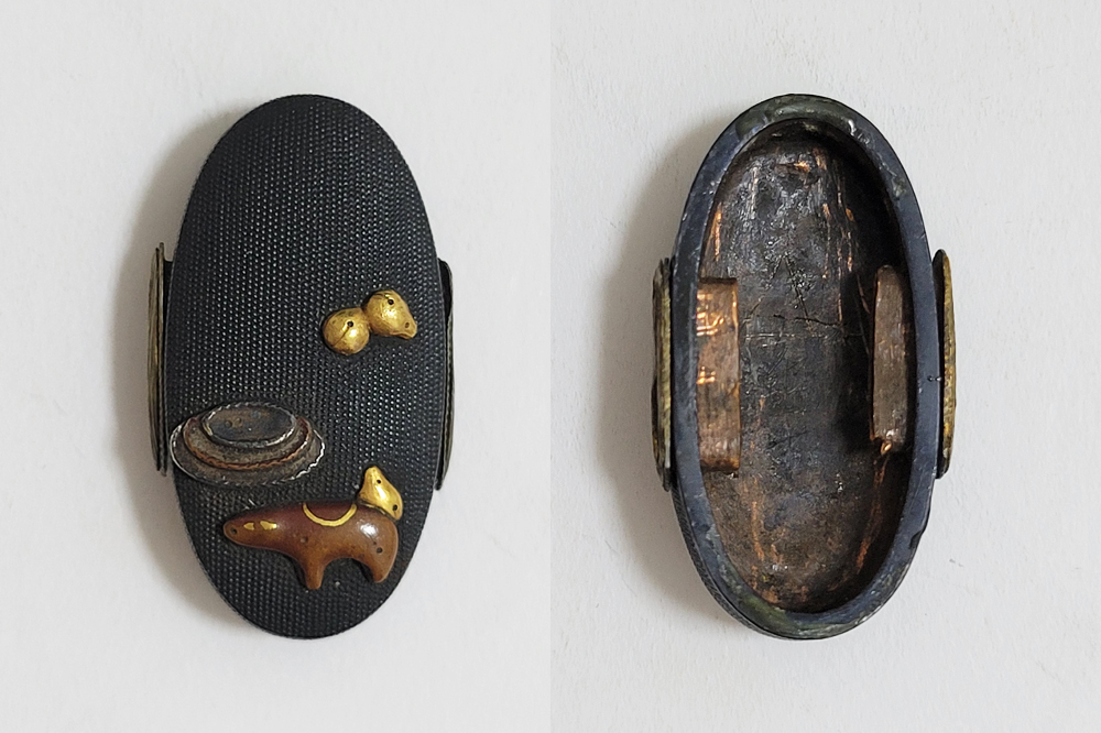 | 無銘ながら大月派に極められた縁頭。大月派は名工四代大月光興によって大いに隆盛した江戸後期、京都の一門。精巧で堅実な彫法で奇抜、禅味のある作風を遺す。本作は、鉄砲狐、張り子人形、貝合わせ、鈴であろうか。江戸時代の玩具を赤銅魚子地に高彫象嵌色絵であらわす。出来が良い。2024年保存刀装具審査合格。 |
