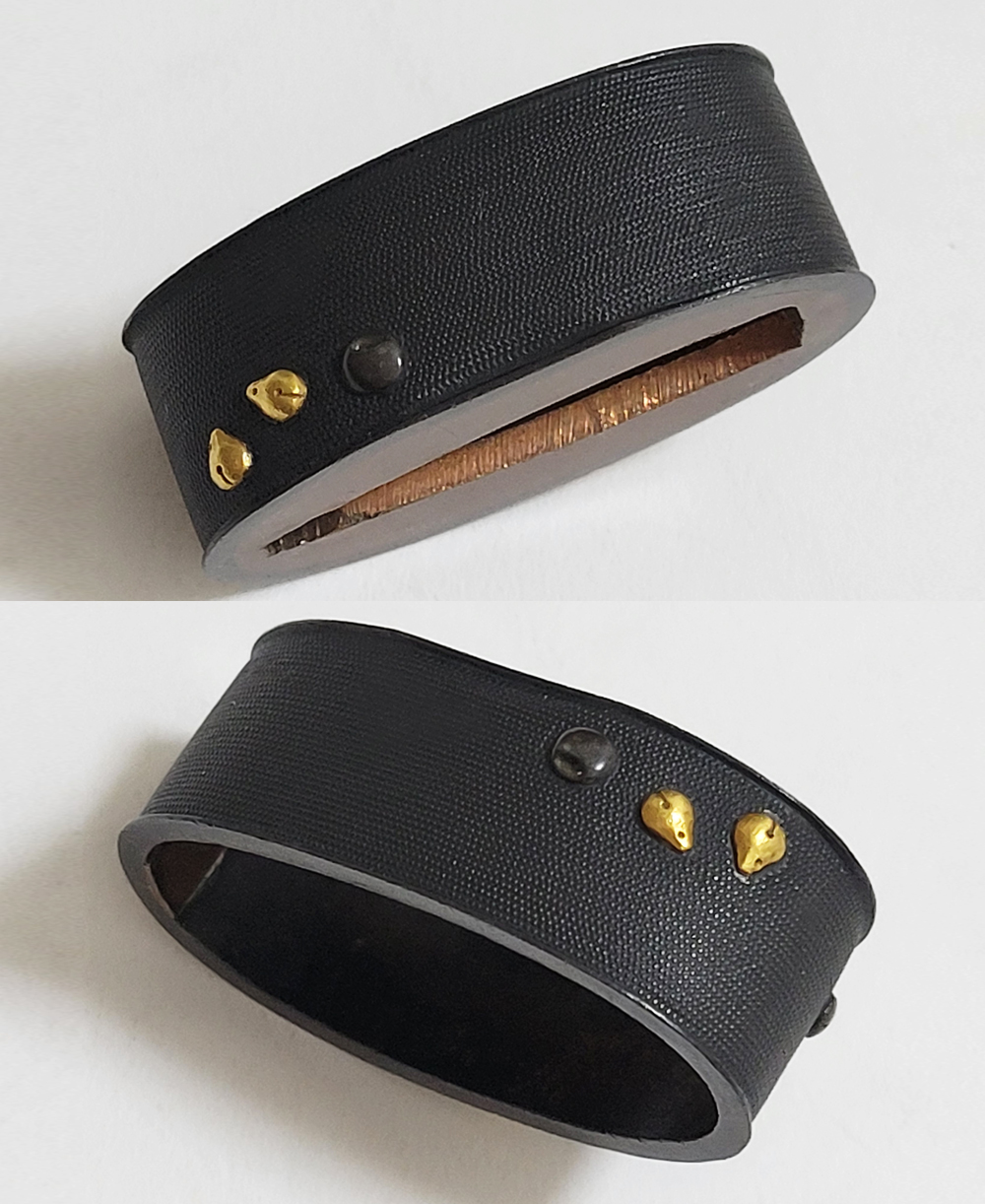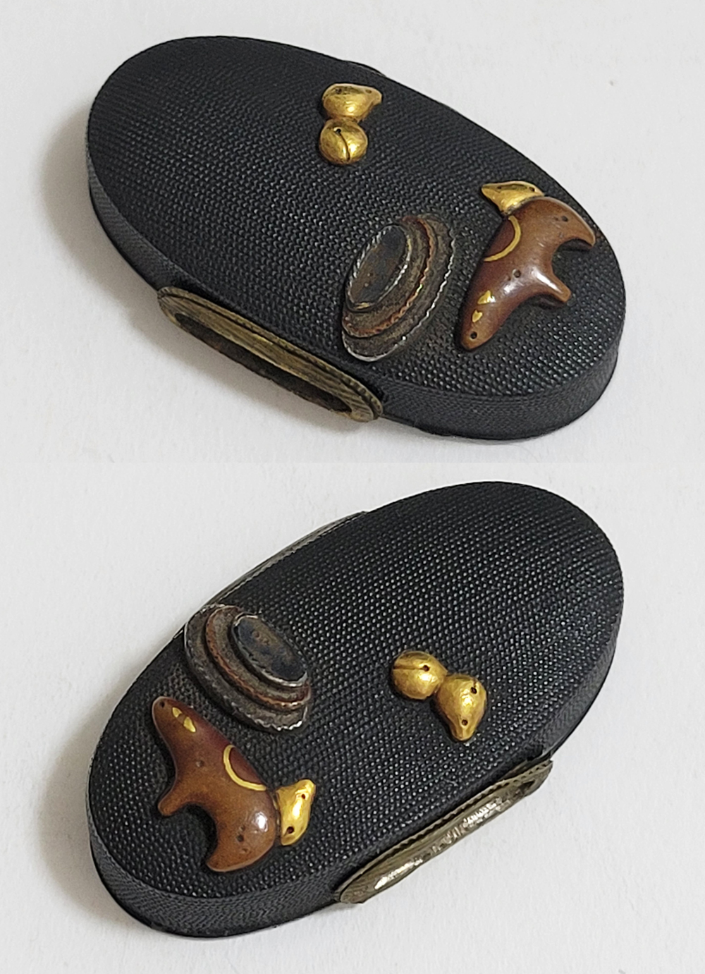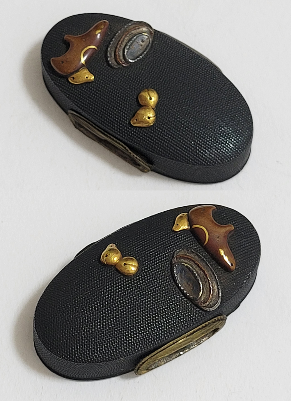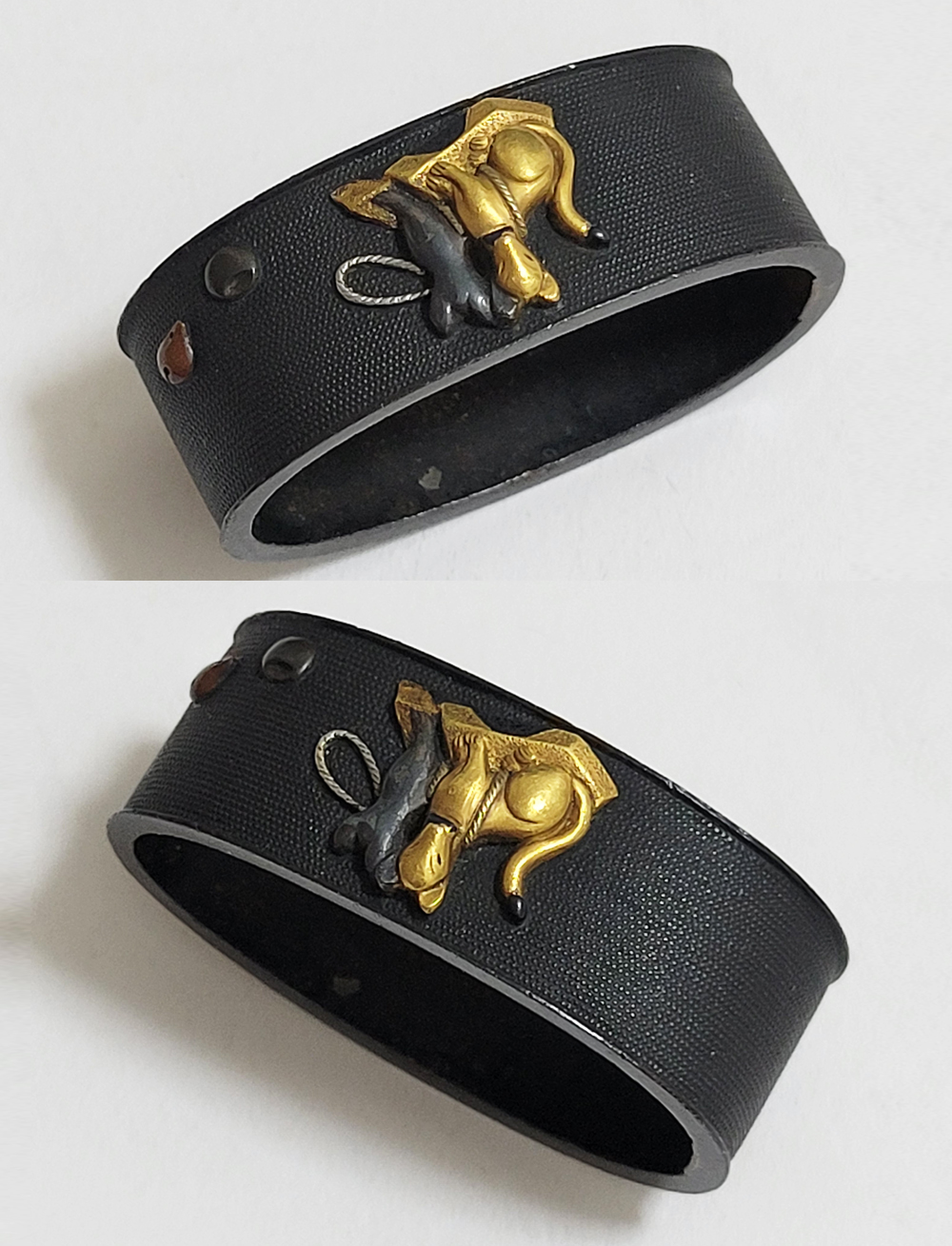 | 無銘ながら大月派に極められた縁頭。大月派は名工四代大月光興によって大いに隆盛した江戸後期、京都の一門。精巧で堅実な彫法で奇抜、禅味のある作風を遺す。本作は、鉄砲狐、張り子人形、貝合わせ、鈴であろうか。江戸時代の玩具を赤銅魚子地に高彫象嵌色絵であらわす。出来が良い。2024年保存刀装具審査合格。 |