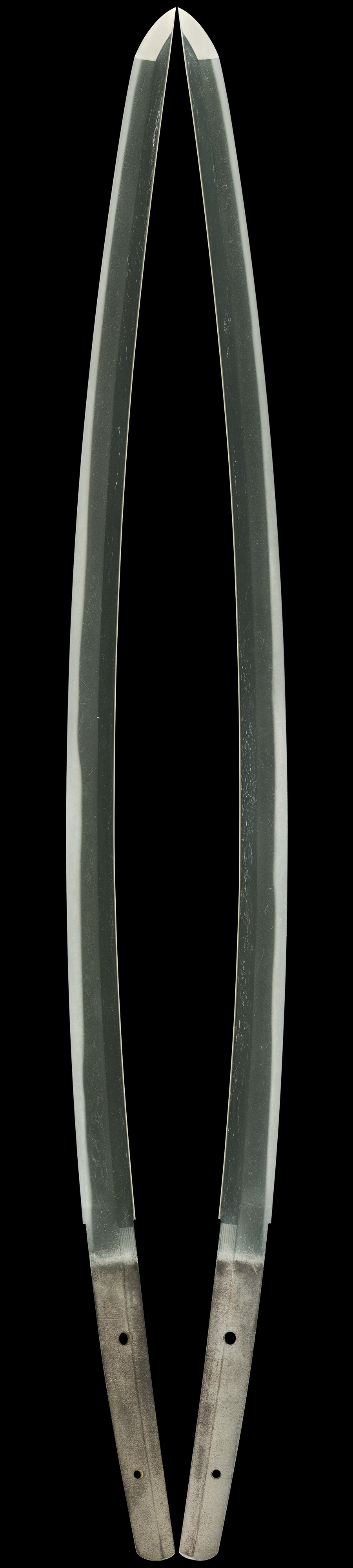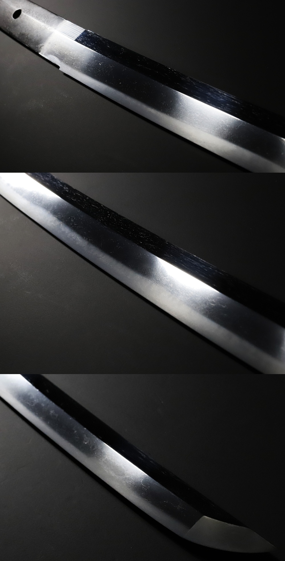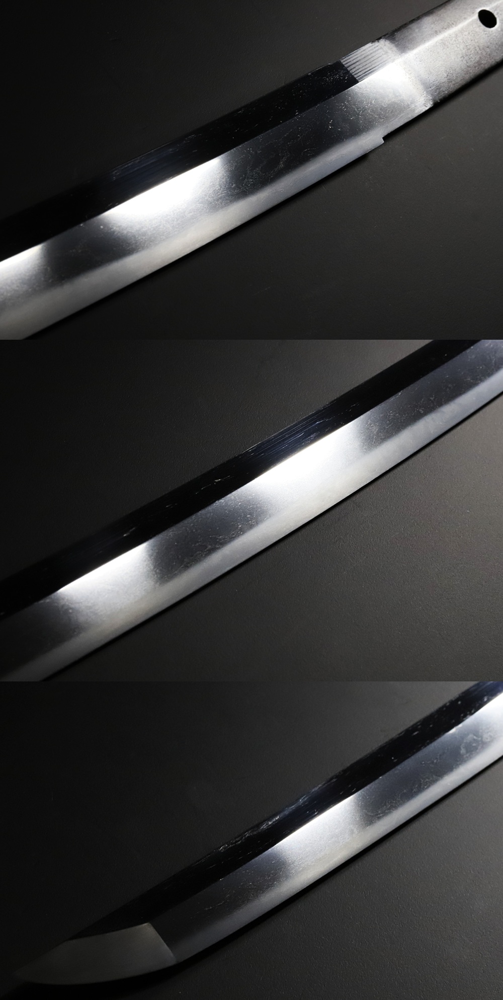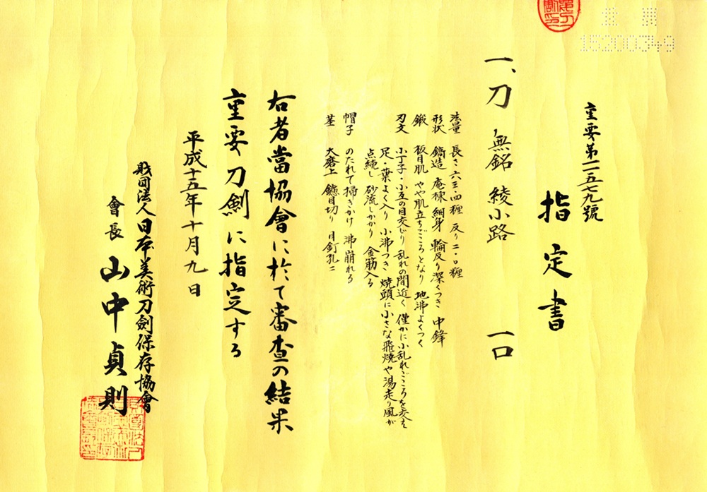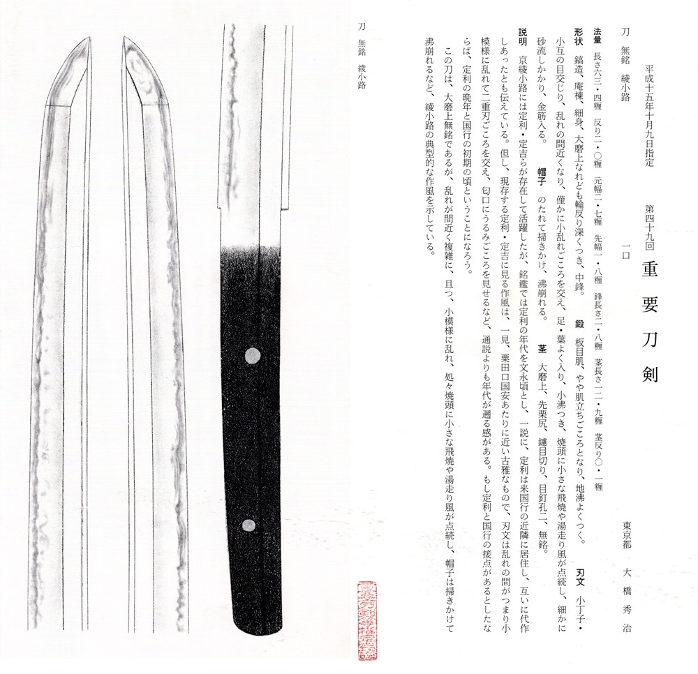 | 本作は平成15年(2003年・第49回)指定重要刀剣。綾小路に極められた大磨上無銘の刀。綾小路(あやのこうじ)は鎌倉時代中期の文永(1264)頃、京都の綾小路に居住していた定利を始祖とする刀工群。在銘で現存するものは定利・定吉のみ。作風は、古雅で身幅が狭く優美な反りの強い太刀姿。刃文は小沸本位の小乱れ、小丁子、小互の目が連れて交じる。鍛えは板目やや肌立つ。本作は、乱れが間近く複雑に、且つ小模様に乱れ、所々焼頭に小さな飛焼きや湯走り風が点続し、帽子は掃き掛けて沸崩れるなど、綾小路の典型的な作風を示している。 |