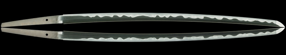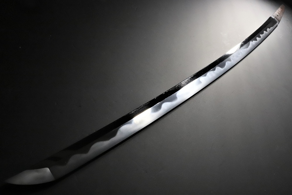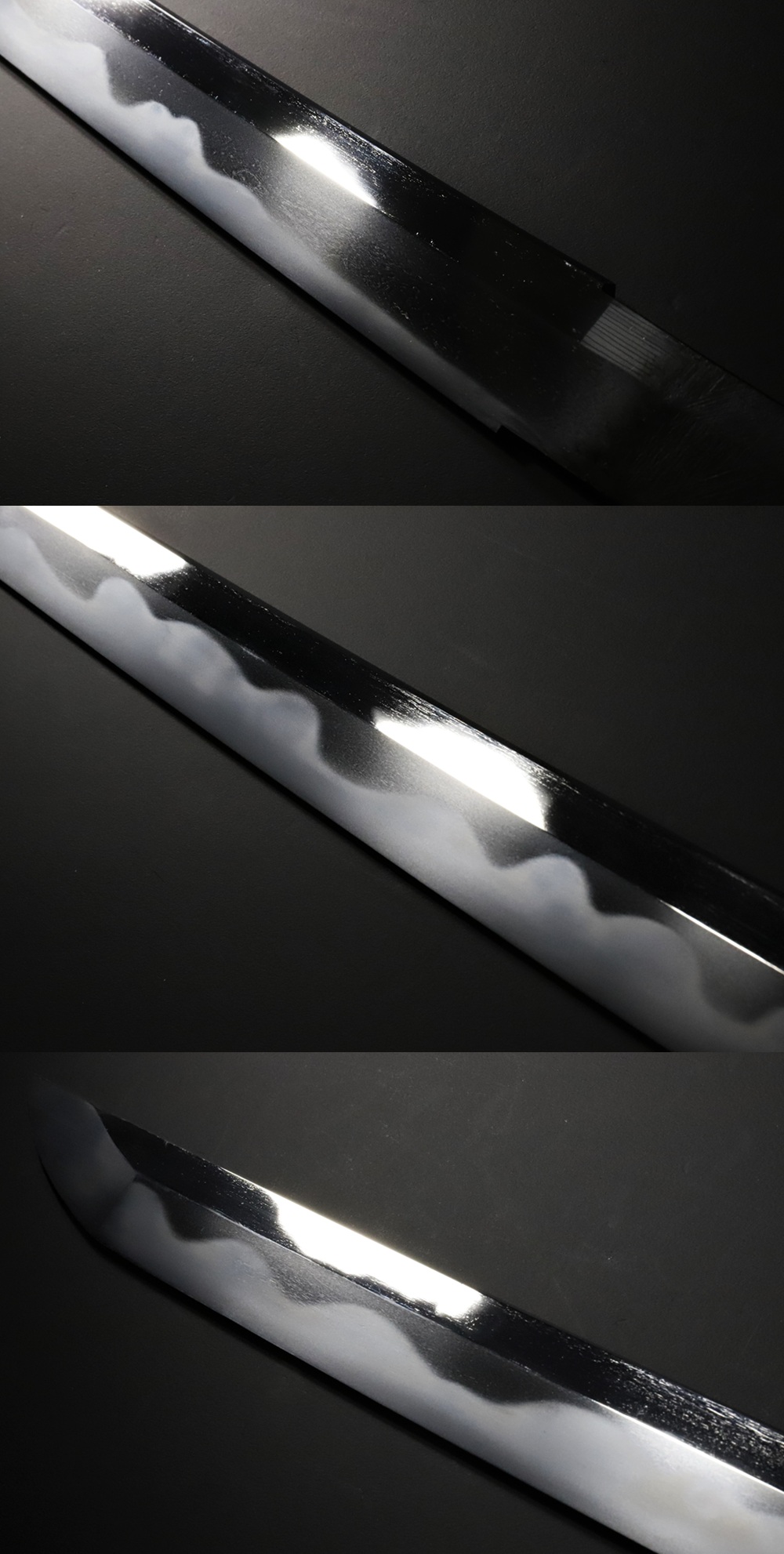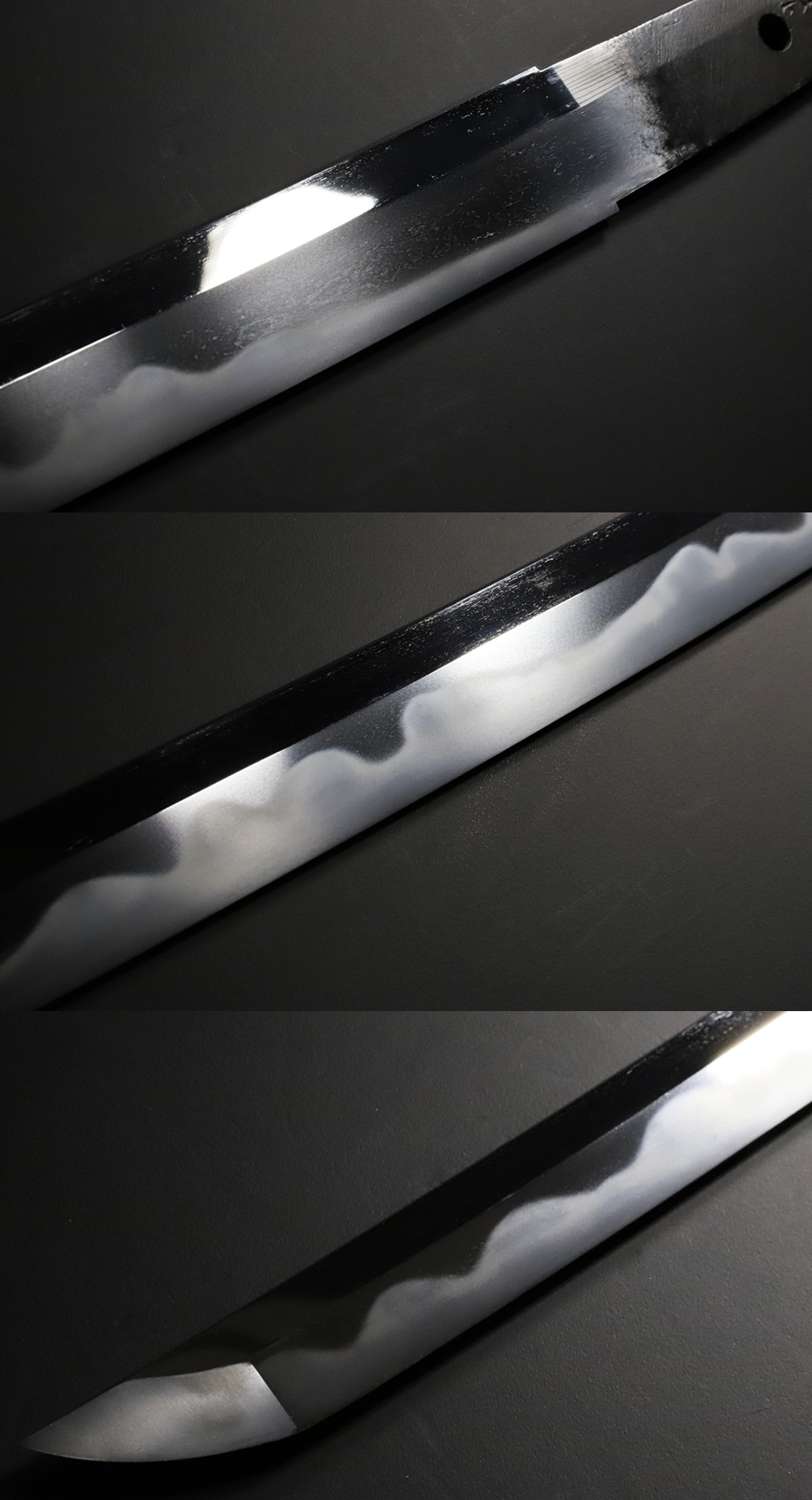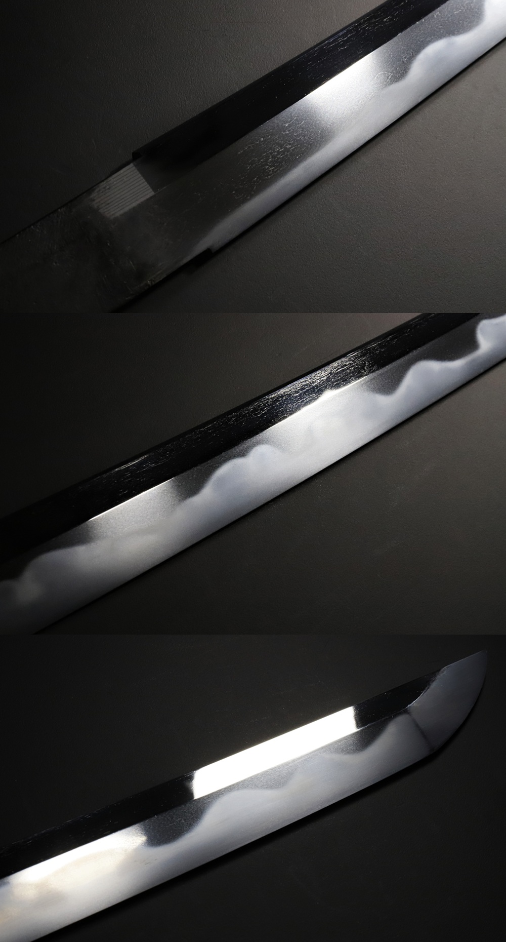 | 刃文 | 直焼出し伴う大互の目乱れ、匂口冴えて 矢筈刃風の刃文交じり濤乱風となり 匂深く 小沸厚く付き 飛焼き状の玉をみる |