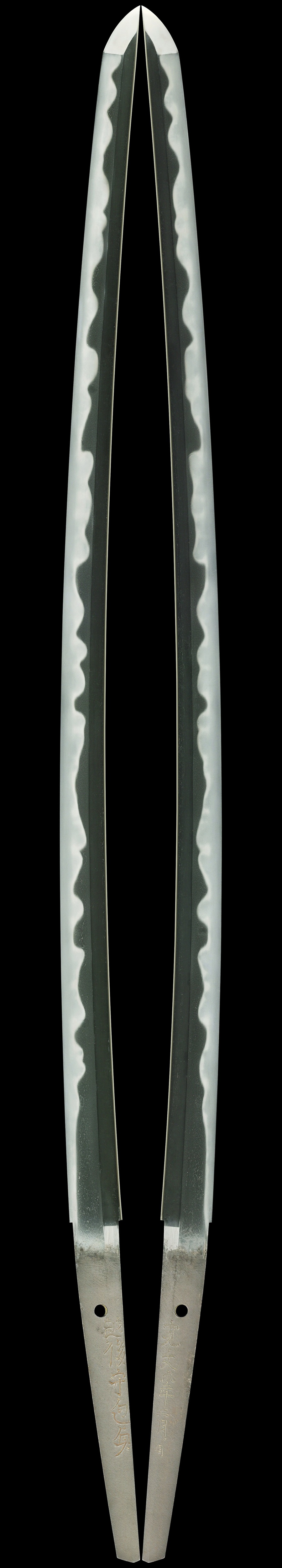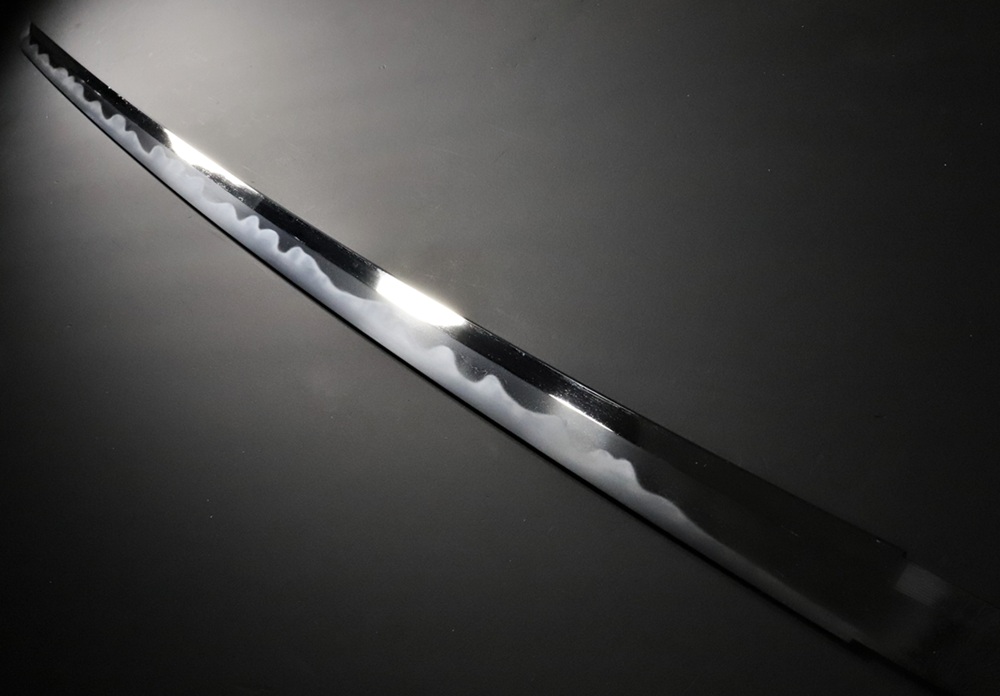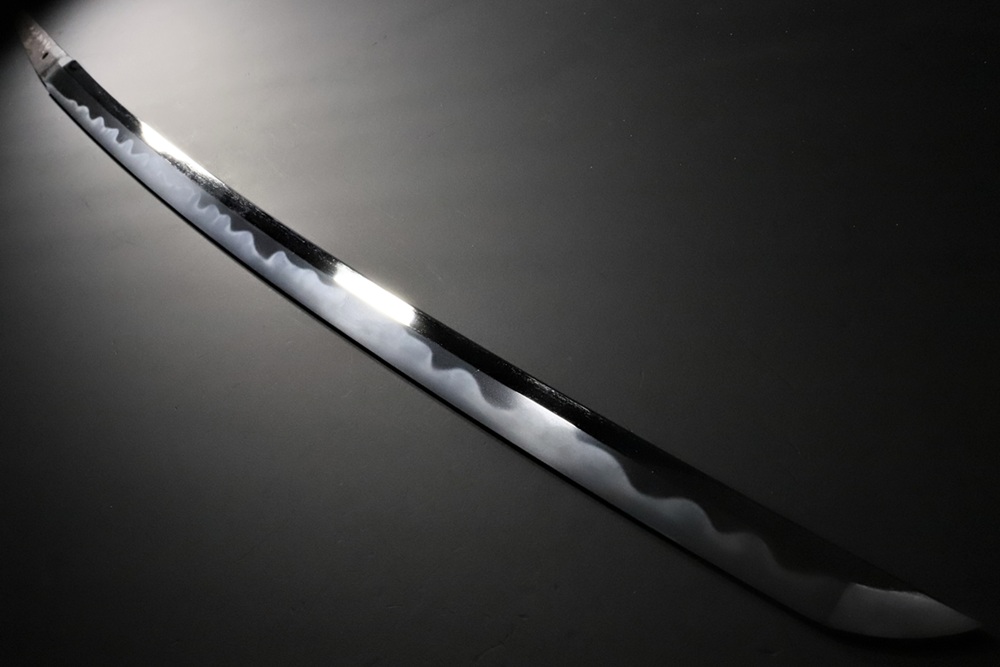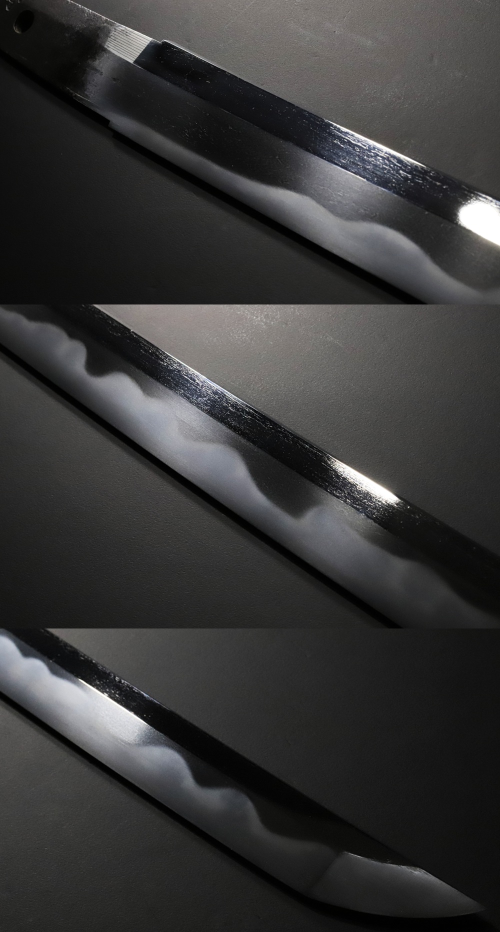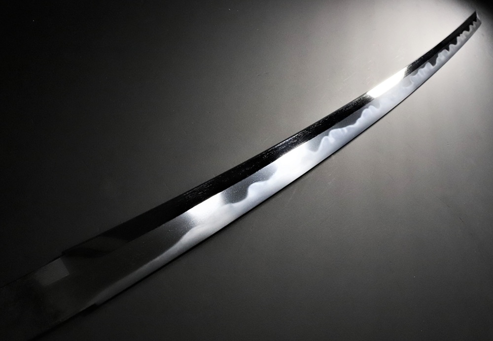 | 刃文 | 直焼出し伴う大互の目乱れ、匂口冴えて 矢筈刃風の刃文交じり濤乱風となり 匂深く 小沸厚く付き 飛焼き状の玉をみる |