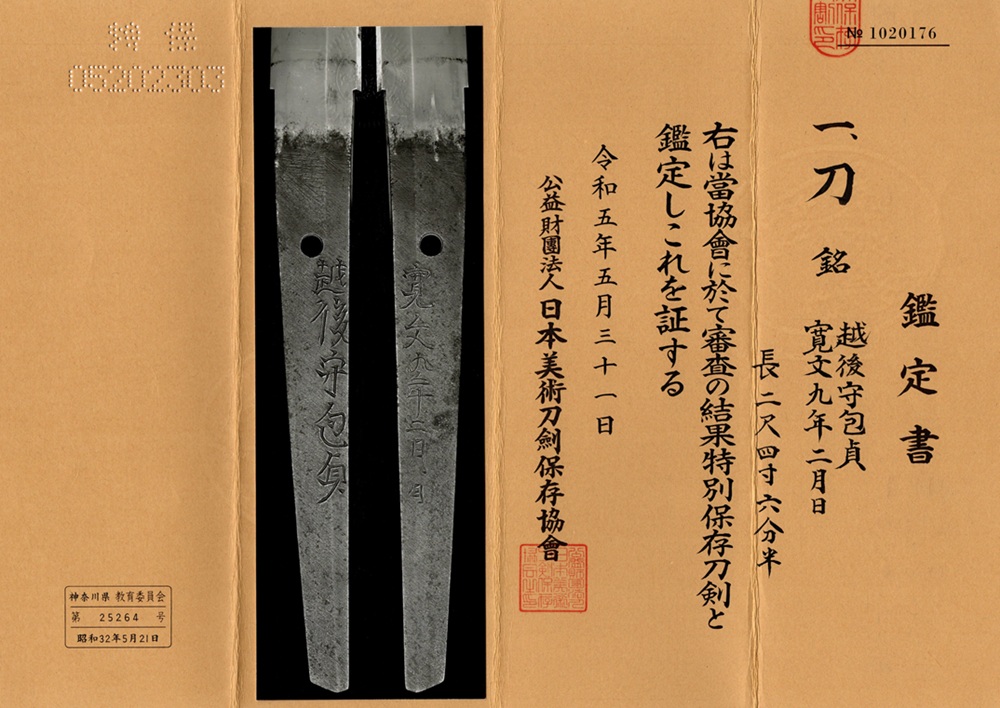 表: 越後守包貞 裏: 寛文九年二月日 |