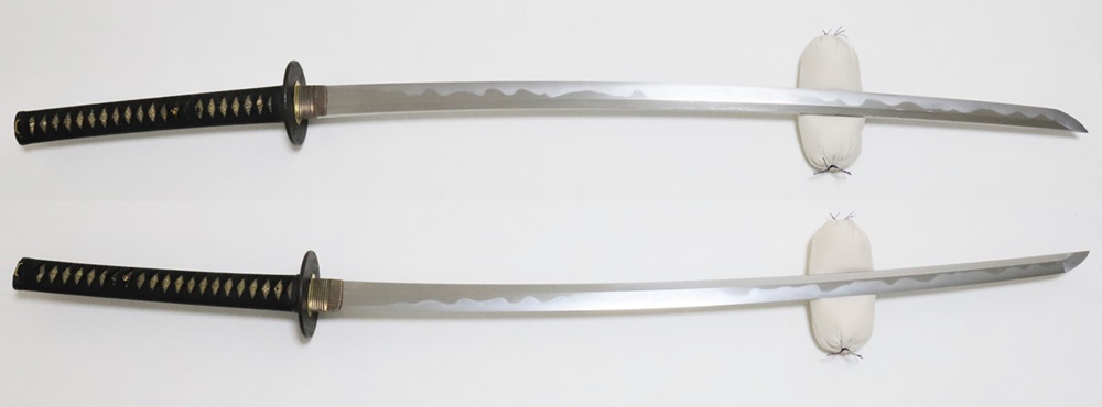 | 二代包貞は初代越後守包貞に学び、その跡目を継ぎ、初め越後守包貞を名乗っていたが、初代の実子が成人すると、越後守包貞の名を譲り、自らは坂倉権之進照包と銘した(延宝八年1680)。作風は助廣に倣った濤乱や互の目乱れなど多いが、稀に大湾れや直刃の作も見られ、そのいずれの作柄でも、匂が深く沸のよく付いた、匂口が明るい出来となる。本作は均整が取れた2尺4寸6分半の長寸。鍛が精良で優れ、二代包貞の得意とした濤乱風の大互の目乱れ。匂口が明るく冴えて焼刃に矢筈風の刃や、片山乱れと称する同工独特の刃形が見られ、飛焼き状の玉を焼く。二代越後守包貞の優品である。寛文九年(1669)の年紀貴重。上等な黒呂磯草塗鞘打刀拵が付されている。2024年特別保存刀剣審査合格。 |