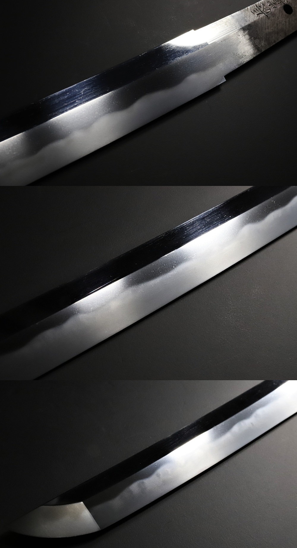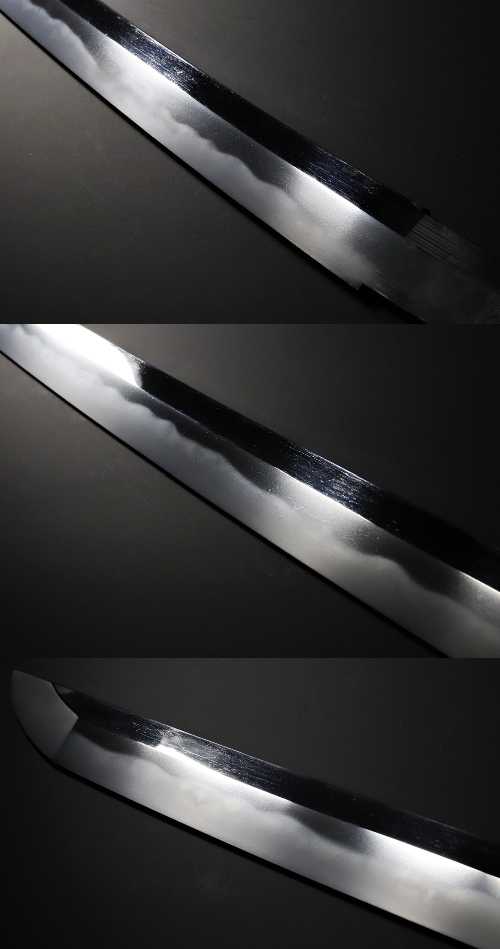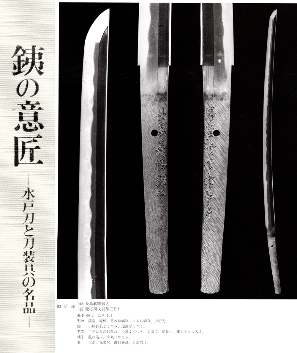 | 長島義勝は勝村徳勝門人。正勝、長勝らと共に師徳勝の鍛刀協力者として活動した。本作は、小板目よく詰んだ地鉄に焼高く丁子交じりの互の目乱れ刃文で華やか。刃文には小沸よく付いて匂口深く足入り葉頻りに入る。また茎の鑢目太く、師徳勝が秘伝書を授けられたという細川正義の作風・茎仕立てであることから、本刀工の義勝は大師匠である細川正義の影響を受けていたであろう。地刃共に健全。本作は「銕の意匠-水戸刀と刀装具の名品-」・「鋼と色金-茨城の刀剣と刀装-」所載。2019年特別保存刀剣審査合格。 |