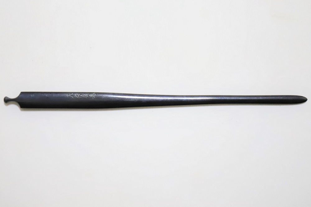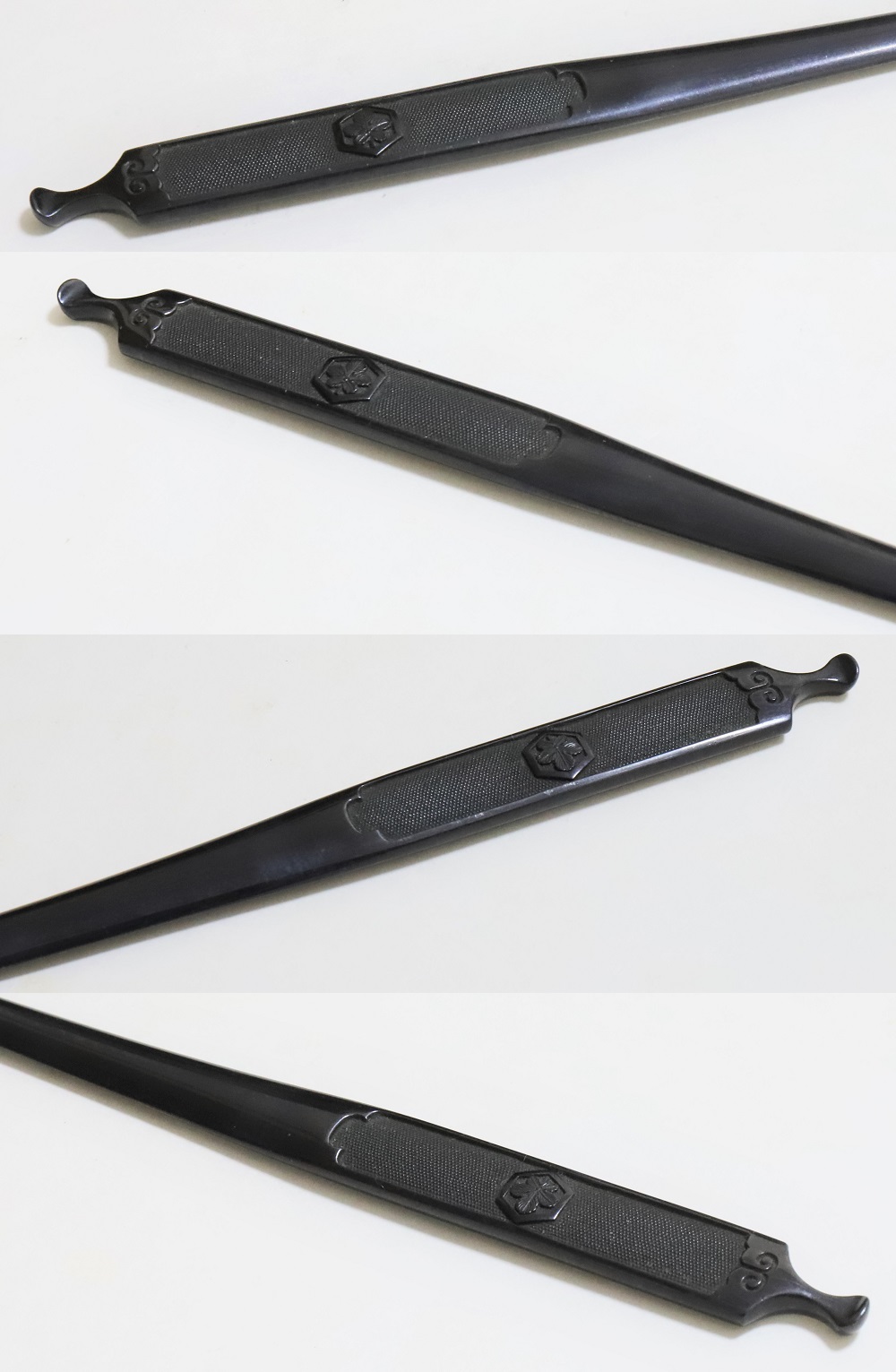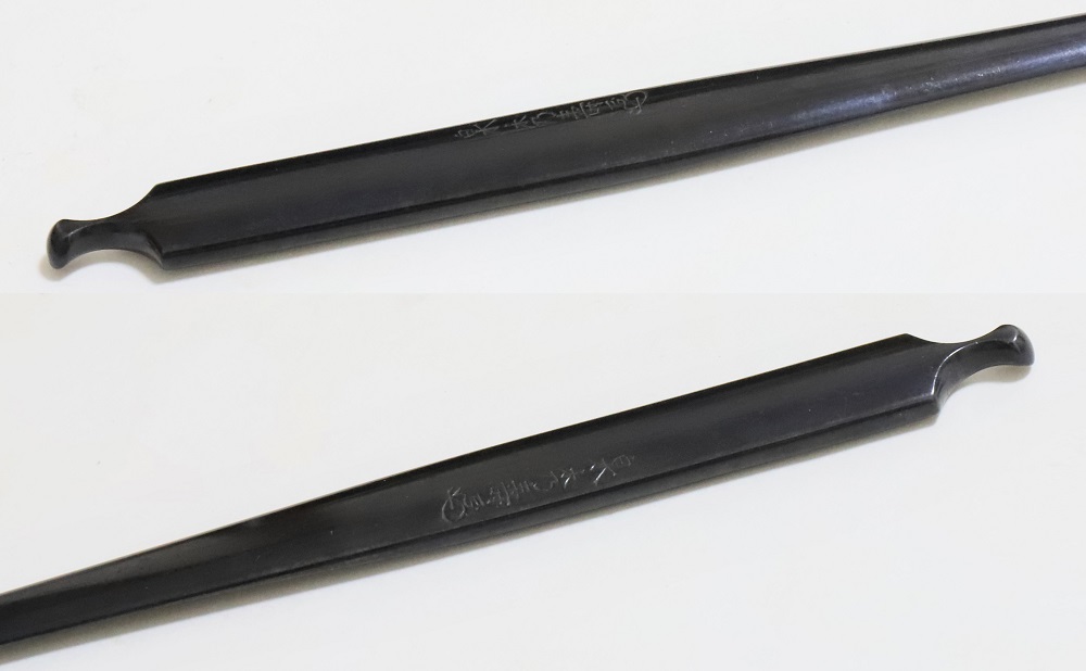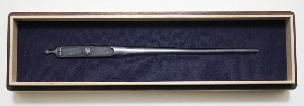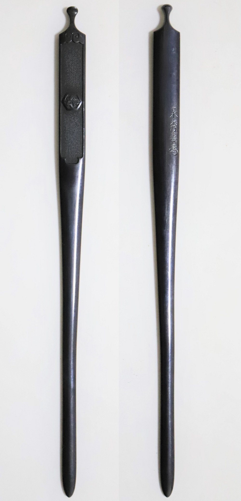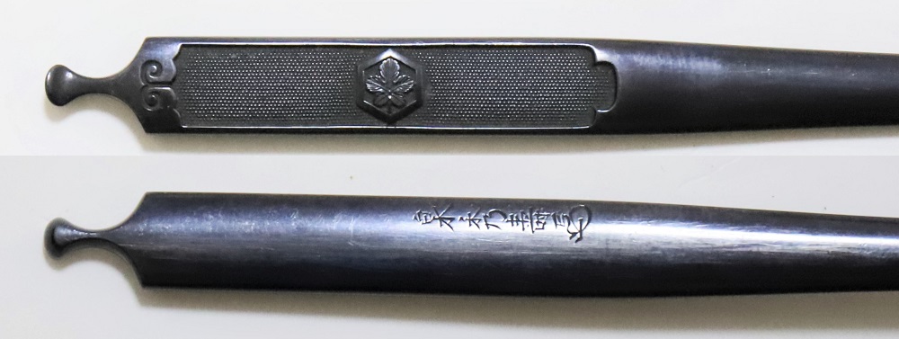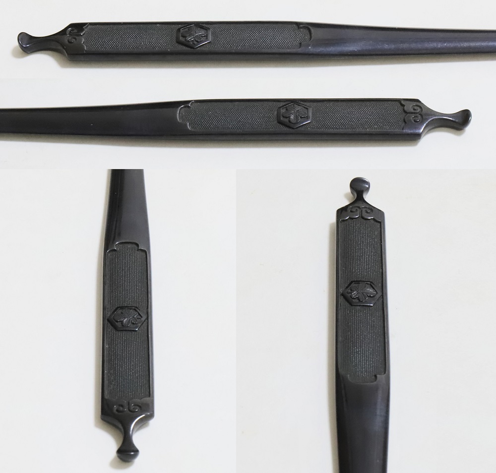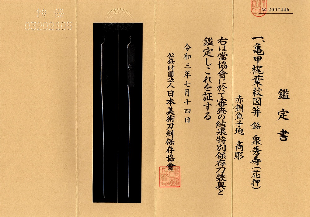 | 泉秀寿は大森英秀と大森の苗字を免許された仙台出身秀知の門人。青龍斎と号する。江戸後期、江戸住。本作は上質の赤銅を用いて「亀甲に立ち梶の葉」家紋を魚子地に据えた笄。武家の特注品であろう。2021年5月刀装具審査で特別保存合格。 |