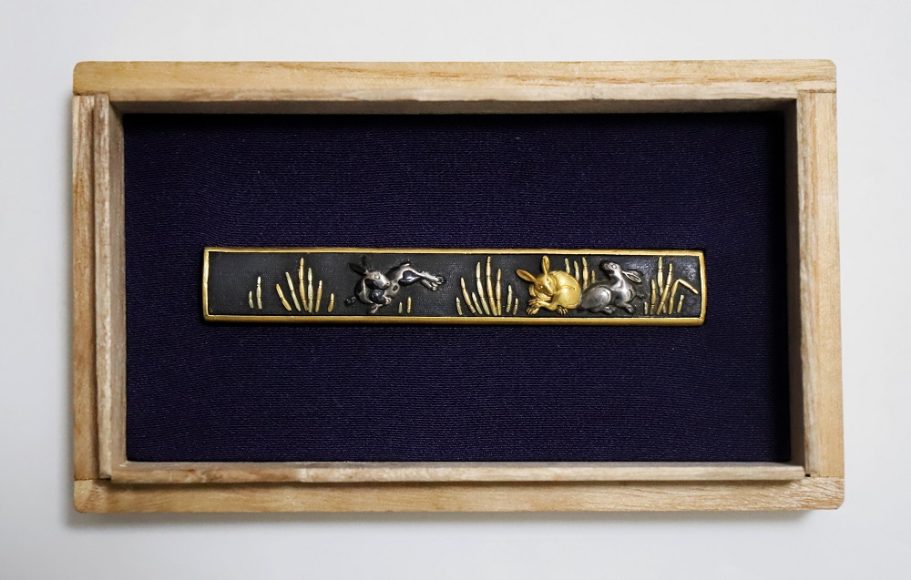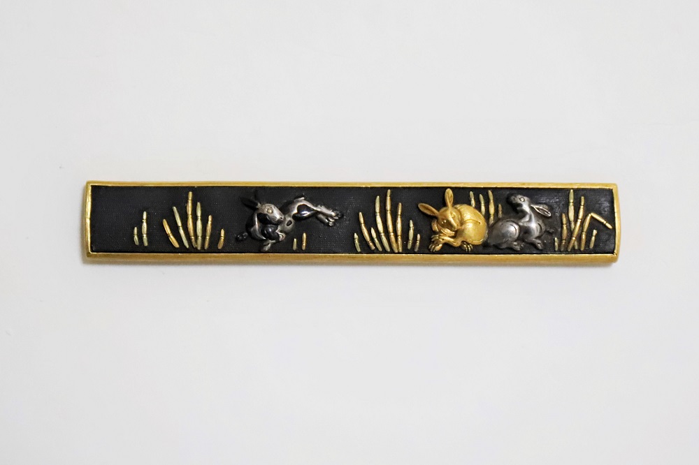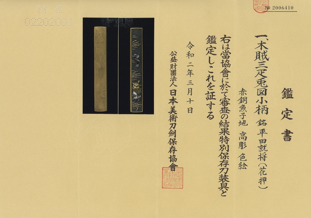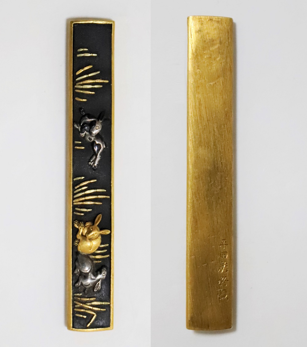 | 平田就将(なりまさ)は平田家九代目。幕府より俸禄を給され、晩年入道する。安永五年(1776)没、江戸下谷住。平田家は七宝という特殊な技術を一子相伝に継承した徳川幕府の抱工。後藤・吉岡家と並ぶ装剣金工の名家で慶長年間の初代道仁から明治の十代春行まで続いた。本作は平田就将在銘の七宝作ではない高彫据紋象嵌の木賊兎(とくさうさぎ)図小柄。2020年1月審査で特別保存刀装具合格。 |