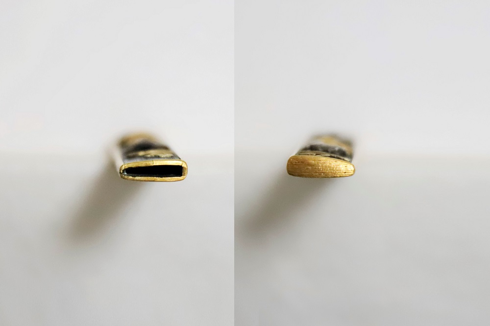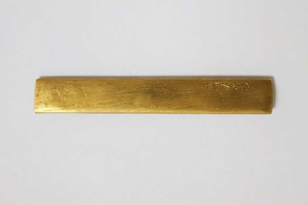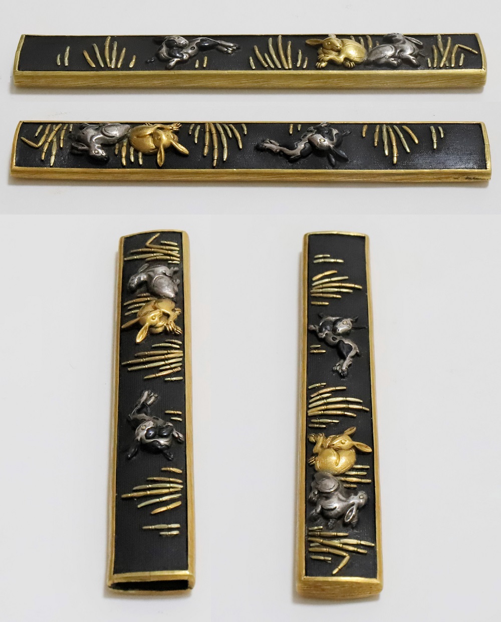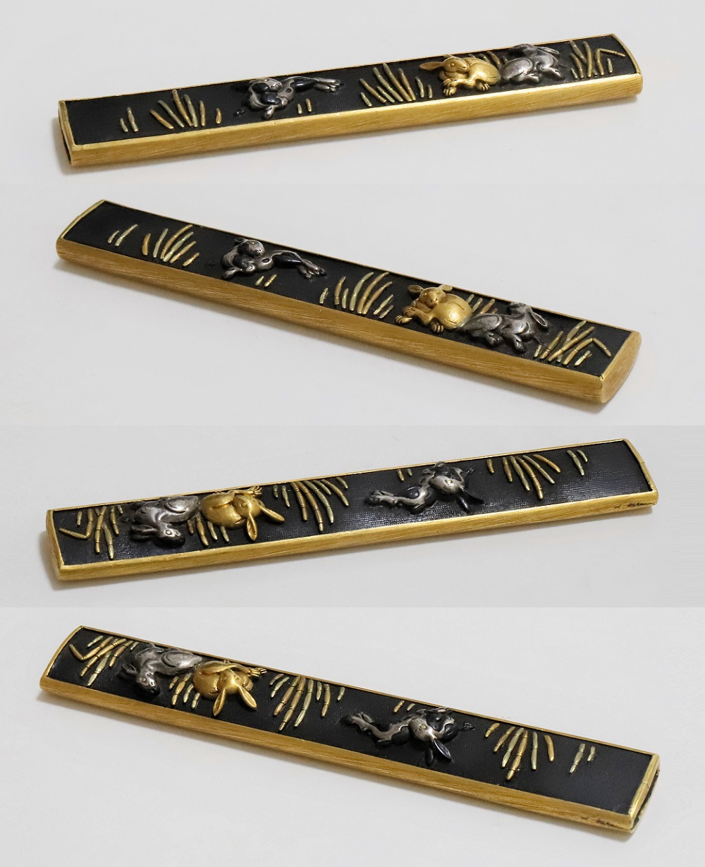 | 平田就将(なりまさ)は平田家九代目。幕府より俸禄を給され、晩年入道する。安永五年(1776)没、江戸下谷住。平田家は七宝という特殊な技術を一子相伝に継承した徳川幕府の抱工。後藤・吉岡家と並ぶ装剣金工の名家で慶長年間の初代道仁から明治の十代春行まで続いた。本作は平田就将在銘の七宝作ではない高彫据紋象嵌の木賊兎(とくさうさぎ)図小柄。2020年1月審査で特別保存刀装具合格。 |