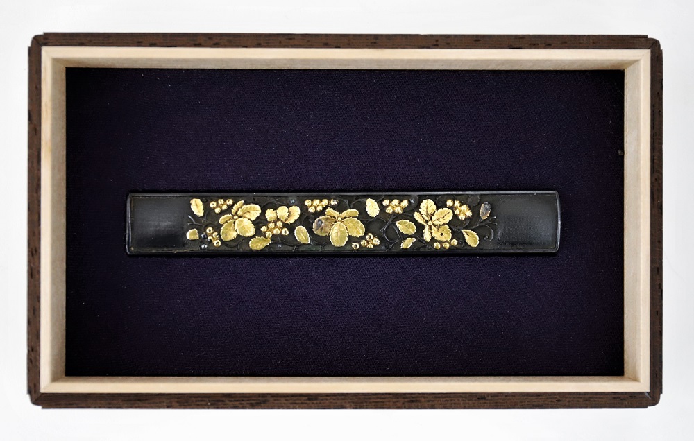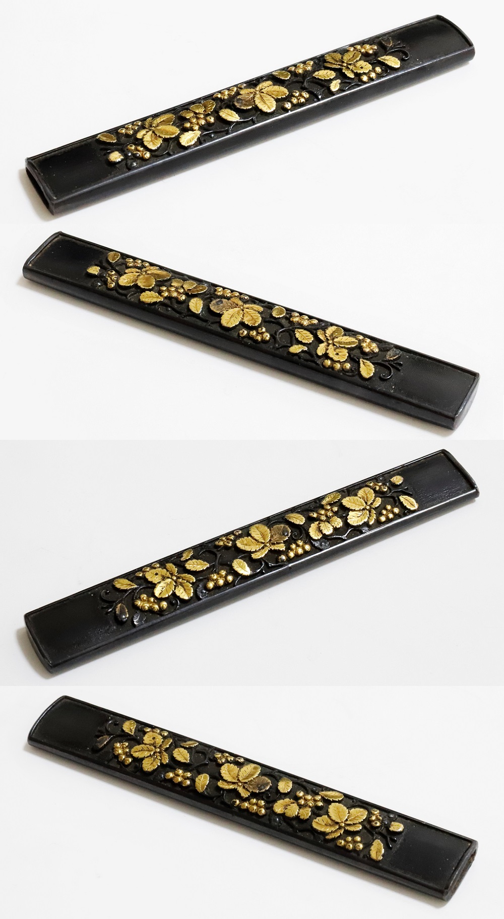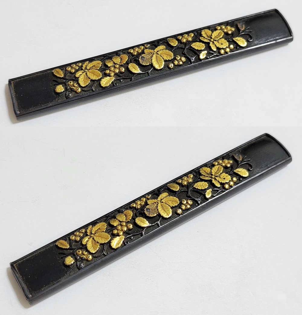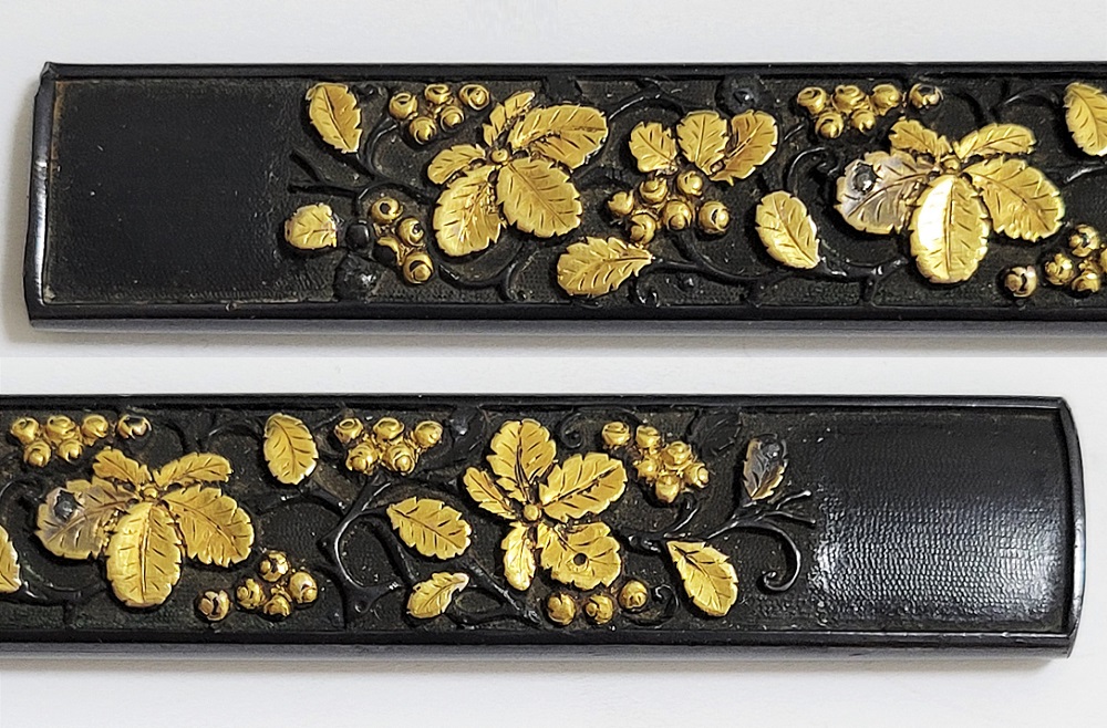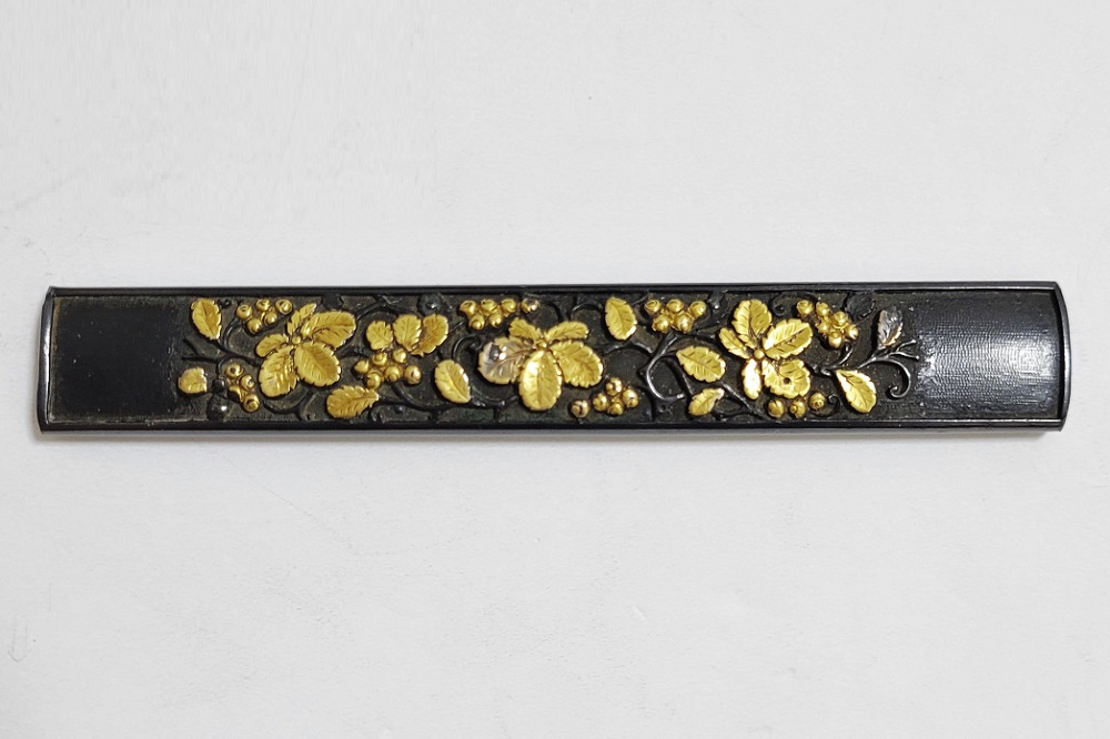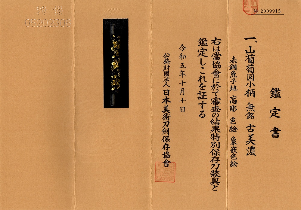 | 古美濃と極まった山葡萄図小柄。古美濃は美濃国の美濃彫金工で桃山時代以前と鑑せられる作。いずれも無銘。美濃の深彫りと呼ばれ、文様を残して地を深く鋤下げ、秋草を主にした図柄で、厚い金銀の焼き付け色絵になっている。本作は魚子からも時代が伝わる古美濃の名品。令和5年(2023)特別保存刀装具審査合格。 |