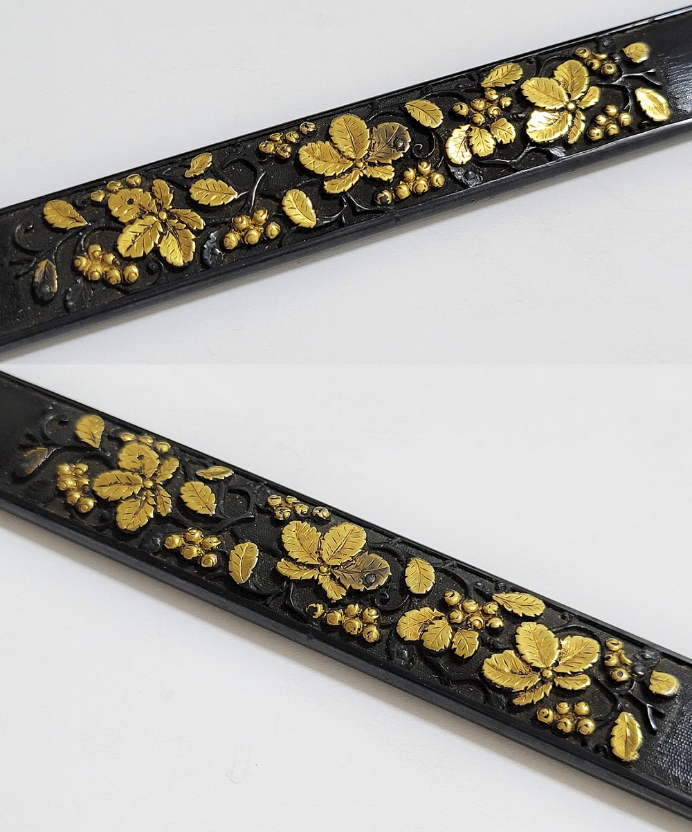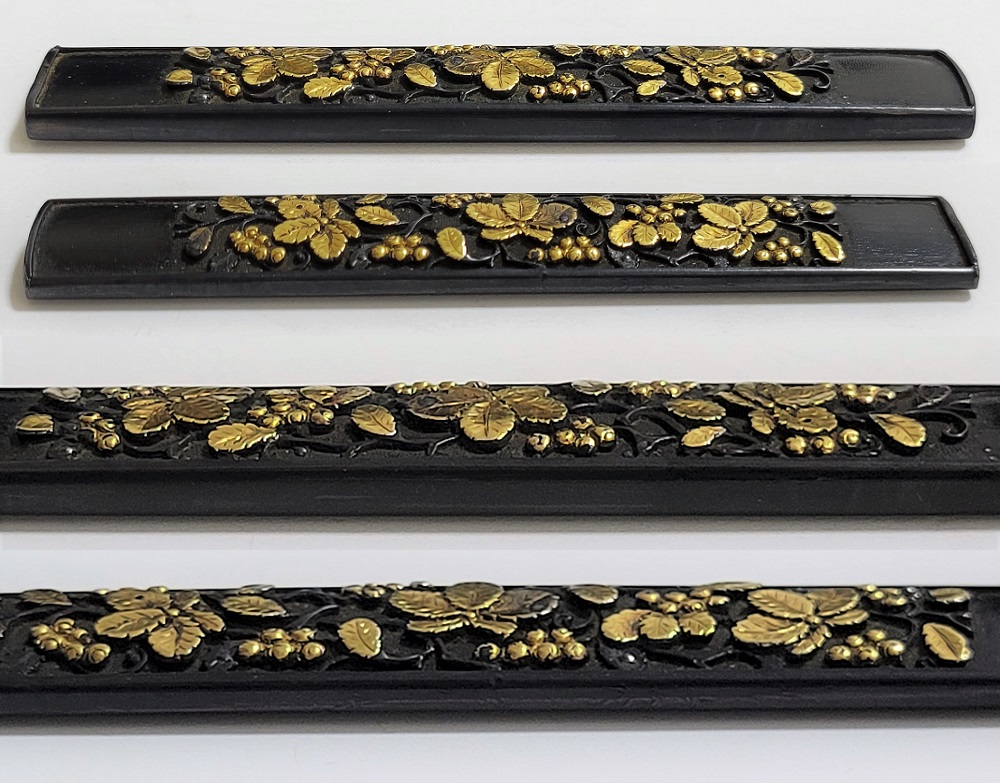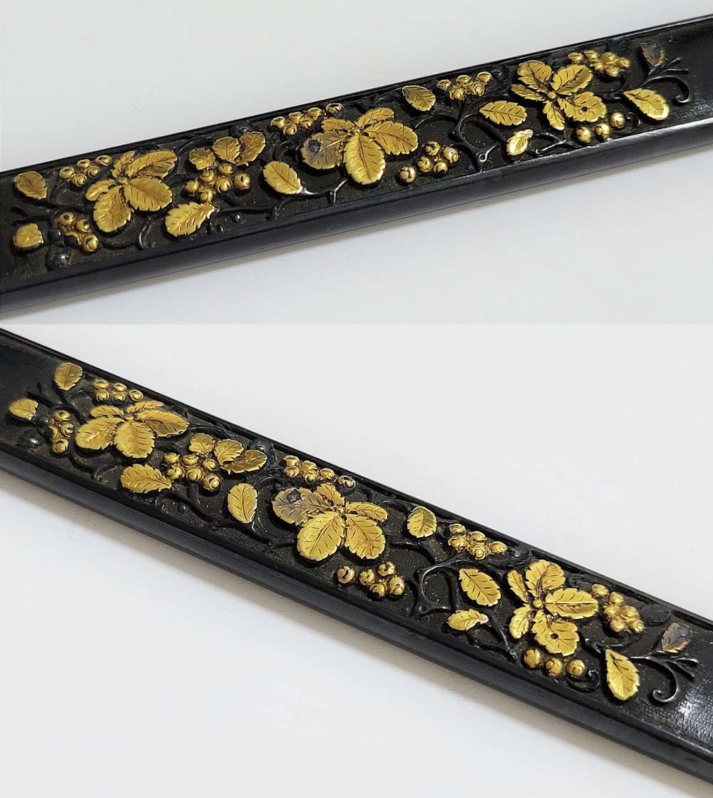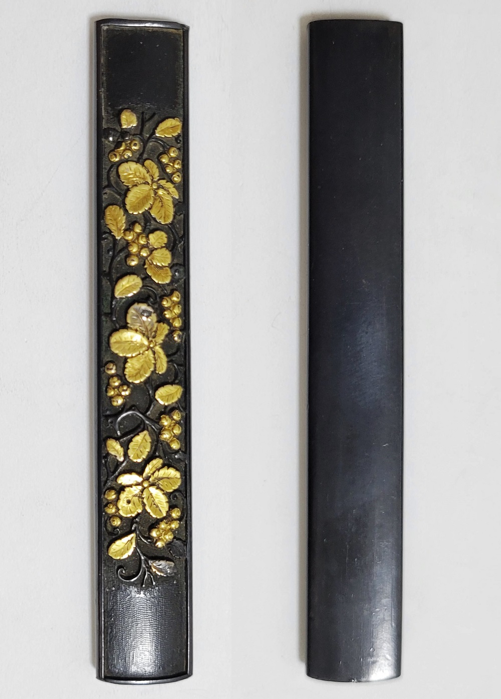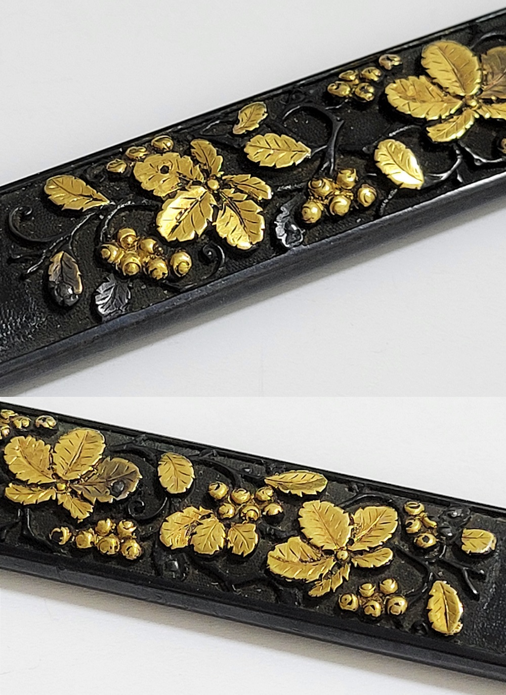 | 古美濃と極まった山葡萄図小柄。古美濃は美濃国の美濃彫金工で桃山時代以前と鑑せられる作。いずれも無銘。美濃の深彫りと呼ばれ、文様を残して地を深く鋤下げ、秋草を主にした図柄で、厚い金銀の焼き付け色絵になっている。本作は魚子からも時代が伝わる古美濃の名品。令和5年(2023)特別保存刀装具審査合格。 |