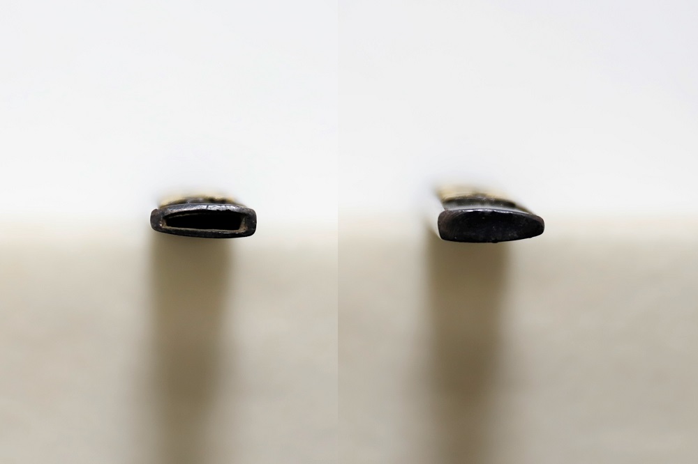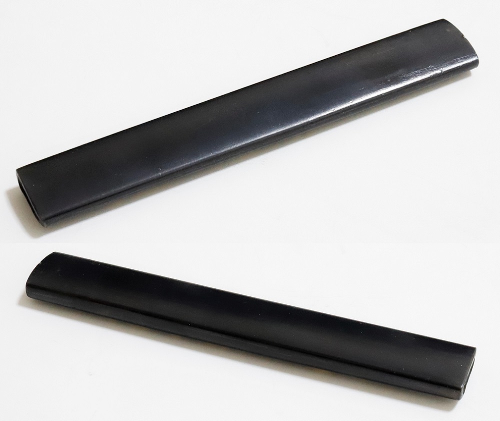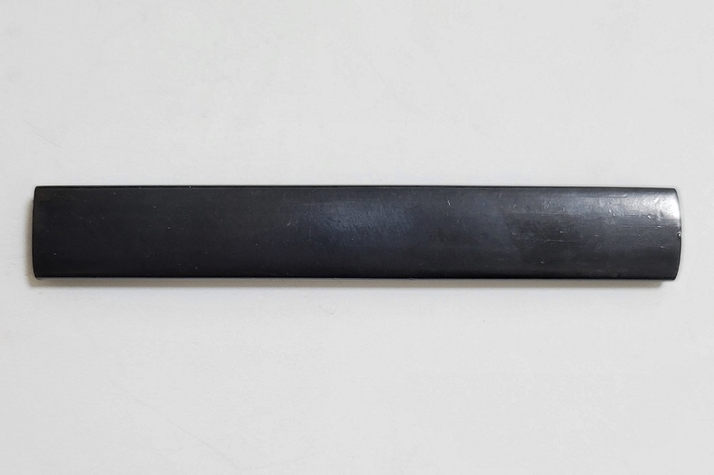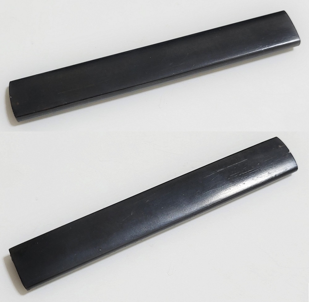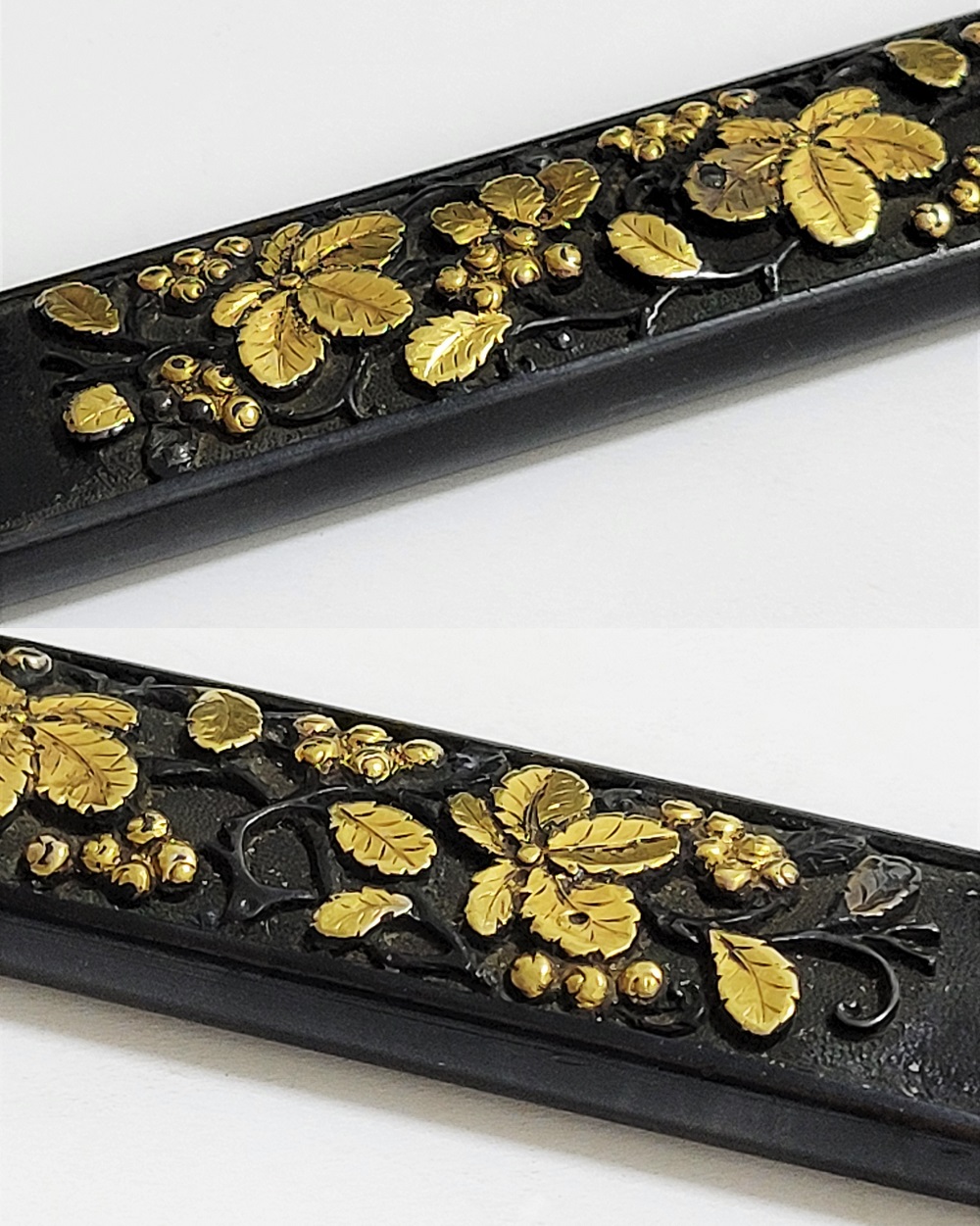 | 古美濃と極まった山葡萄図小柄。古美濃は美濃国の美濃彫金工で桃山時代以前と鑑せられる作。いずれも無銘。美濃の深彫りと呼ばれ、文様を残して地を深く鋤下げ、秋草を主にした図柄で、厚い金銀の焼き付け色絵になっている。本作は魚子からも時代が伝わる古美濃の名品。令和5年(2023)特別保存刀装具審査合格。 |