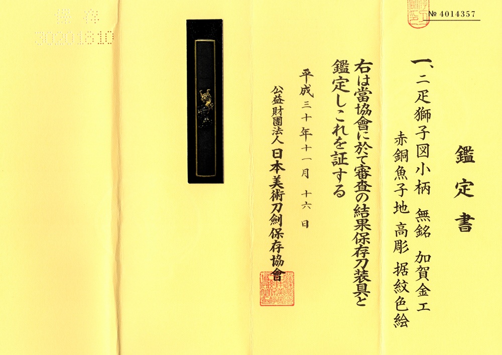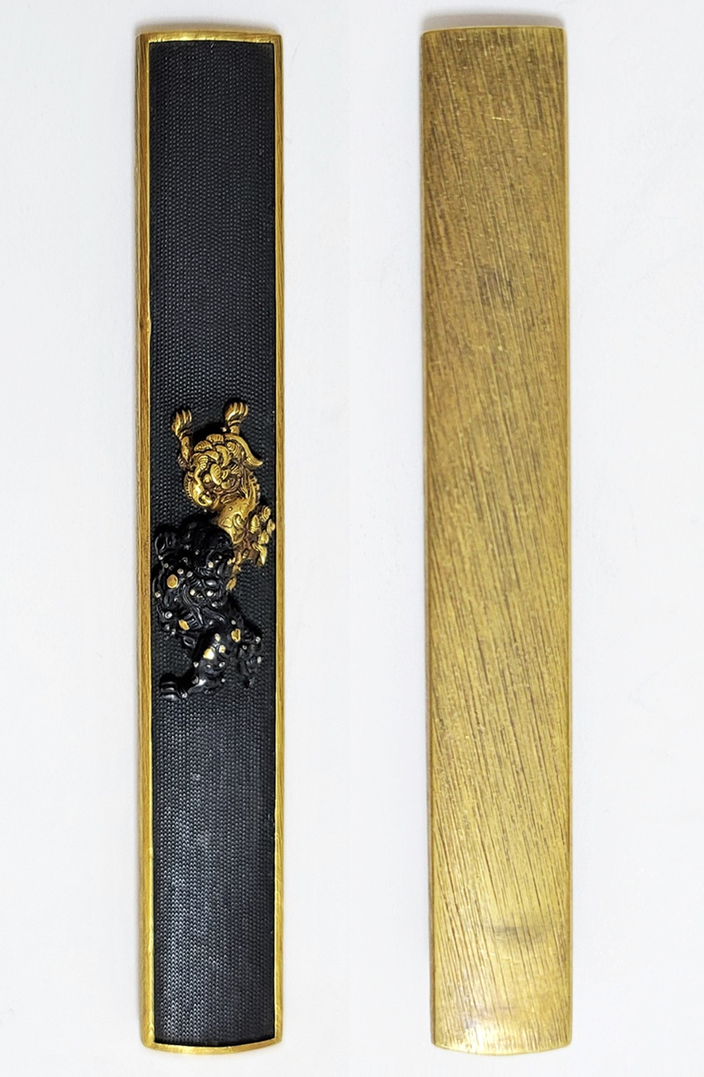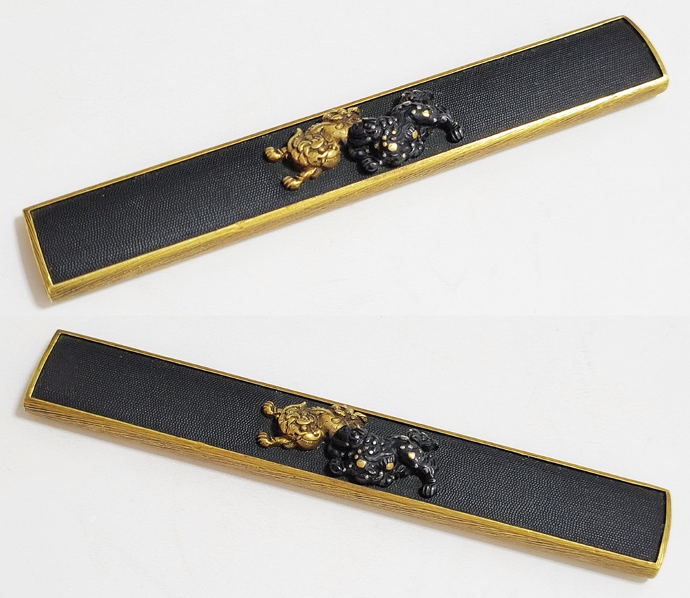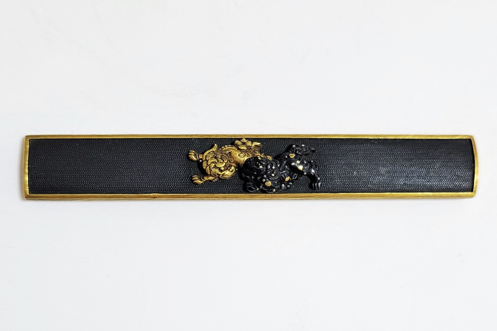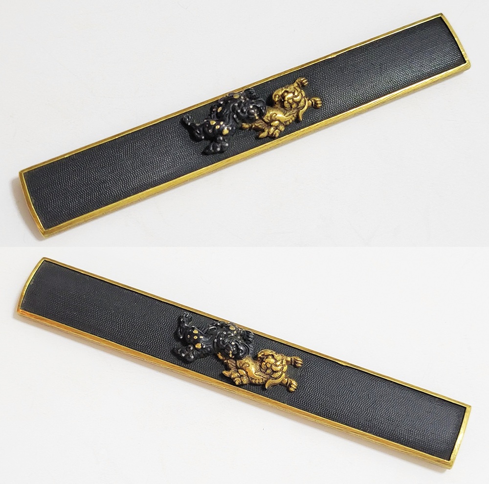 加賀国は前田利家が百万石領主として入国以来金沢を中心として文化圏を形成し京、江戸に次ぐ繁栄を誇った。後藤家を始め京伏見などから金工を招き、金銀をふんだんに使って花鳥、虫類、定紋などを繊細に図案化し平象嵌を施した優麗豪華な作品を作る加賀金工を生んだ。本作は据紋の後藤獅子盛高く、身体斑などから後藤宗家の作とは異なるが、保存状態良く厳かな印象を与える二疋獅子図小柄。加賀金工に極められて2018年保存刀装具審査合格。