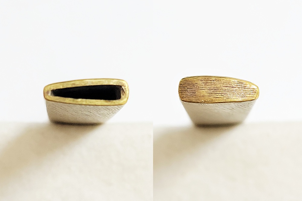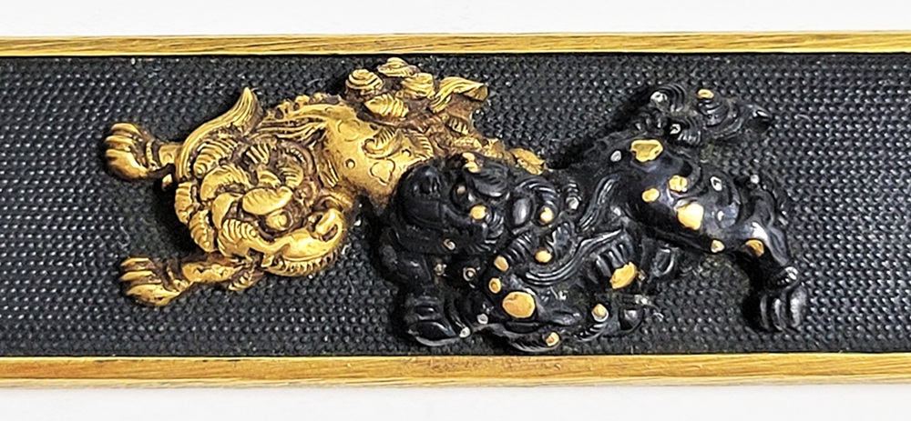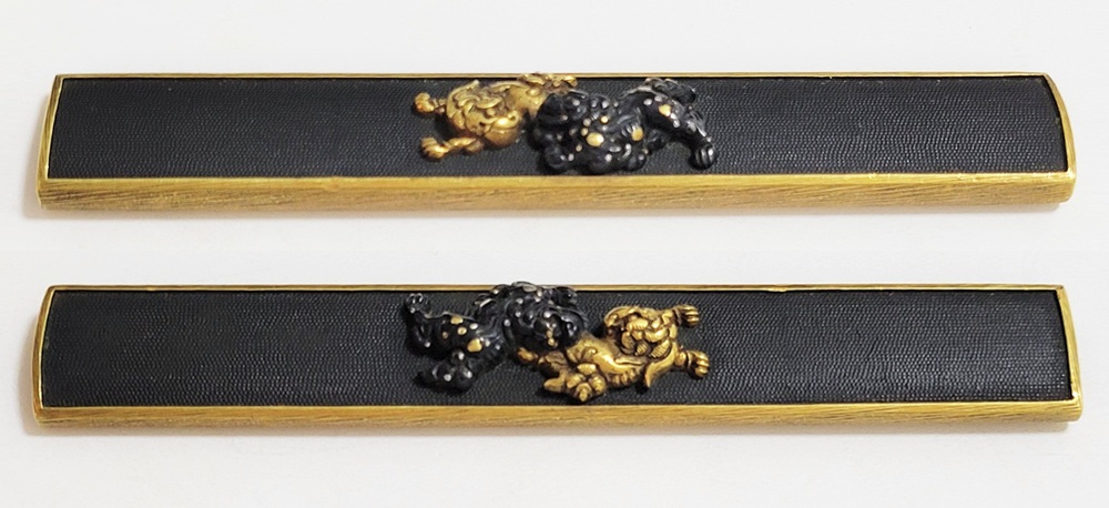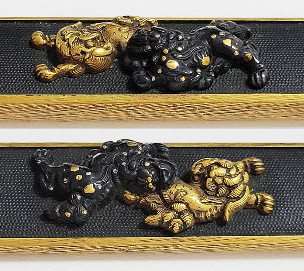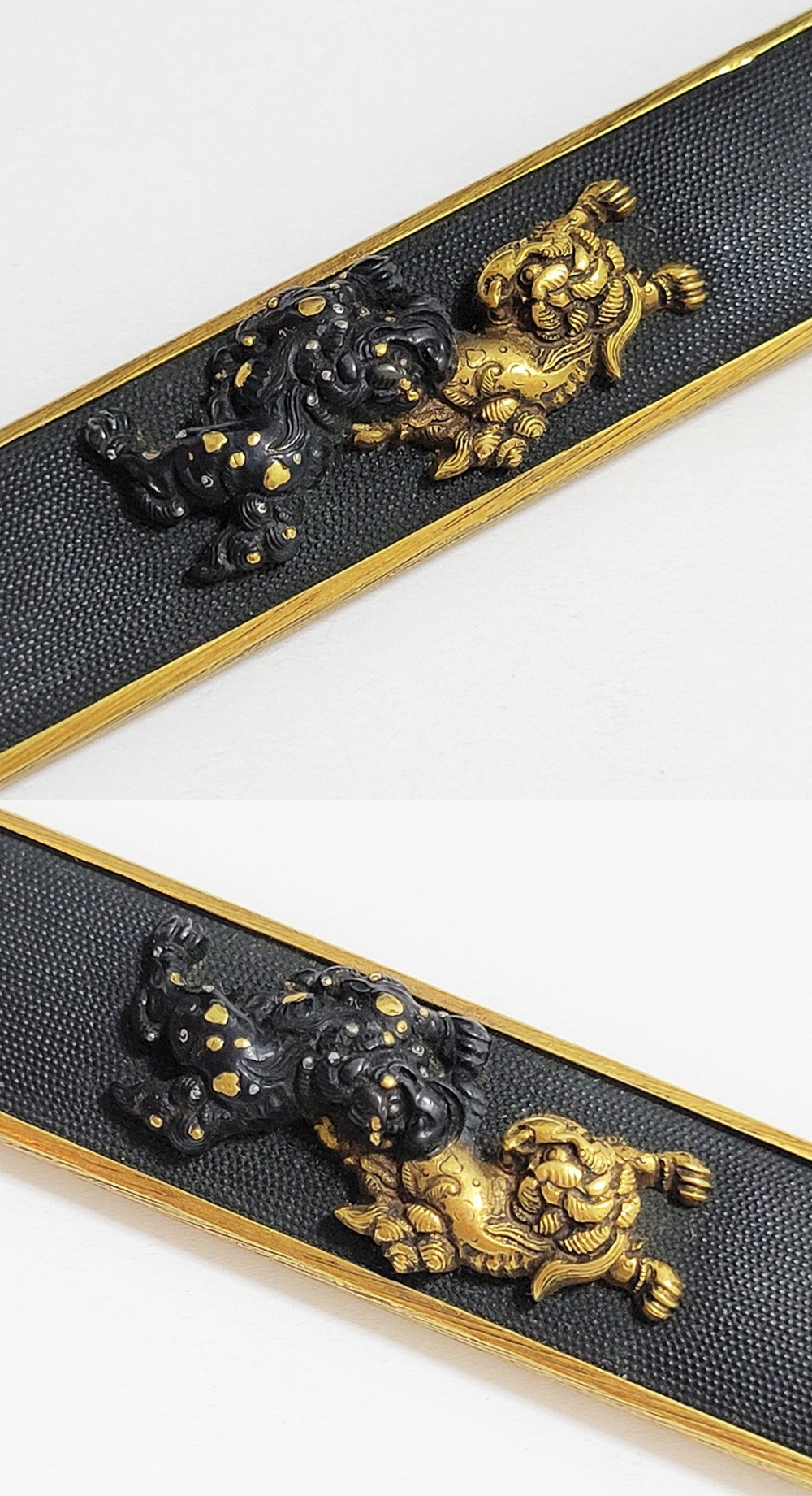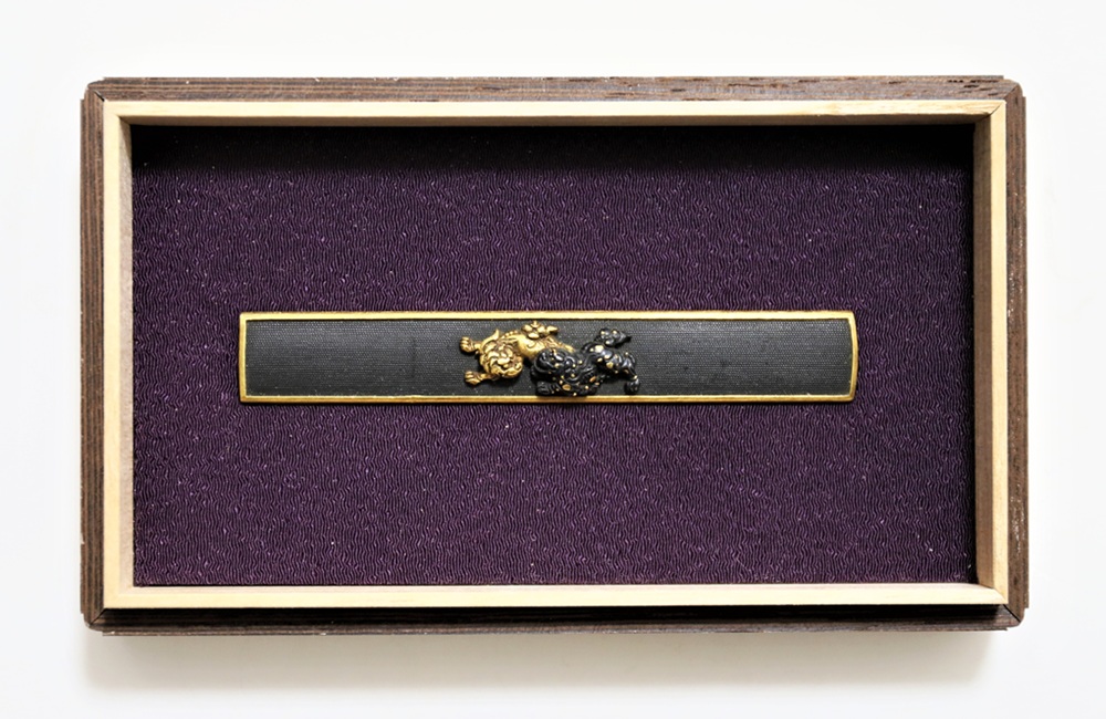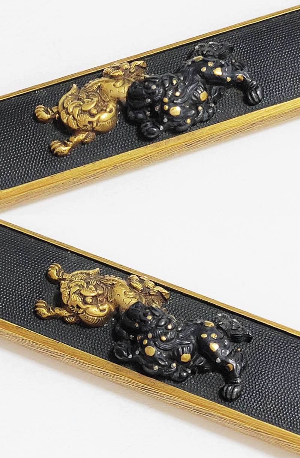 加賀国は前田利家が百万石領主として入国以来金沢を中心として文化圏を形成し京、江戸に次ぐ繁栄を誇った。後藤家を始め京伏見などから金工を招き、金銀をふんだんに使って花鳥、虫類、定紋などを繊細に図案化し平象嵌を施した優麗豪華な作品を作る加賀金工を生んだ。本作は据紋の後藤獅子盛高く、身体斑などから後藤宗家の作とは異なるが、保存状態良く厳かな印象を与える二疋獅子図小柄。加賀金工に極められて2018年保存刀装具審査合格。