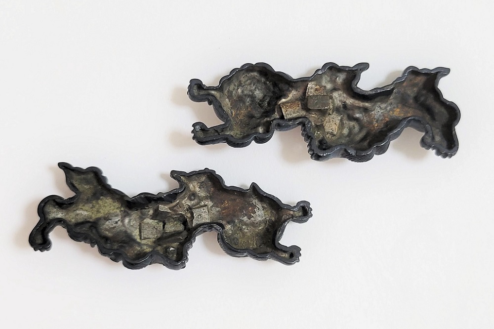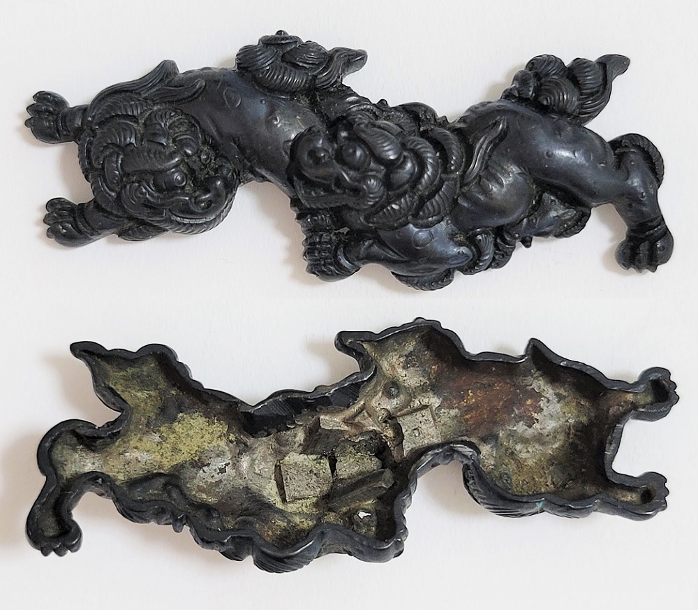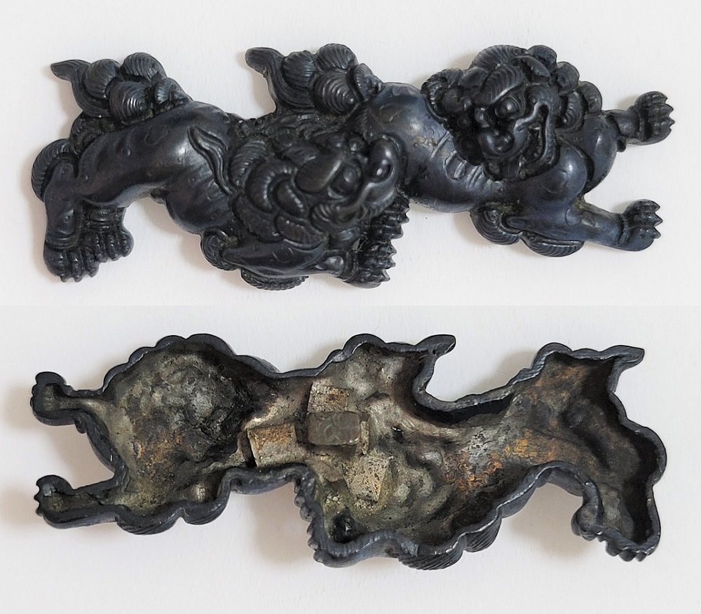 | 後藤の掟に則した正統派目貫ながら、長大で胴の斑紋から脇後藤の極めになったと思われる。締まって力強い目貫。 |
