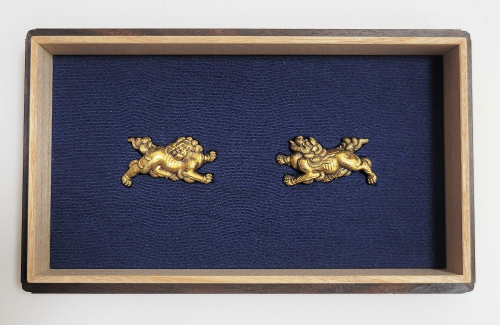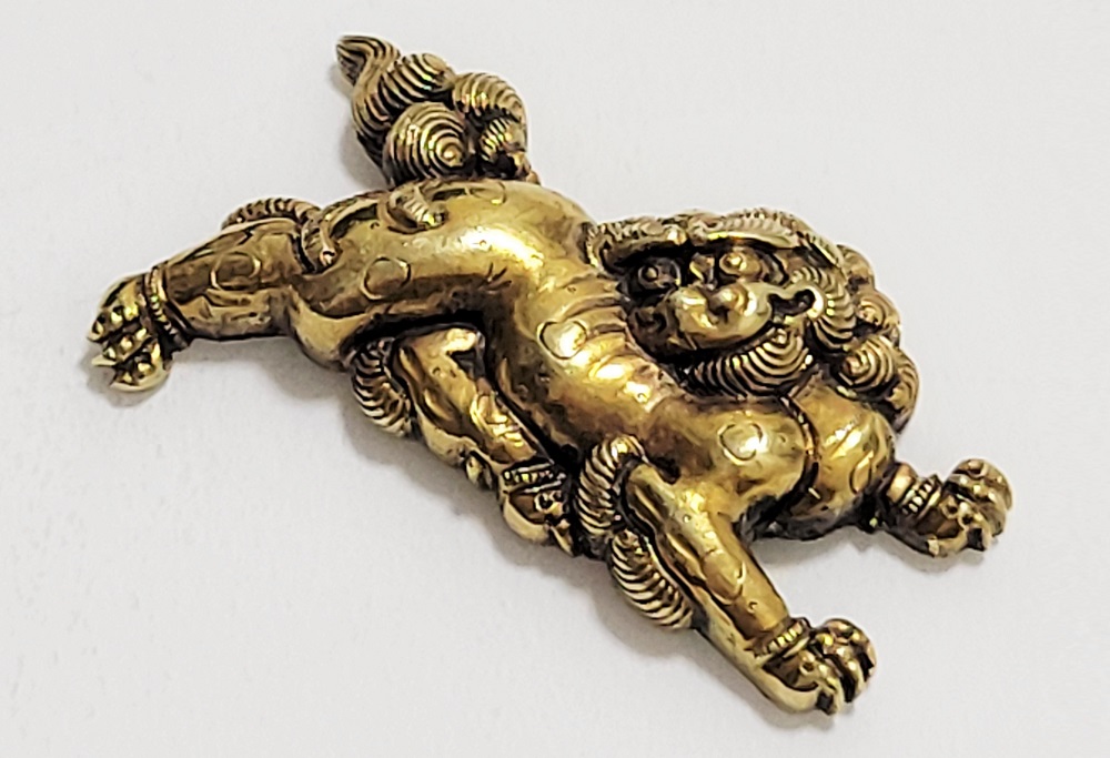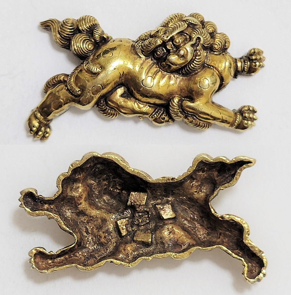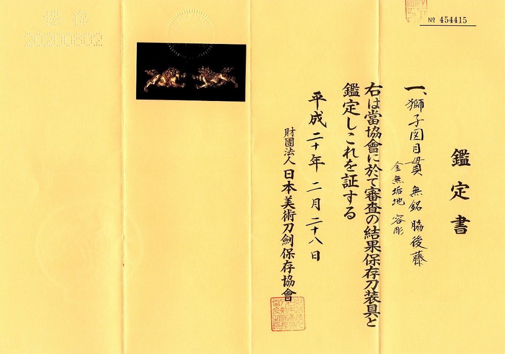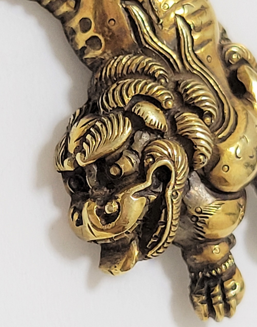 背筋のなめくり鏨、後足付け根の筋など後藤の掟どおりであるが、洲浜崩れの胴の班からか、脇後藤と極められた一疋獅子金無垢目貫。相応の時代が窺える。