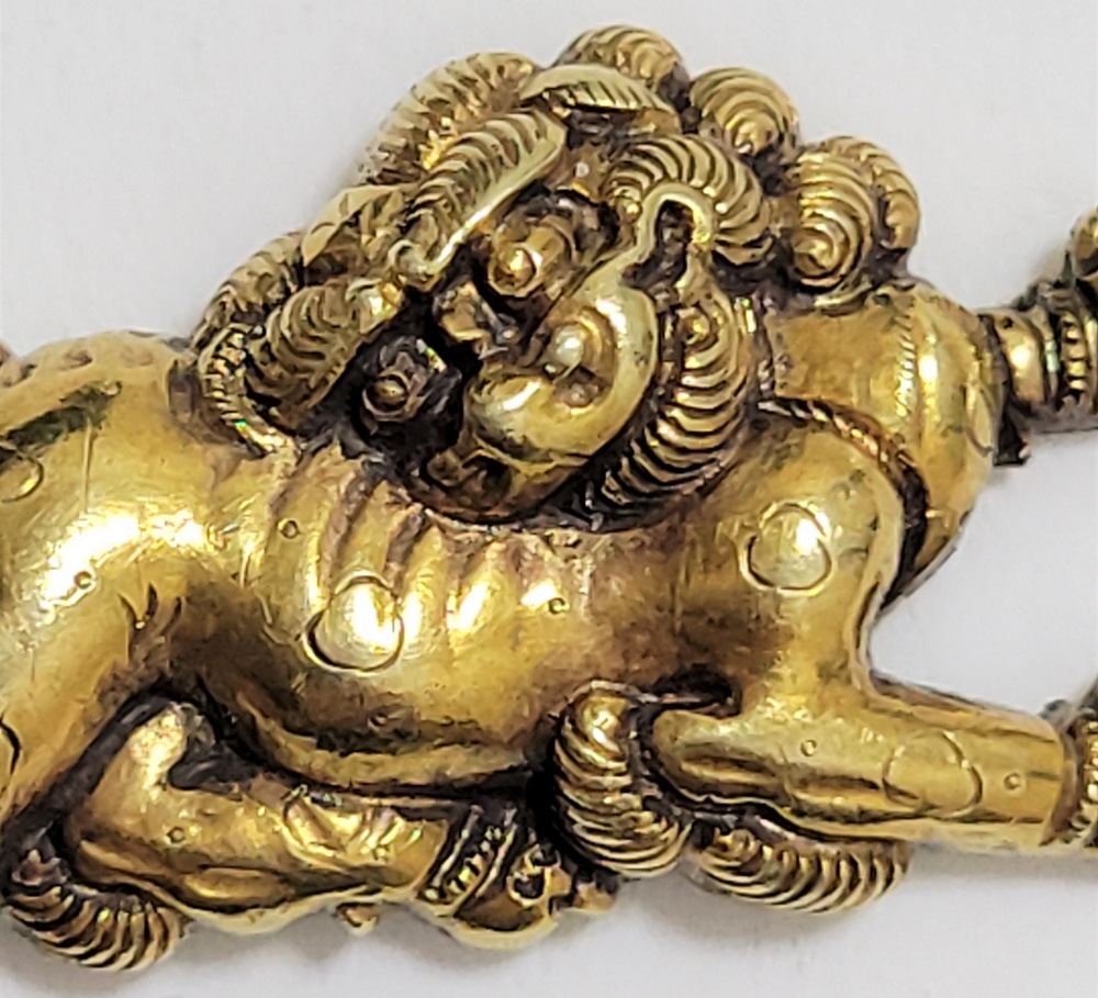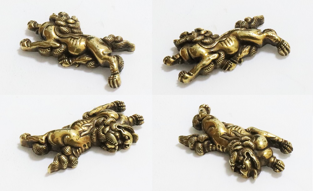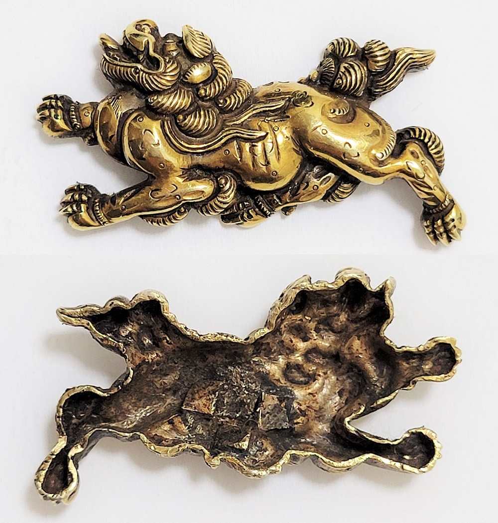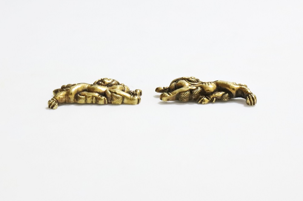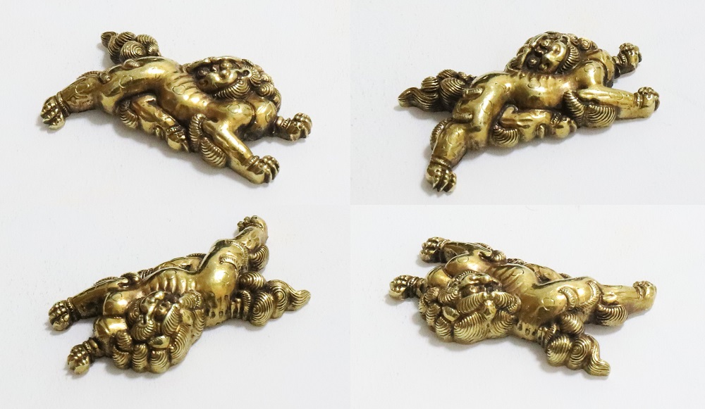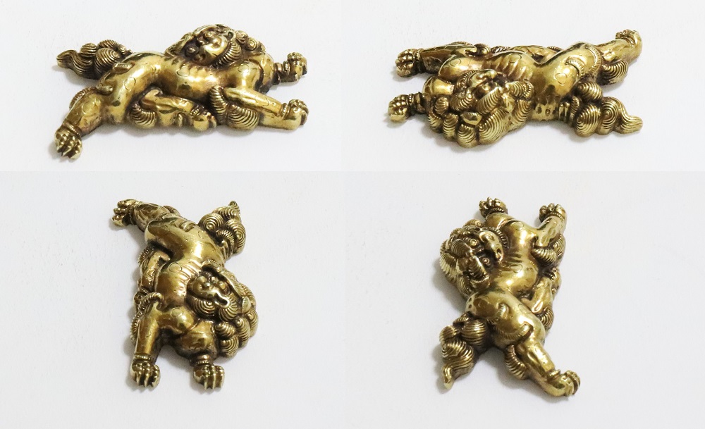 背筋のなめくり鏨、後足付け根の筋など後藤の掟どおりであるが、洲浜崩れの胴の班からか、脇後藤と極められた一疋獅子金無垢目貫。相応の時代が窺える。