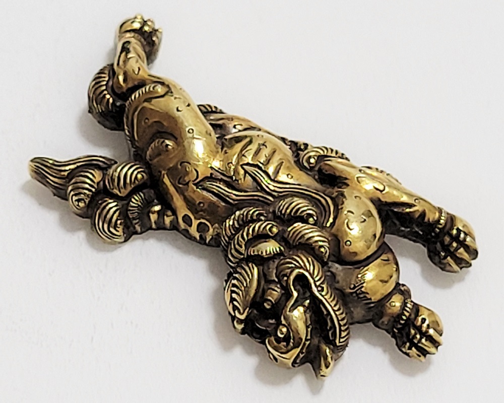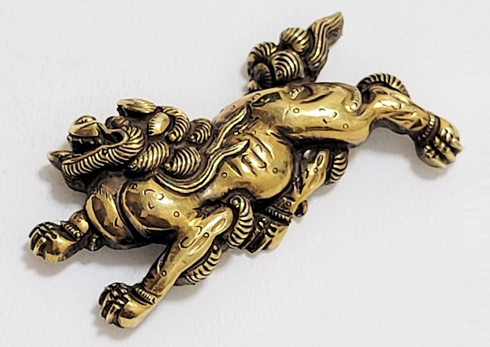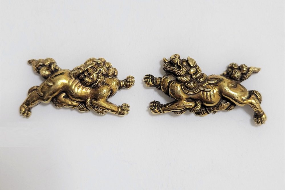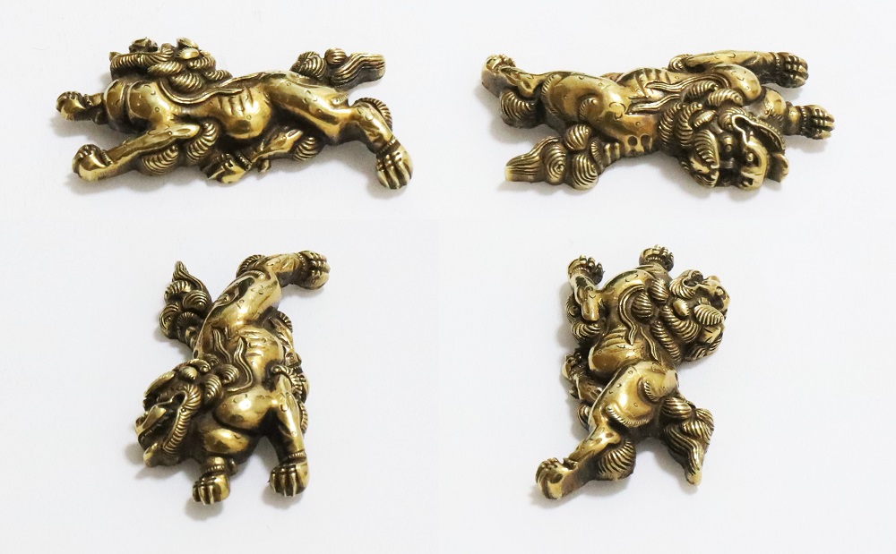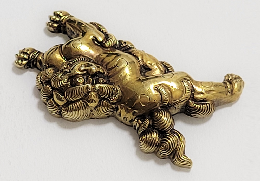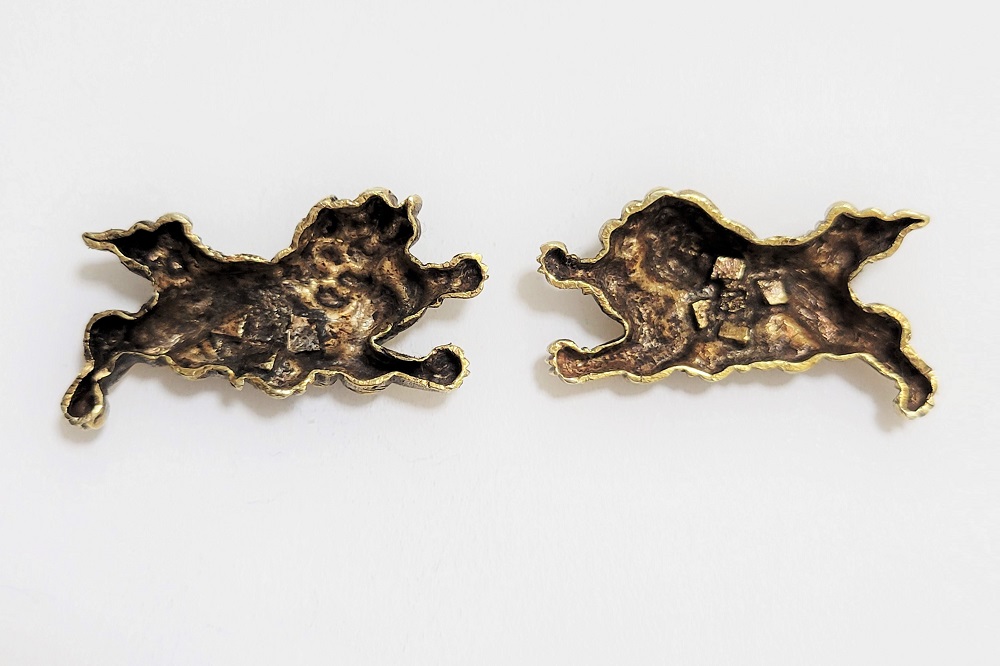背筋のなめくり鏨、後足付け根の筋など後藤の掟どおりであるが、洲浜崩れの胴の班からか、脇後藤と極められた一疋獅子金無垢目貫。相応の時代が窺える。