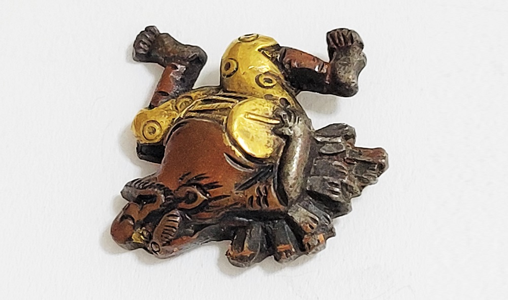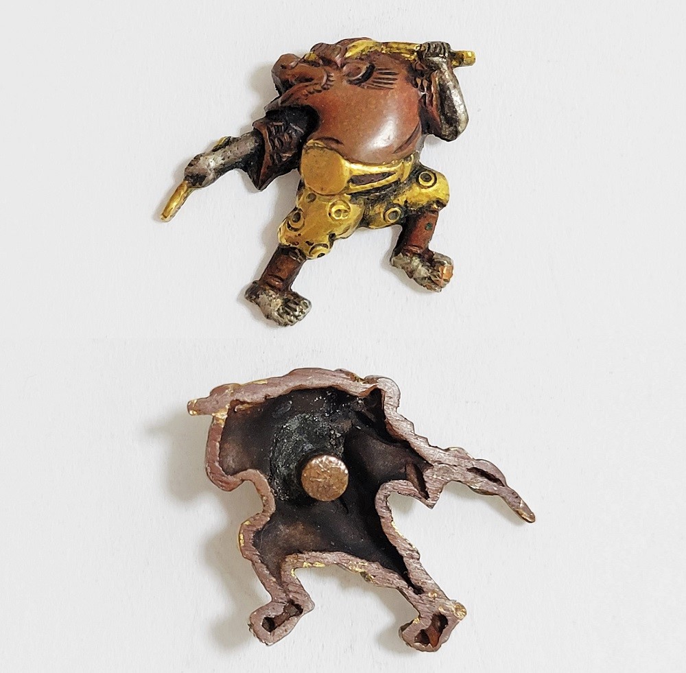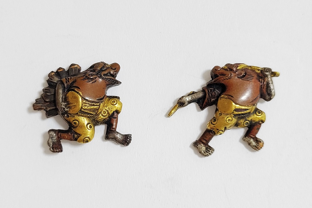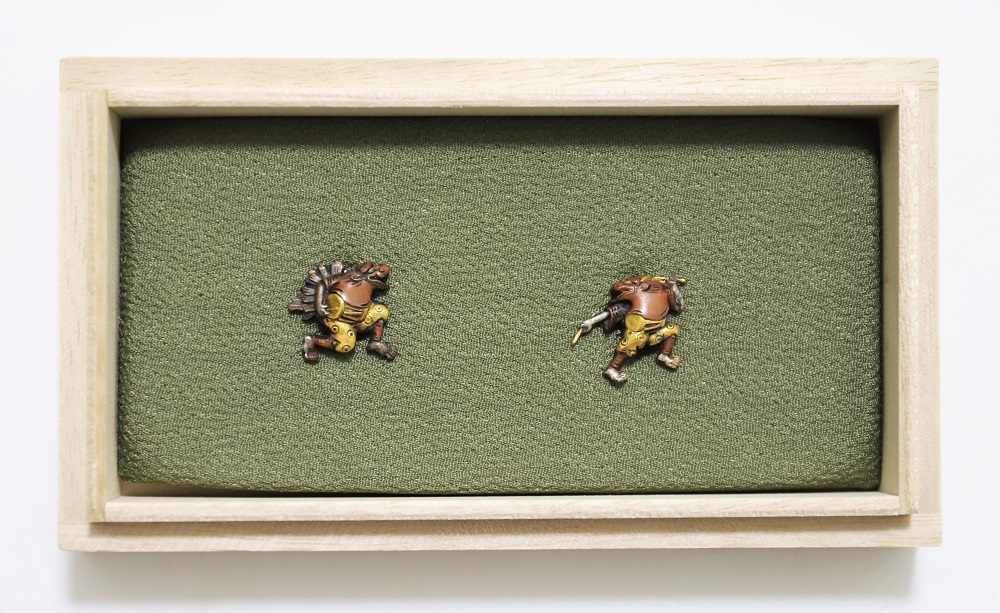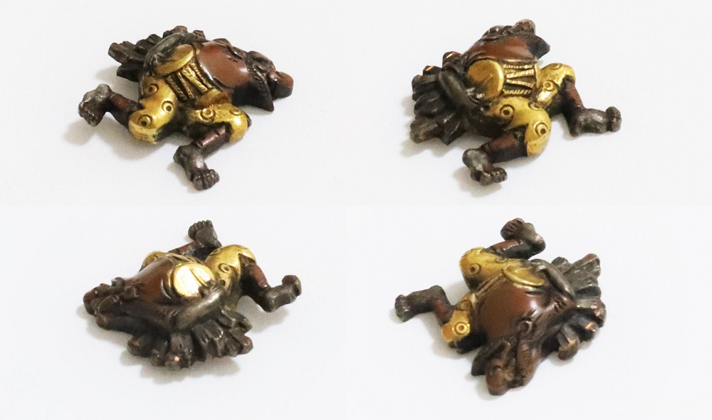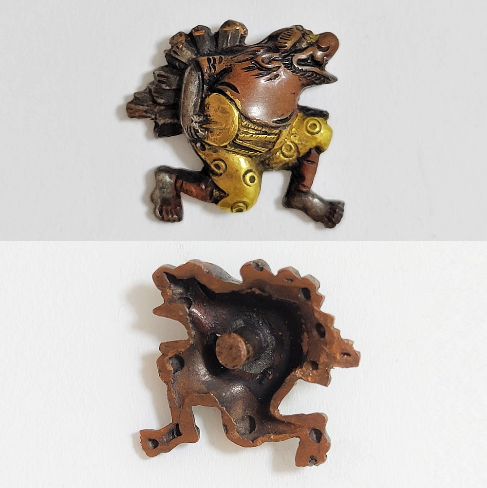 越後獅子は、越後国西蒲原郡月潟村(現新潟市)が発祥の一人立ち獅子舞。家の前で獅子頭(ししがしら)をかぶった子供が、親方の笛・太鼓に合わせて踊りや軽業などを見せ銭を貰う大道芸。江戸中後期に盛んにおこなわれた。本作は小振りの越後獅子図素銅目貫。裏行きに容彫の妙が窺える。
