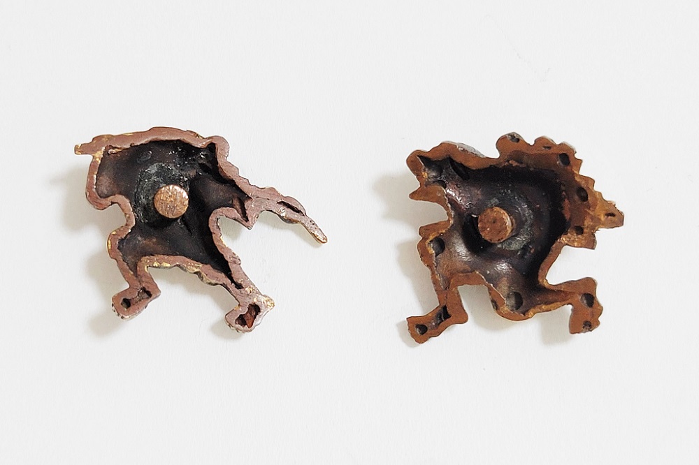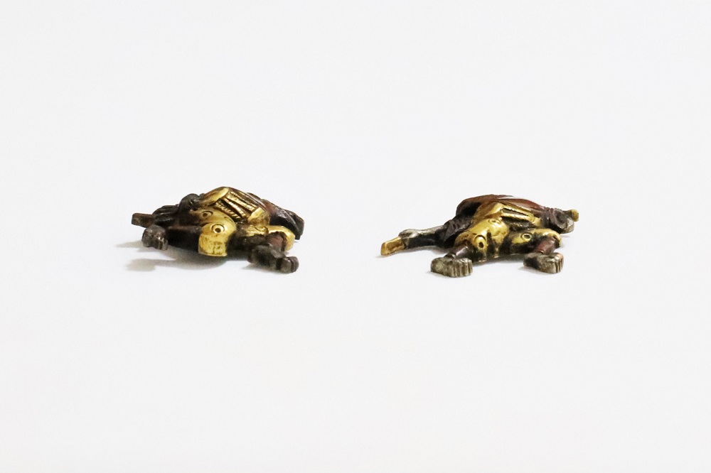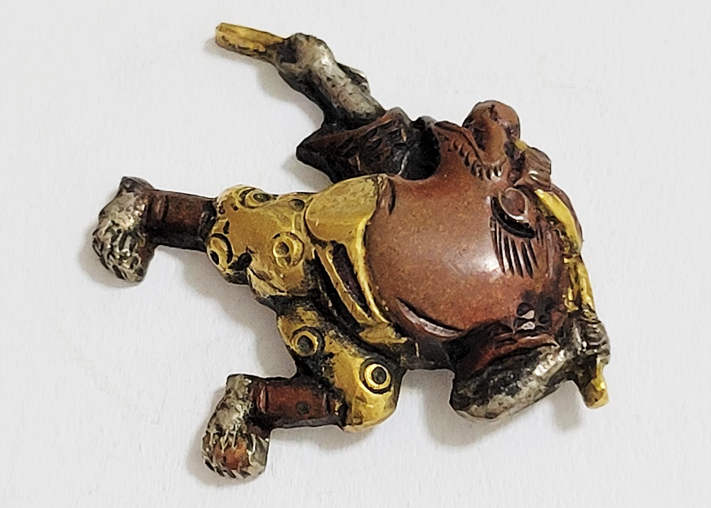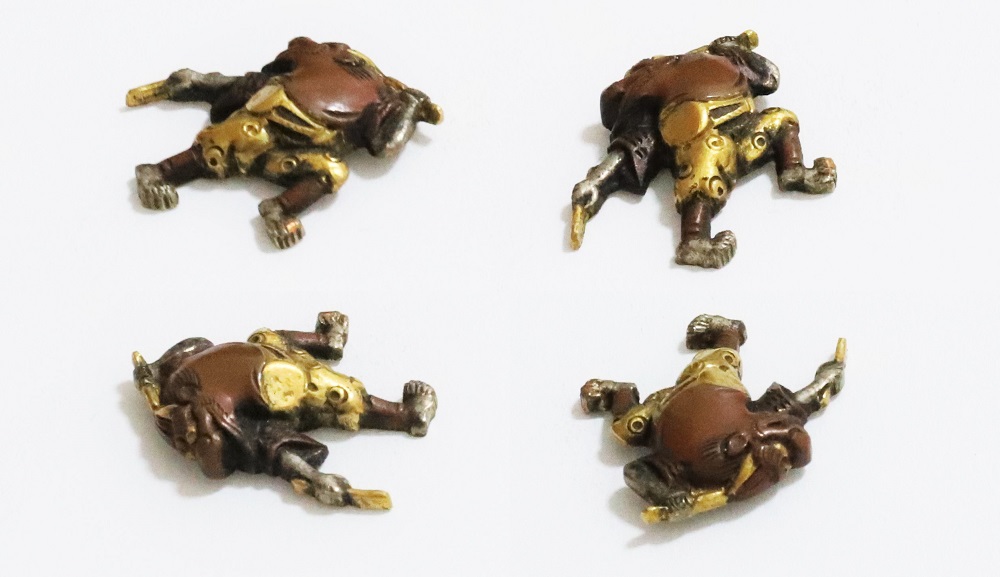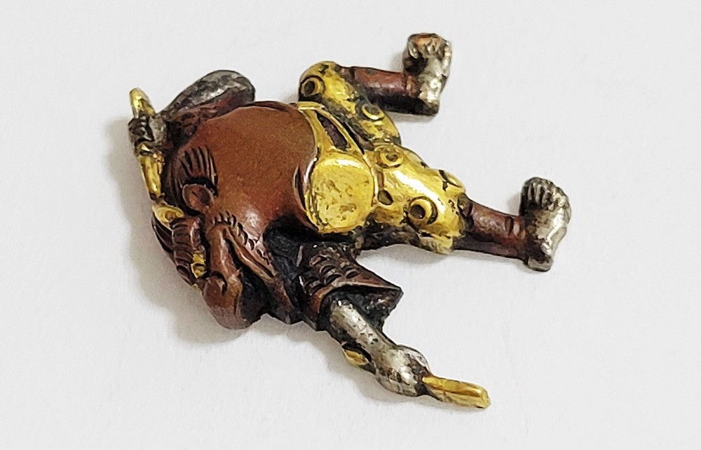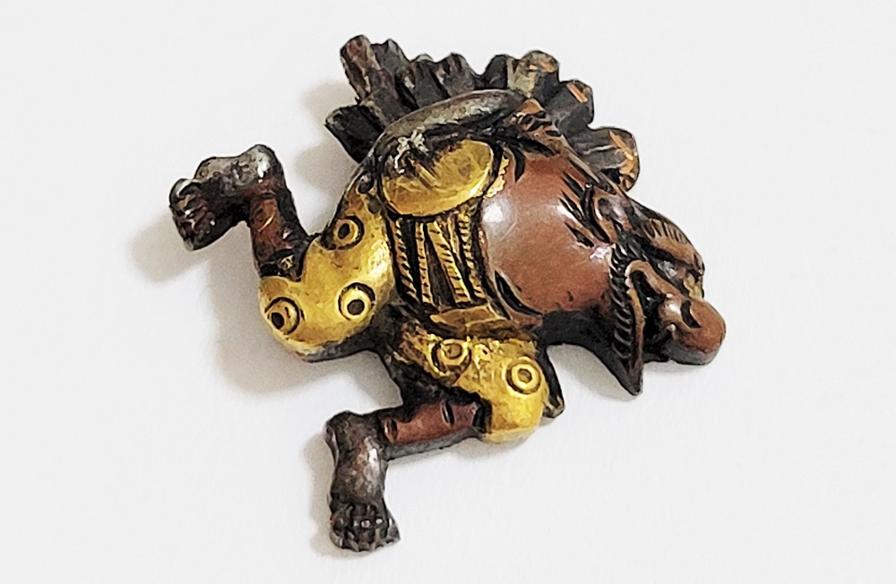 越後獅子は、越後国西蒲原郡月潟村(現新潟市)が発祥の一人立ち獅子舞。家の前で獅子頭(ししがしら)をかぶった子供が、親方の笛・太鼓に合わせて踊りや軽業などを見せ銭を貰う大道芸。江戸中後期に盛んにおこなわれた。本作は小振りの越後獅子図素銅目貫。裏行きに容彫の妙が窺える。
