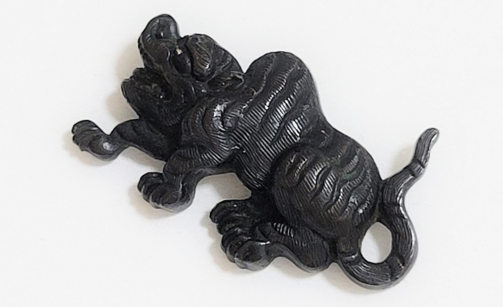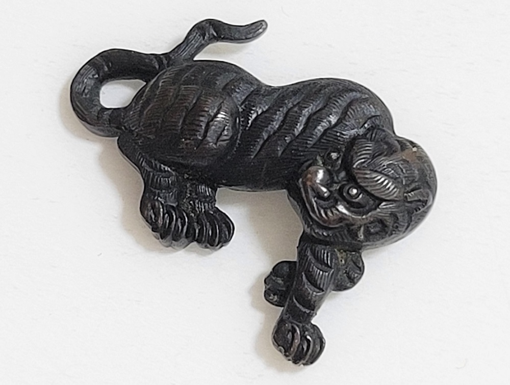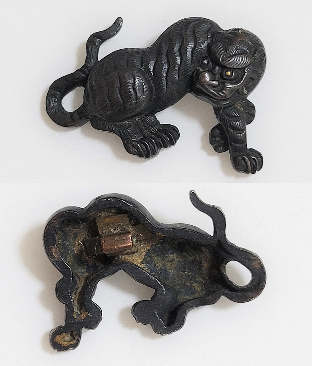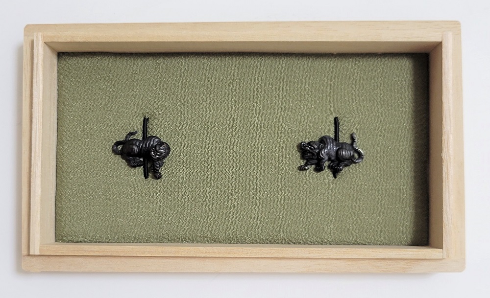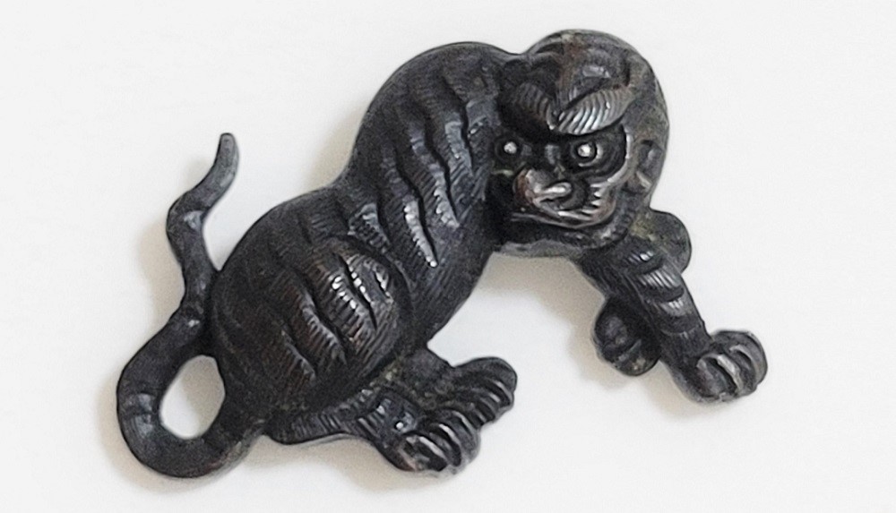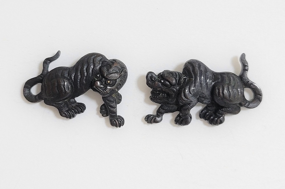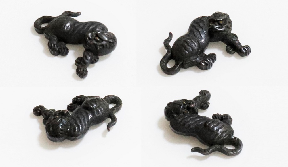 虎は獅子と並んで猛獣の王といわれ、猛虎と表現される。猛々しい姿は威厳と強さを示し刀装具に用いられた。本作は丹念に虎斑を堀込む小形の短刀目貫。