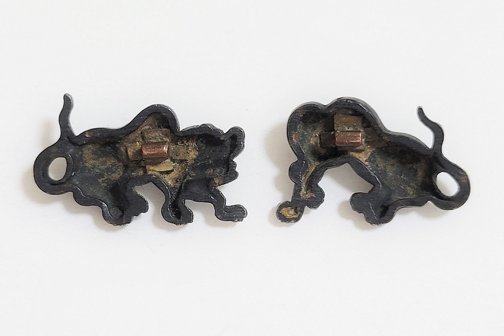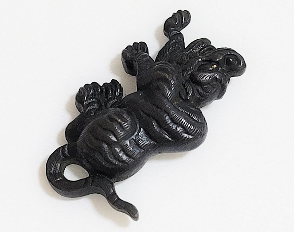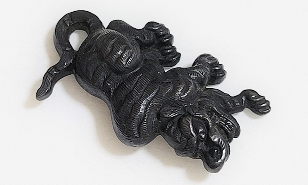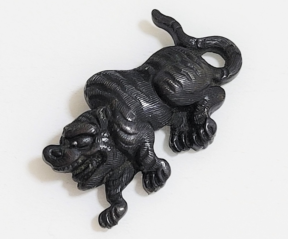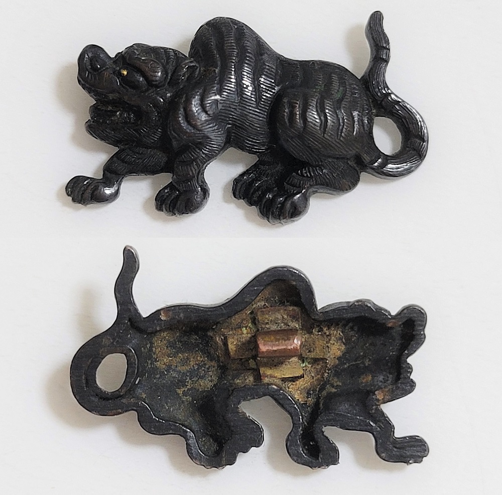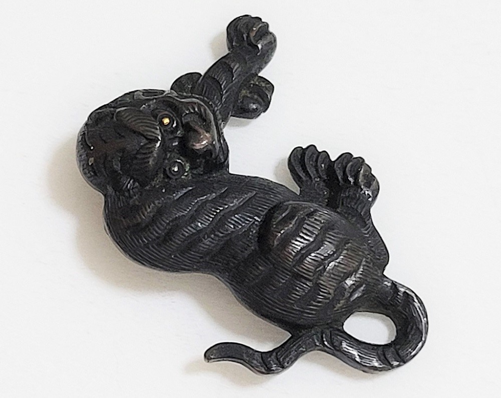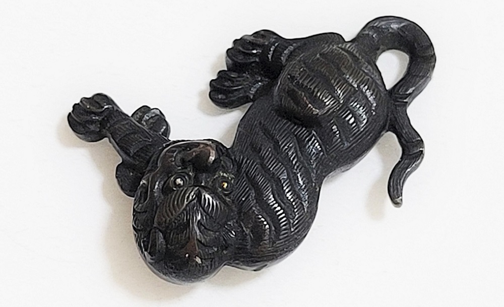 虎は獅子と並んで猛獣の王といわれ、猛虎と表現される。猛々しい姿は威厳と強さを示し刀装具に用いられた。本作は丹念に虎斑を堀込む小形の短刀目貫。