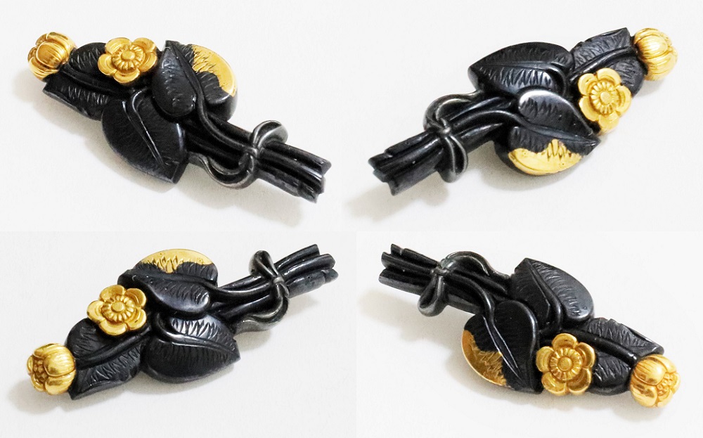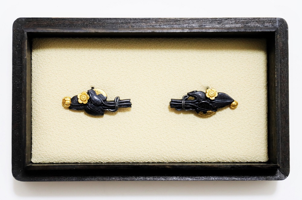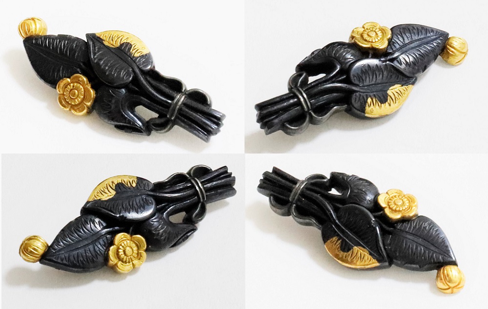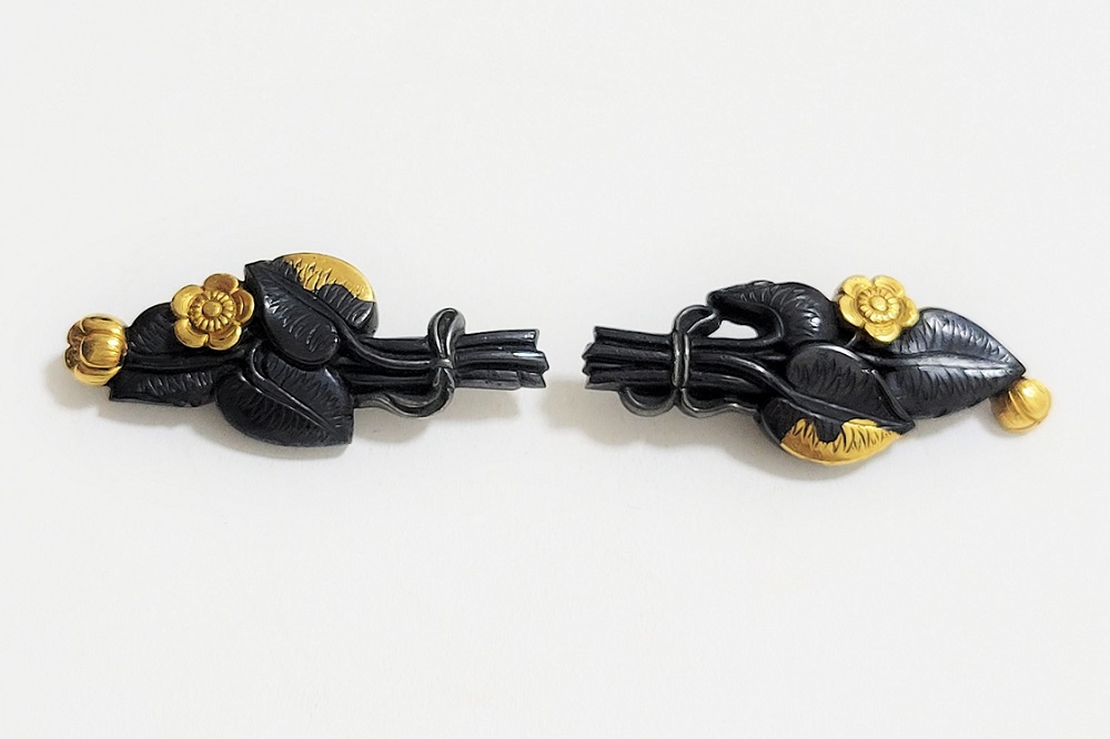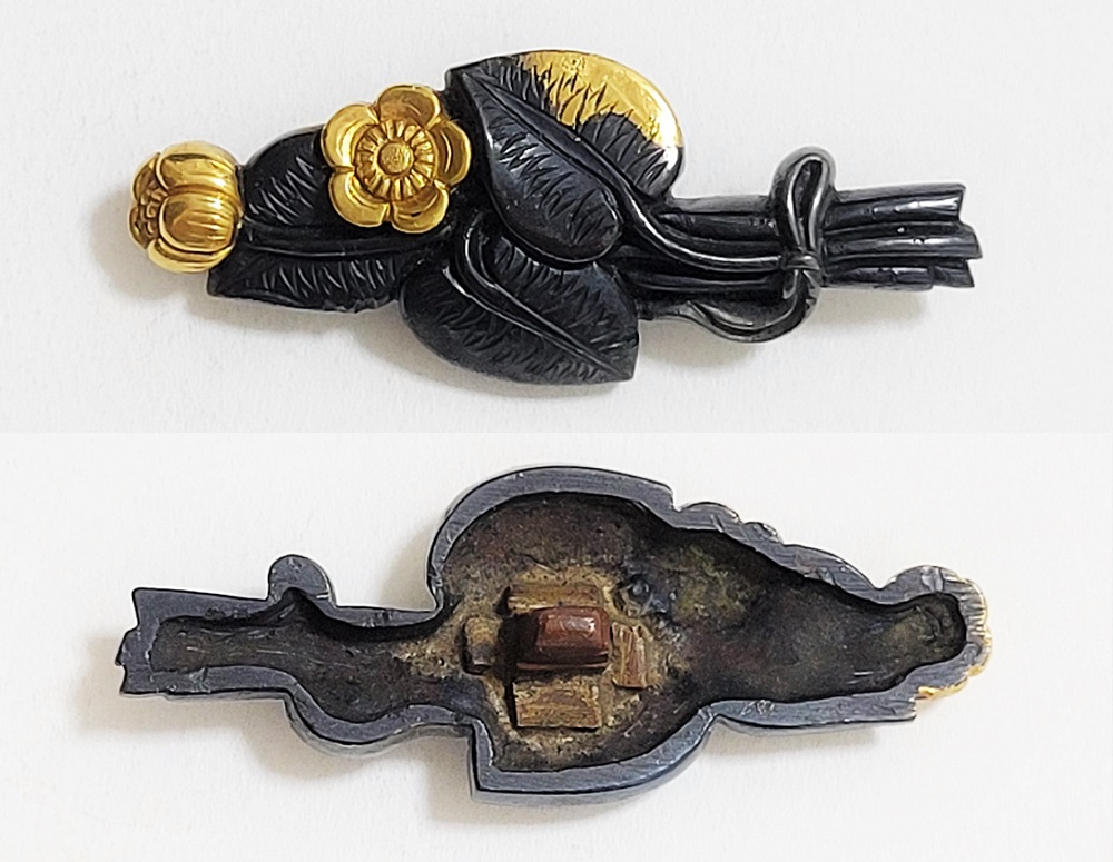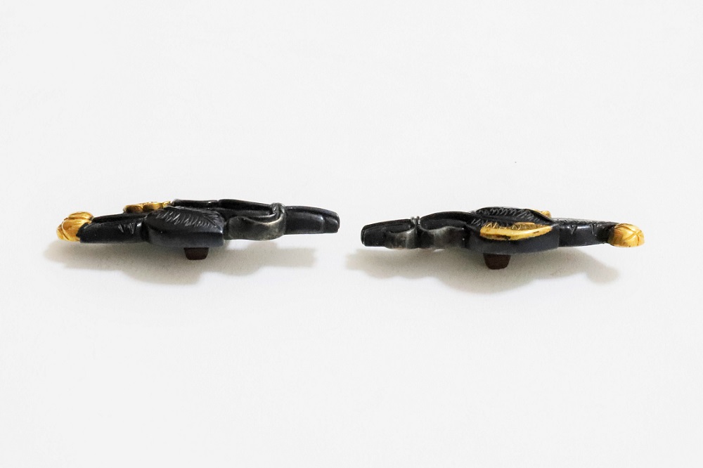 河骨(こうほね)はスイレン科の植物。白い地下茎が骨のように見えることから河骨と名付けられたという。浅い池や沼に自生し夏に花柄を水上に出し長い花茎の先端に黄色い花を咲かせる。本作は河骨の花と葉を束ねた図柄の目貫。上質の赤銅を用いて金色絵が効果的に施されている。