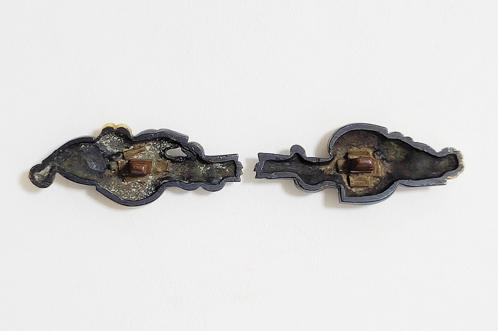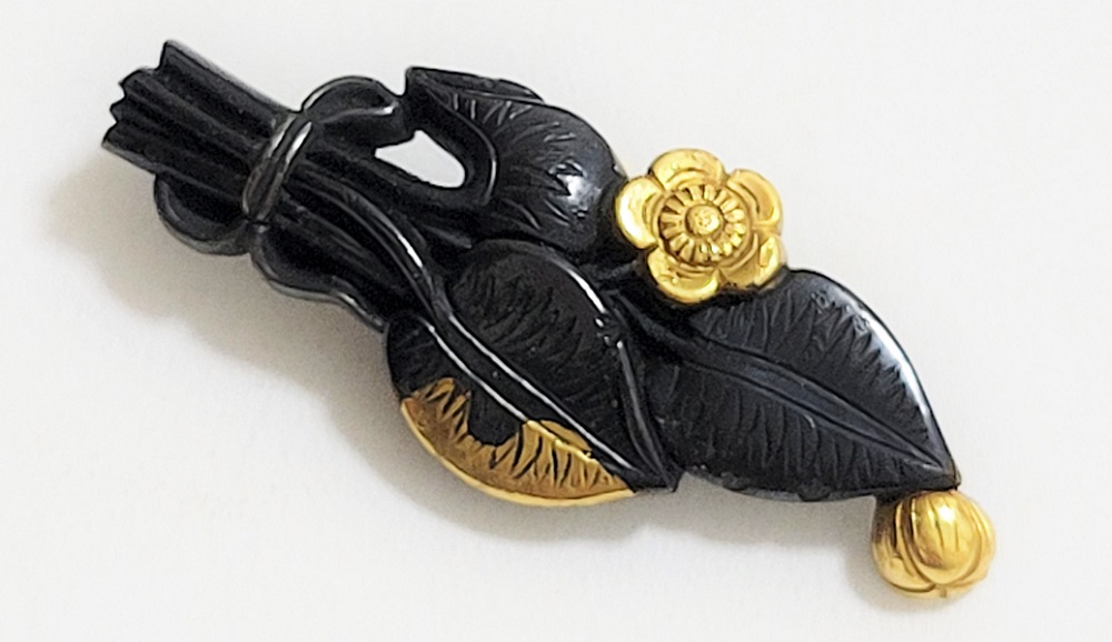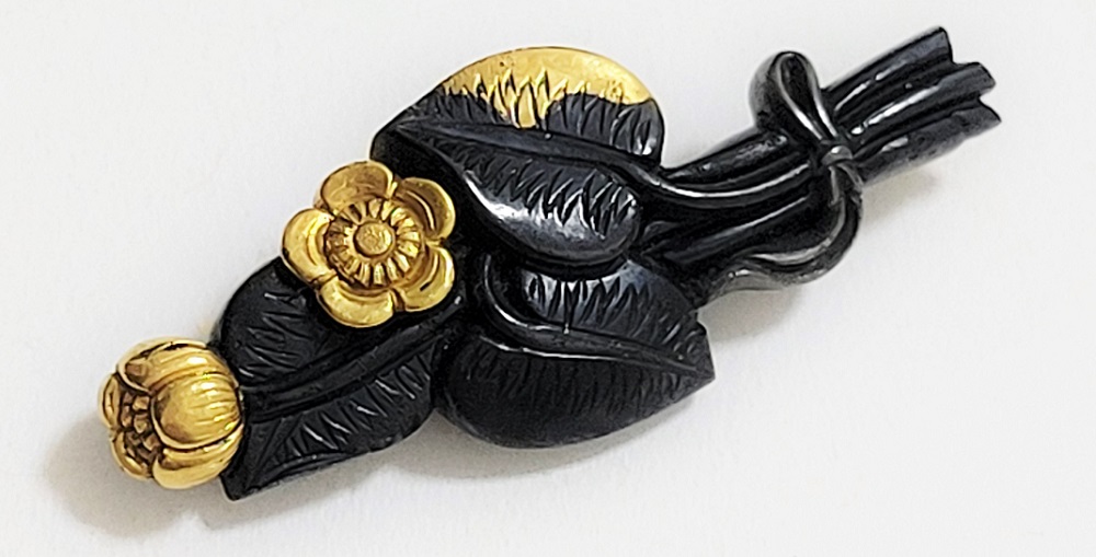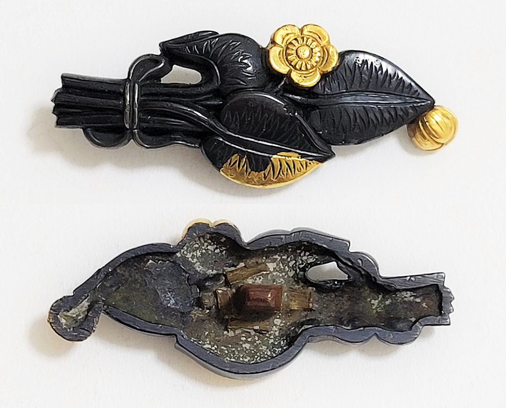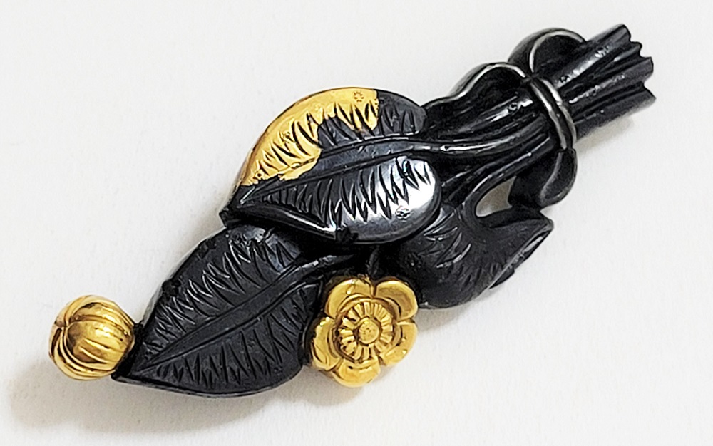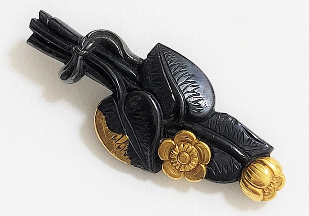 河骨(こうほね)はスイレン科の植物。白い地下茎が骨のように見えることから河骨と名付けられたという。浅い池や沼に自生し夏に花柄を水上に出し長い花茎の先端に黄色い花を咲かせる。本作は河骨の花と葉を束ねた図柄の目貫。上質の赤銅を用いて金色絵が効果的に施されている。