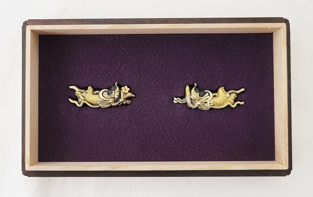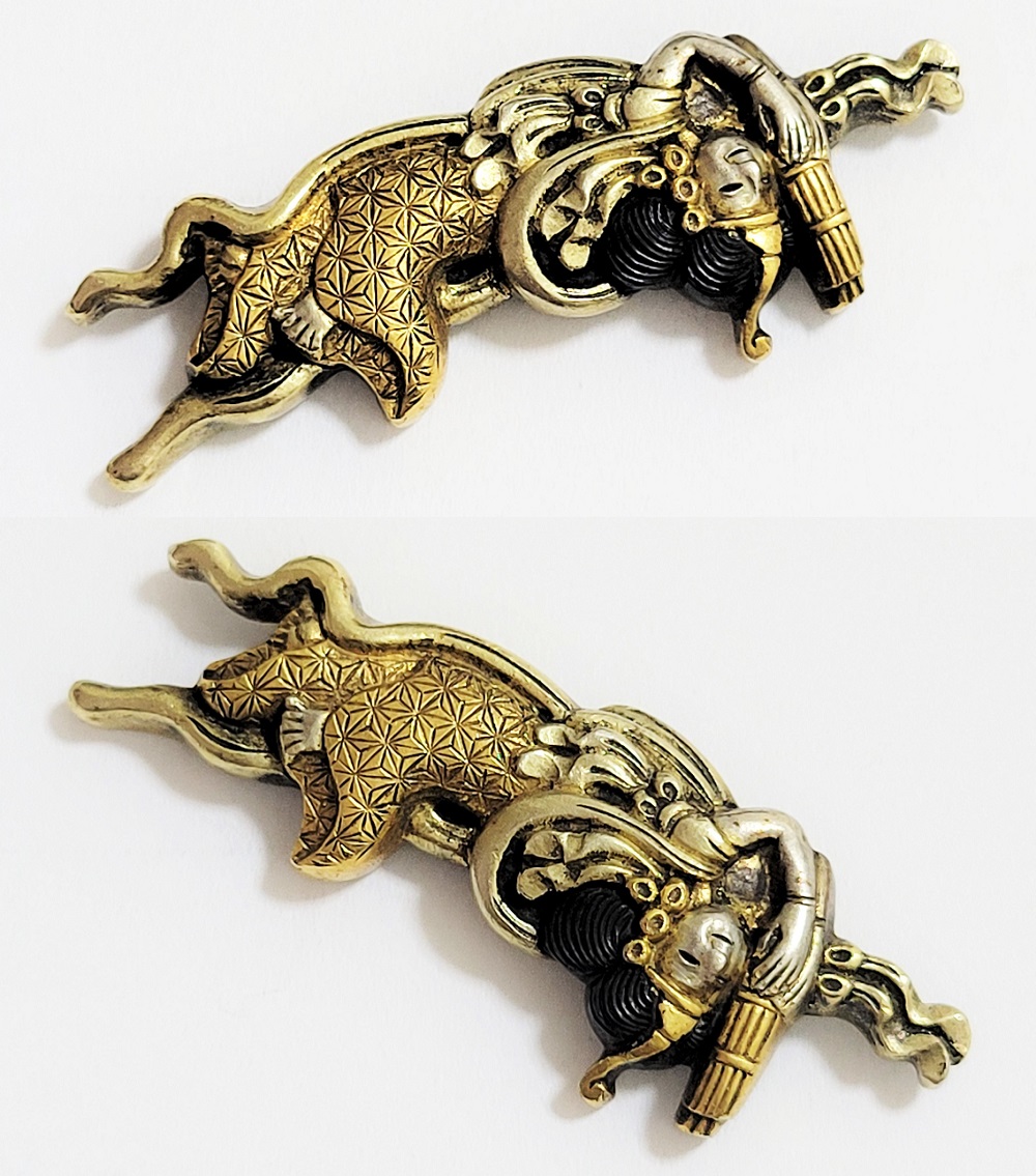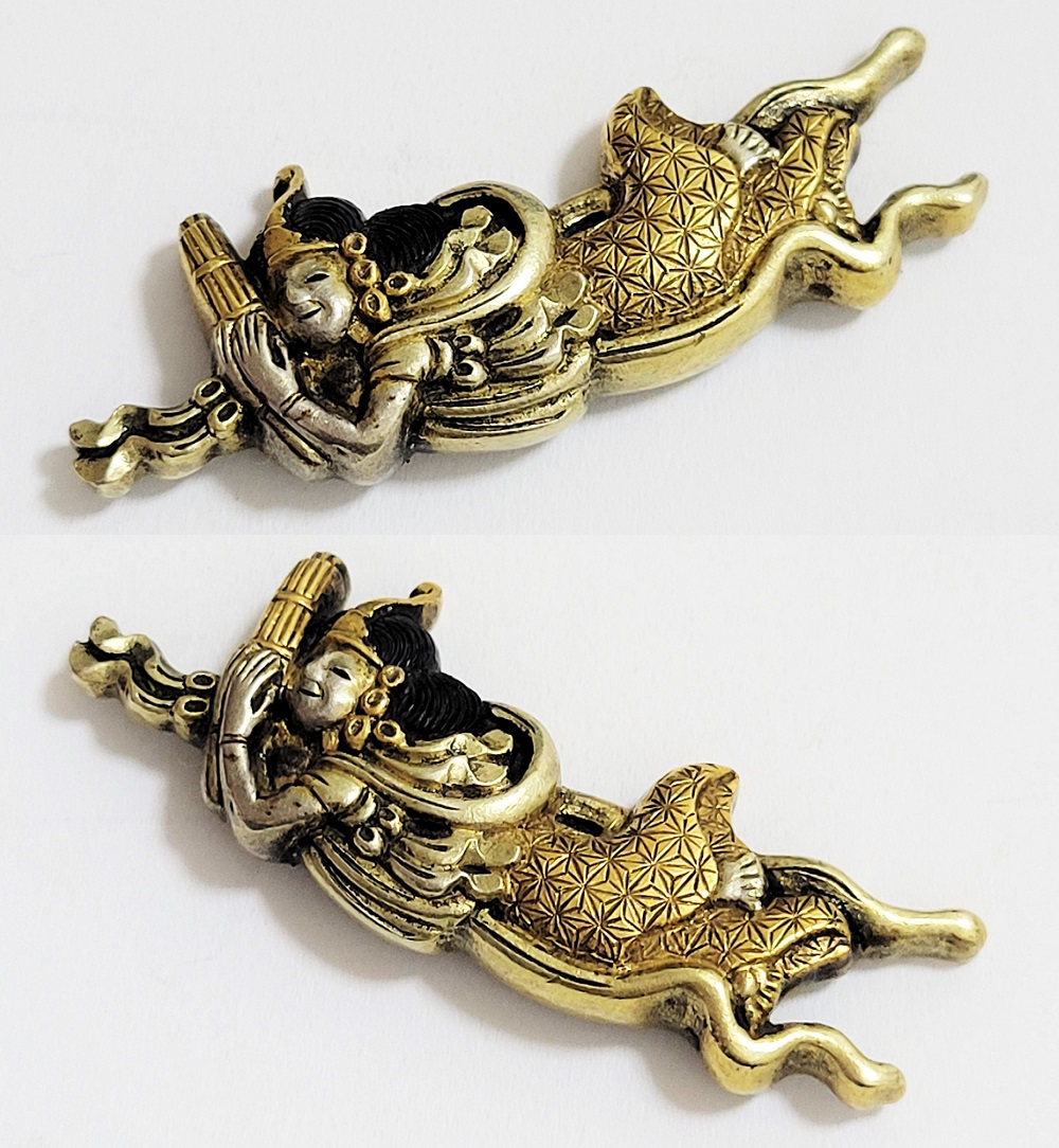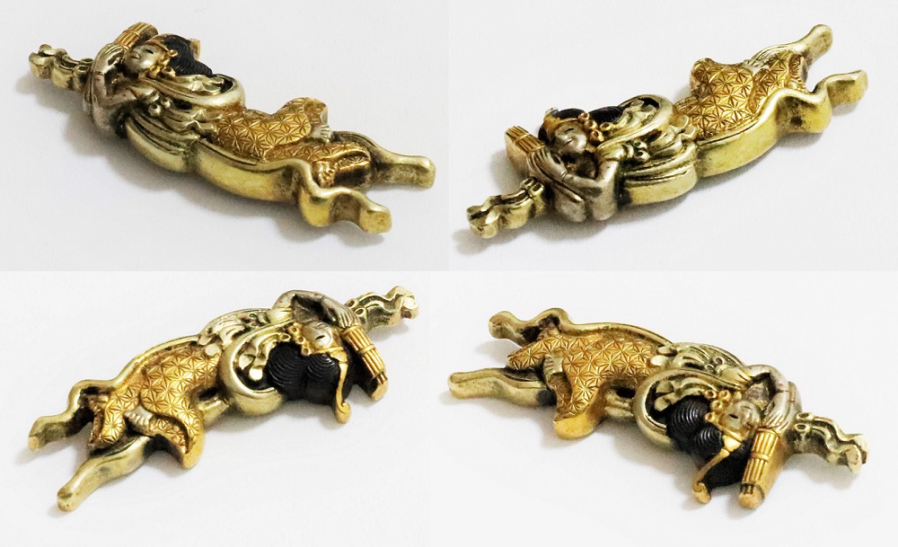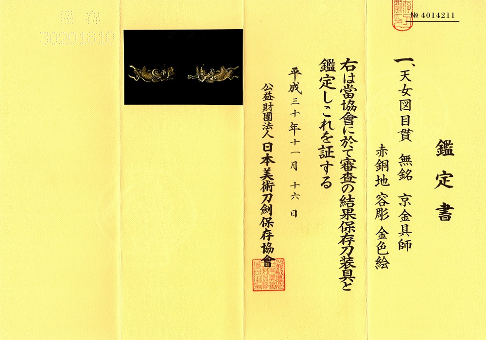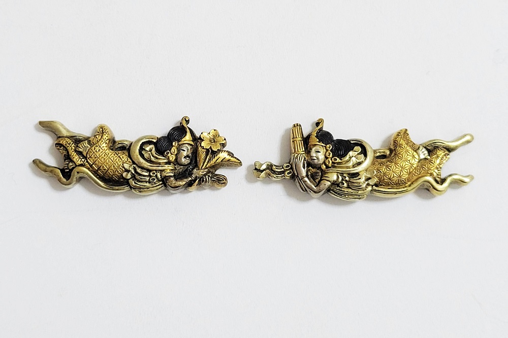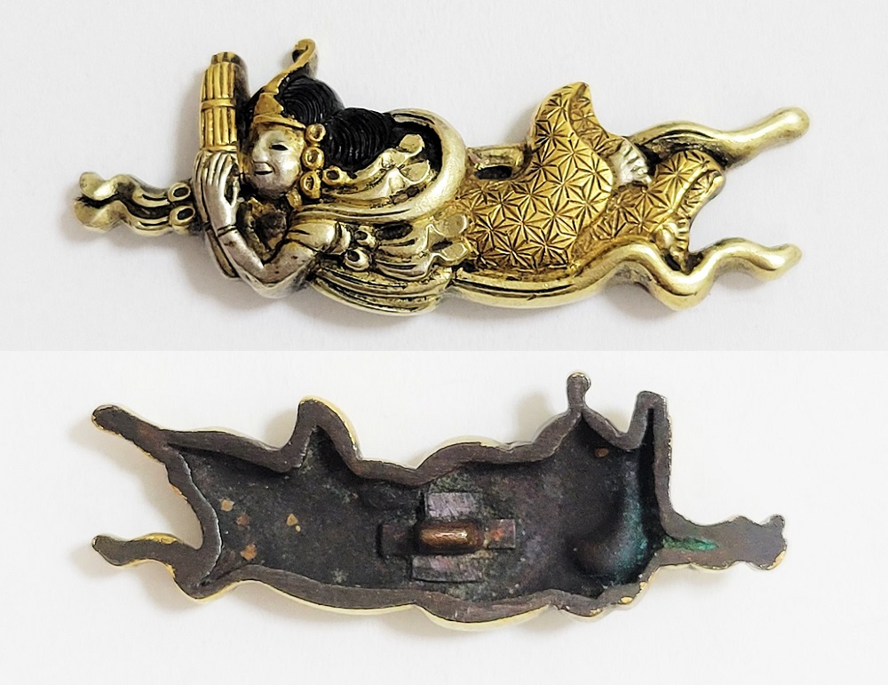 | 飛天(ひてん)は、阿弥陀仏など本尊の周囲を優雅に飛びながら舞い、花を散らし楽を奏し香を薫じるなどして仏を守りたたえる天人・天女のこと。中国では敦煌や雲崗の石窟寺院において、日本では法隆寺金堂壁画や平等院鳳凰堂後背、法界寺阿弥陀堂壁画などにその優美な姿を見せている。本作は天女図、京金具師と極められ2018年保存刀装具審査合格。 |